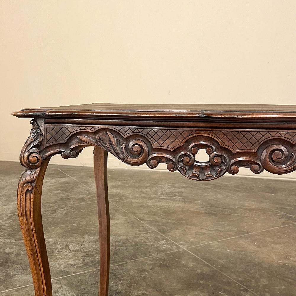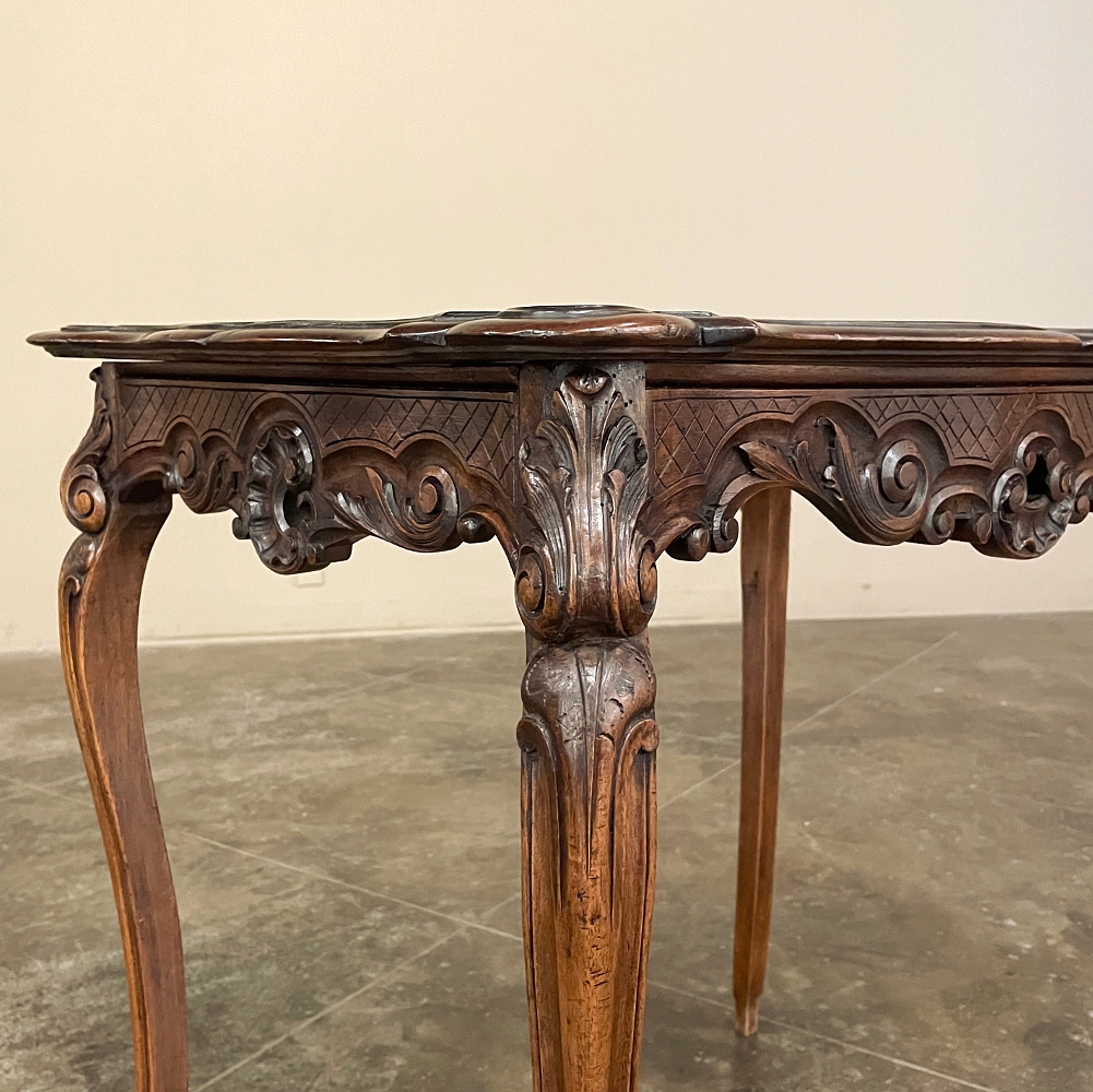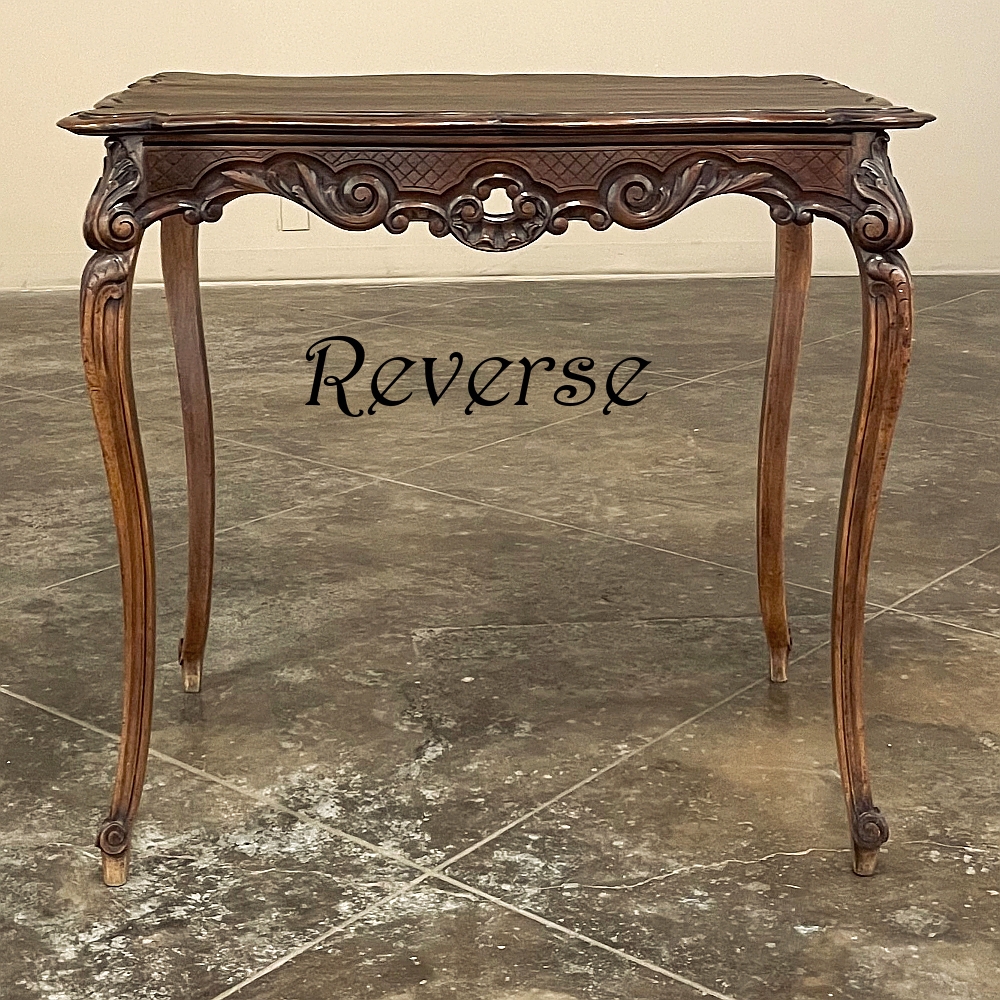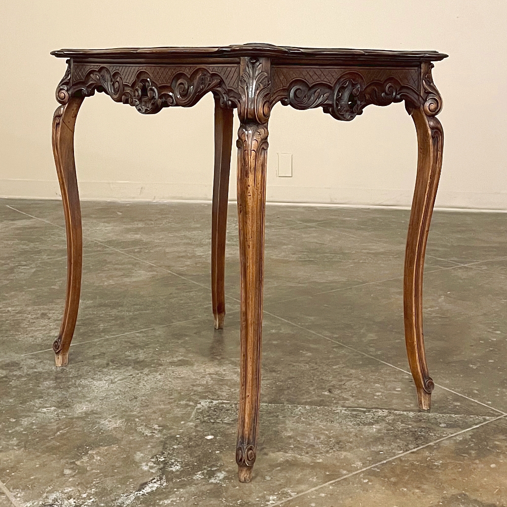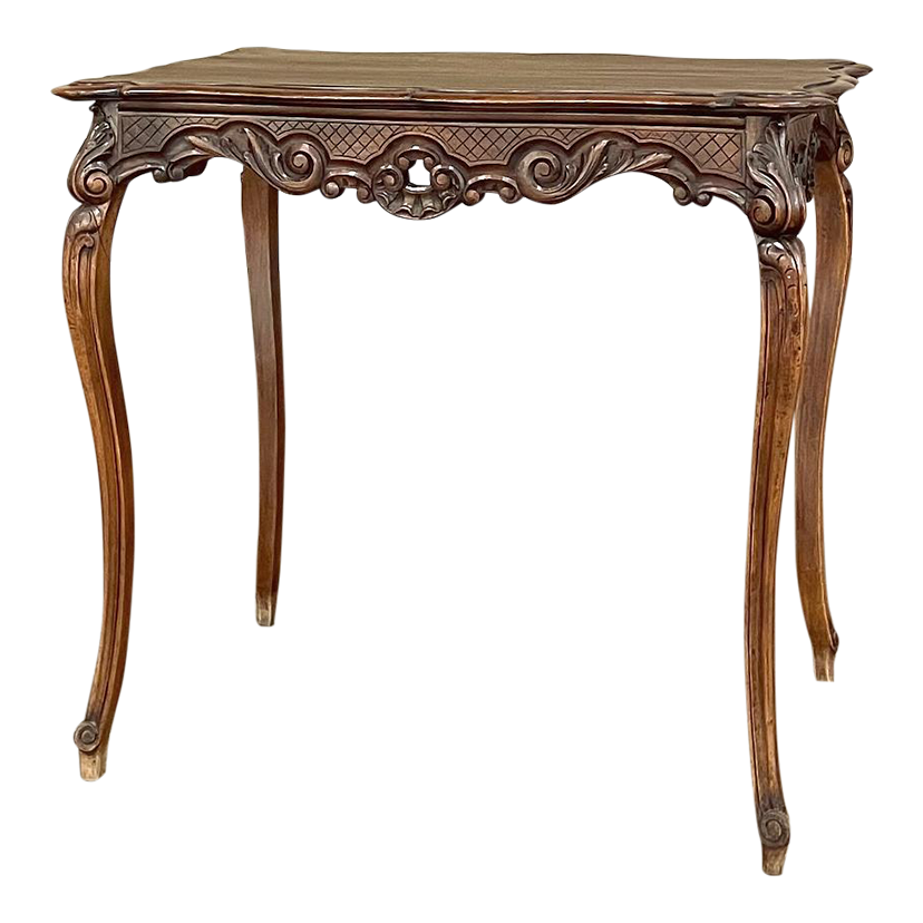19th Century French Regence Walnut End Table ~ Side Table is a perfect example of the style transition that occurred between the Louis XIV and the Louis XV styles. Bold, naturalistic carved detail abounds on all four sides of the apron, including a pierce-carved centerpiece, with stylized shell and foliates comprising the theme, surrounded by cross hatching. Each of the four graceful cabriole legs sports an upturned acanthus plume where the leg joins with the apron creating a corbel effect, with the lower extremity of the leg elegantly scrolling outward down to the floor were escargot tips have been carved. The top has been given an elaborate contour and double beveled edge to complete the look.
