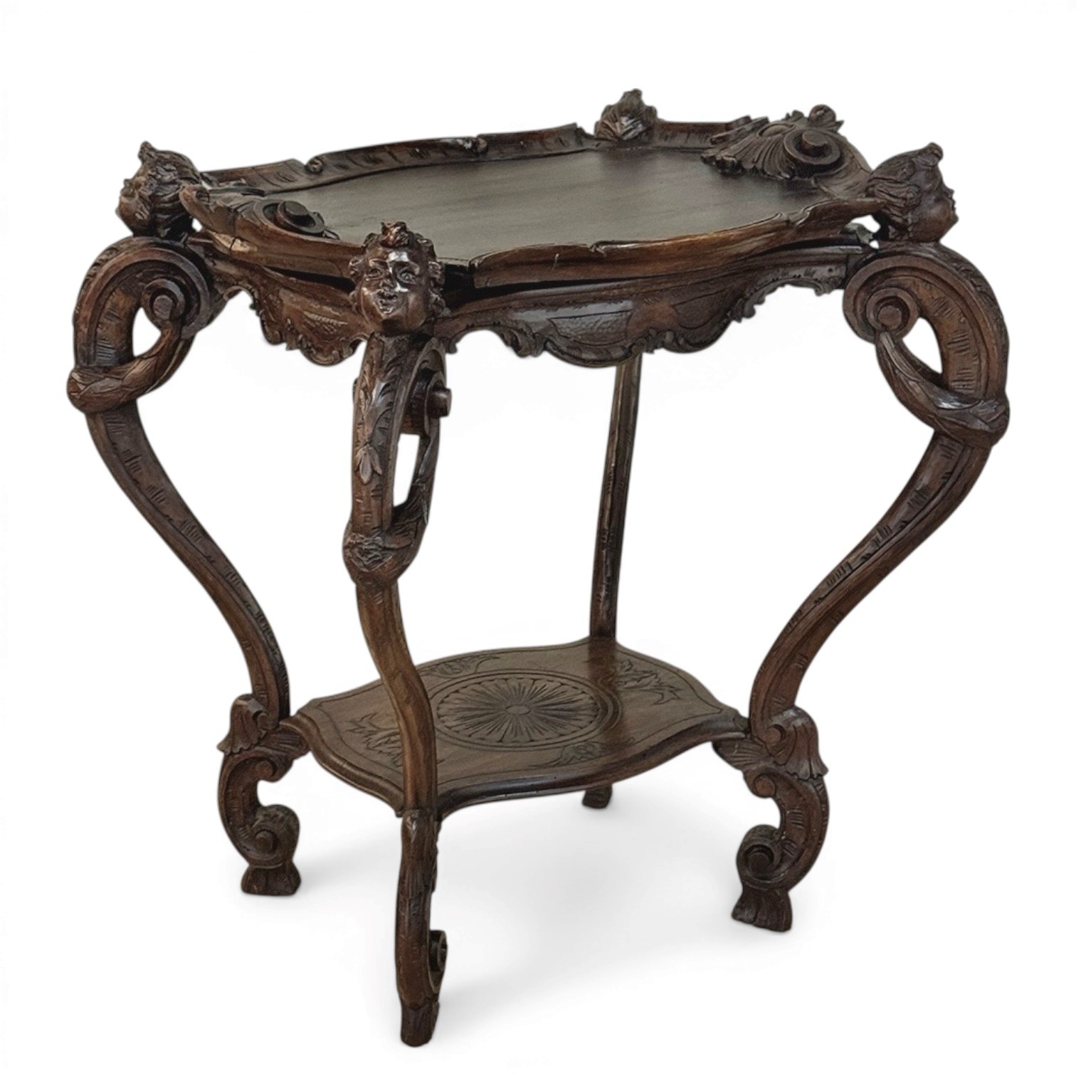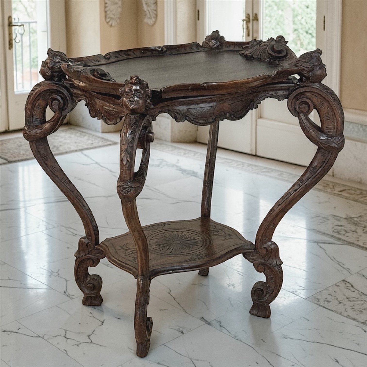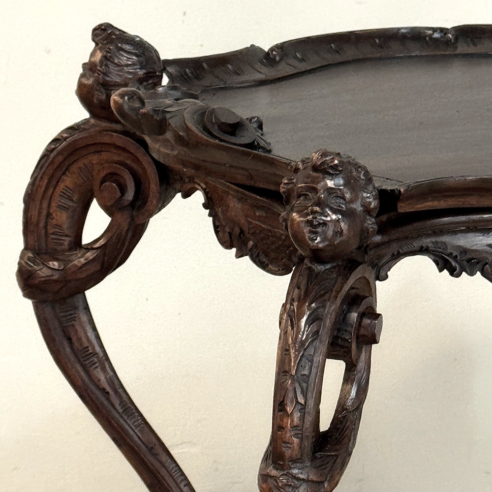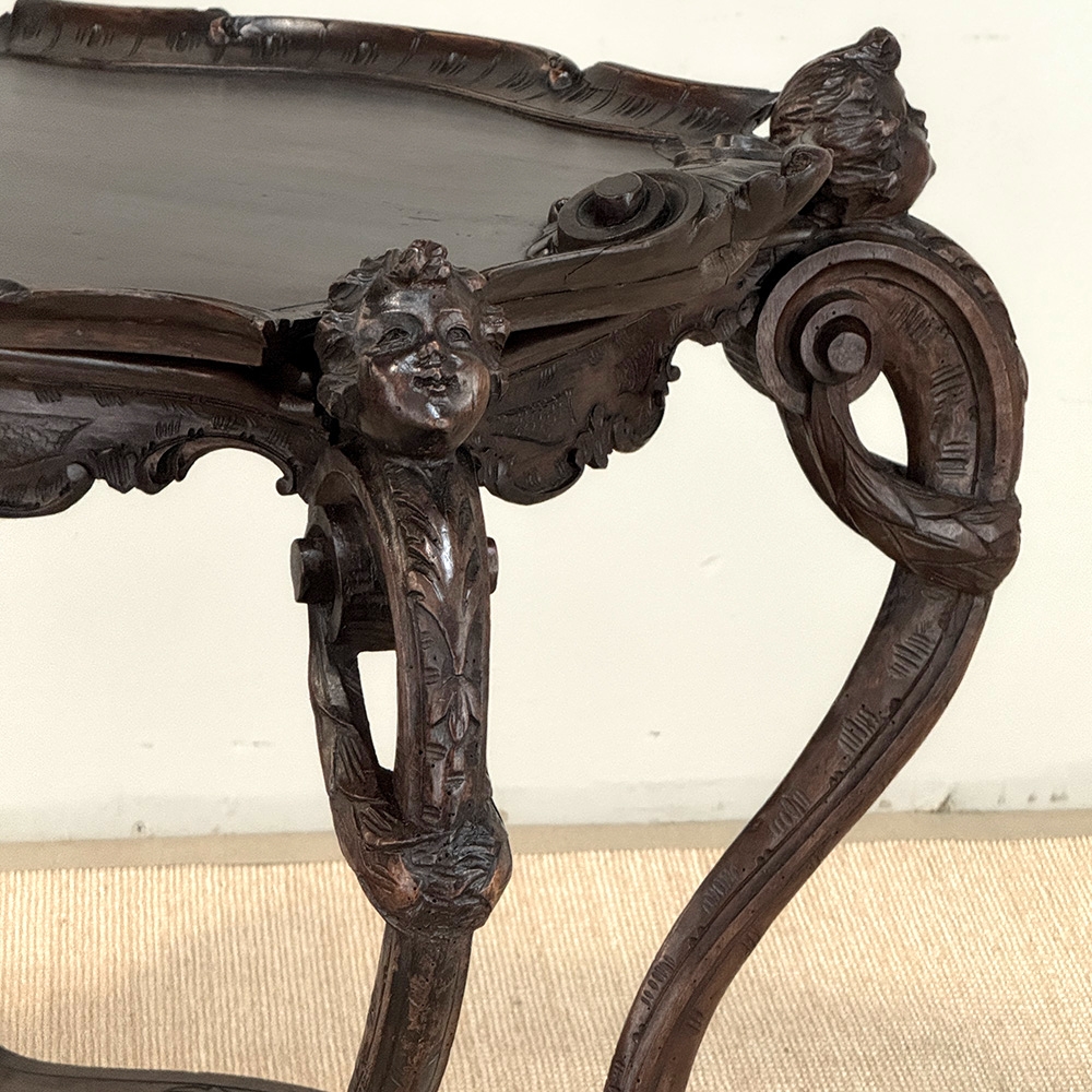 The removable tray top is framed by a delicately carved gallery, adorned with finely rendered motifs and supported by gracefully scrolled legs. Each leg is accented with carved putti, lending a sense of life and narrative to the composition—an unmistakable hallmark of Italian decorative tradition. Beneath, the carved structure continues with fluid lines and an elegantly shaped lower tier, centered with a rosette motif that echoes the artistry above.