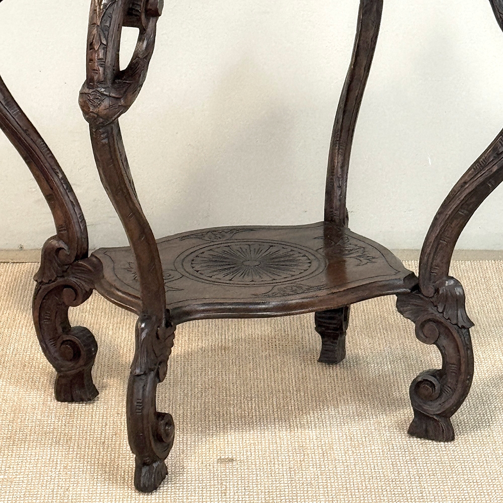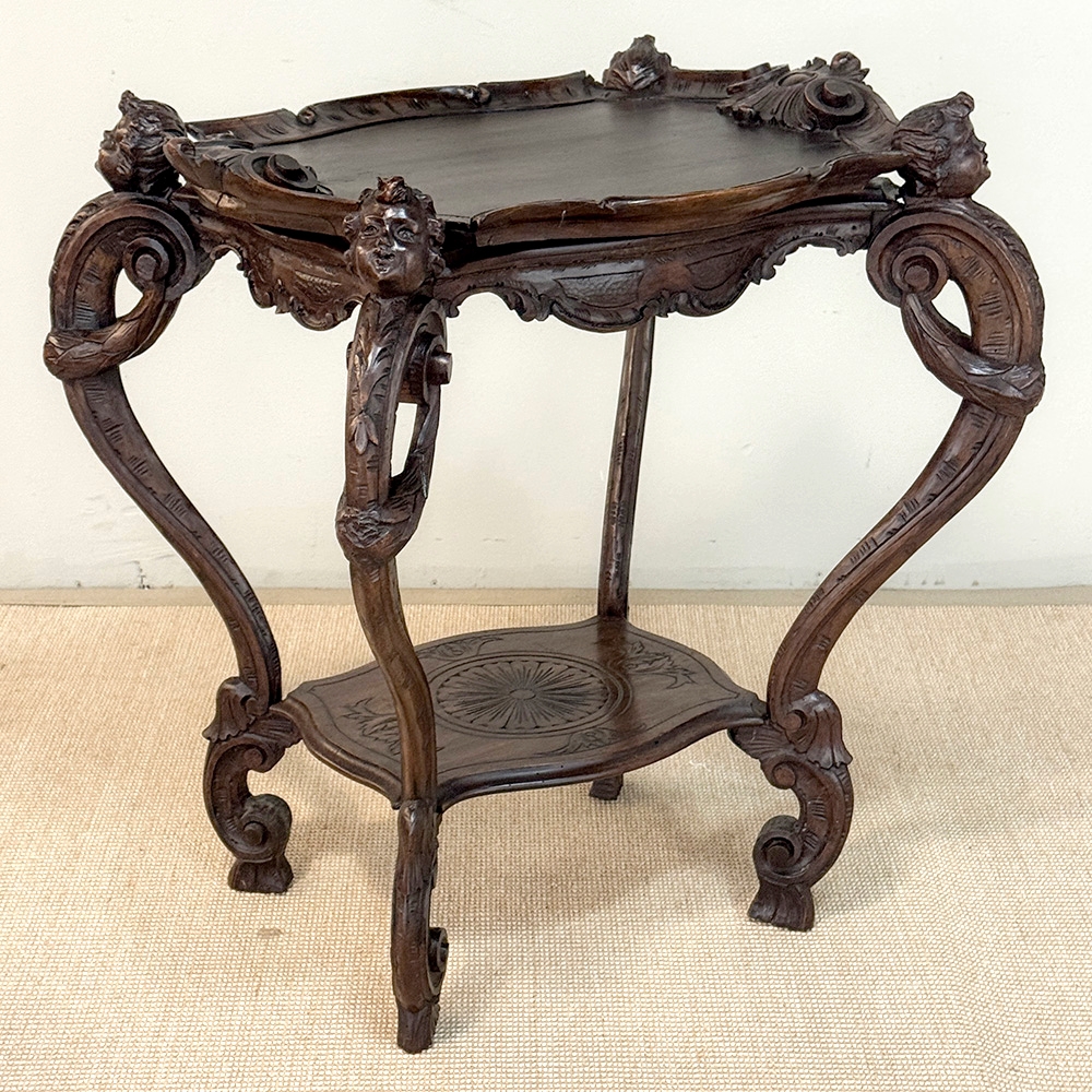A captivating example of Italian artistry in furniture, this 19th century end table is conceived as both functional piece and sculptural statement. Hand-carved from richly toned walnut, the design flows with remarkable movement, each curve and contour shaped with an expressive, almost theatrical quality that defines Italian craftsmanship of the period.
