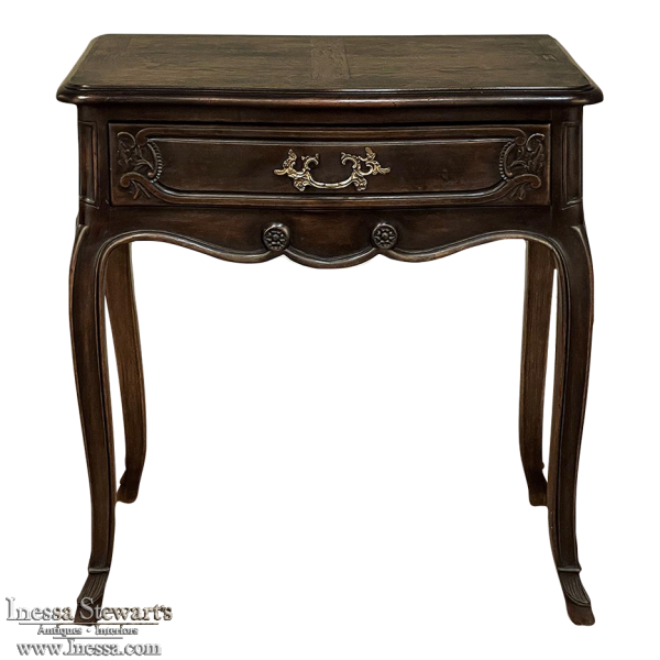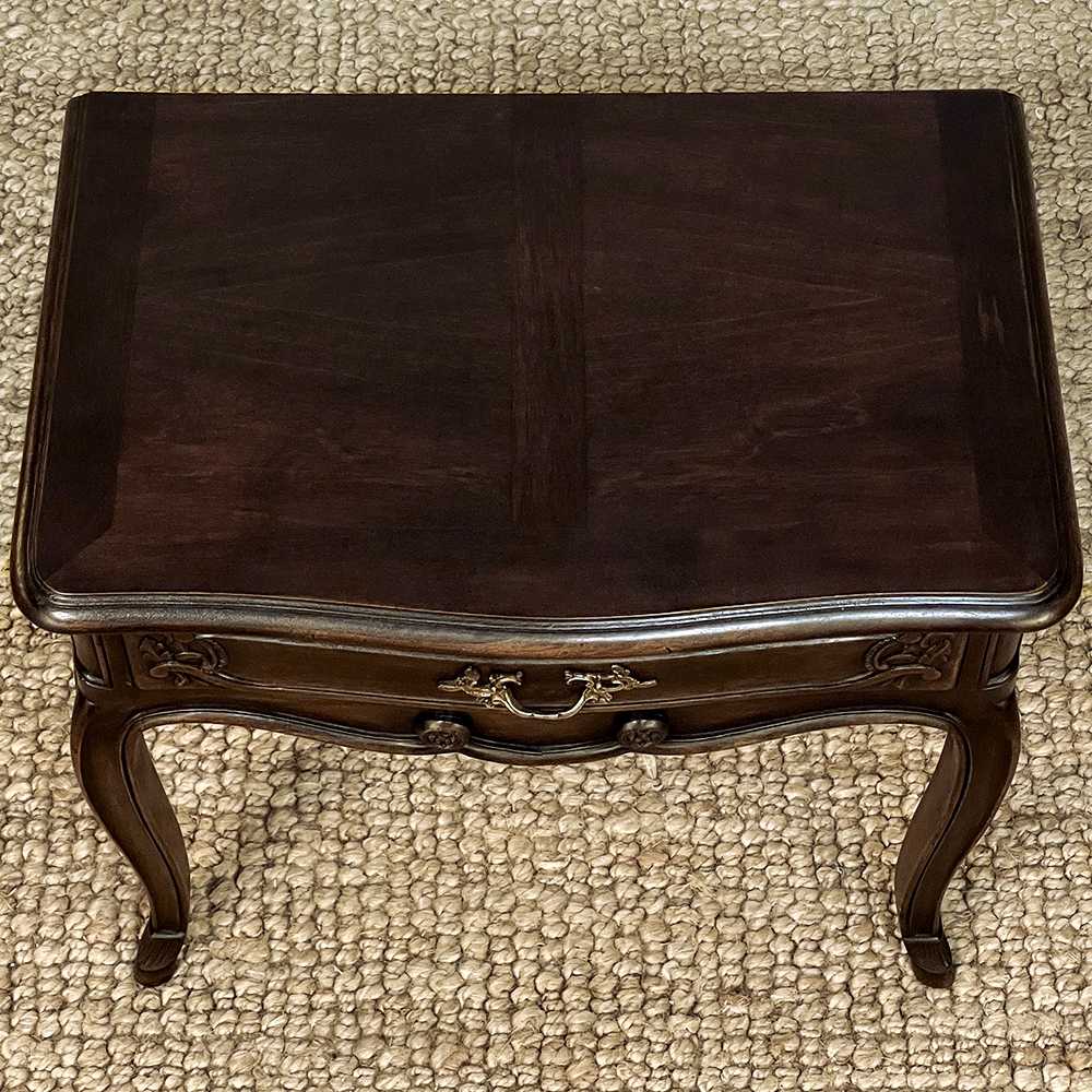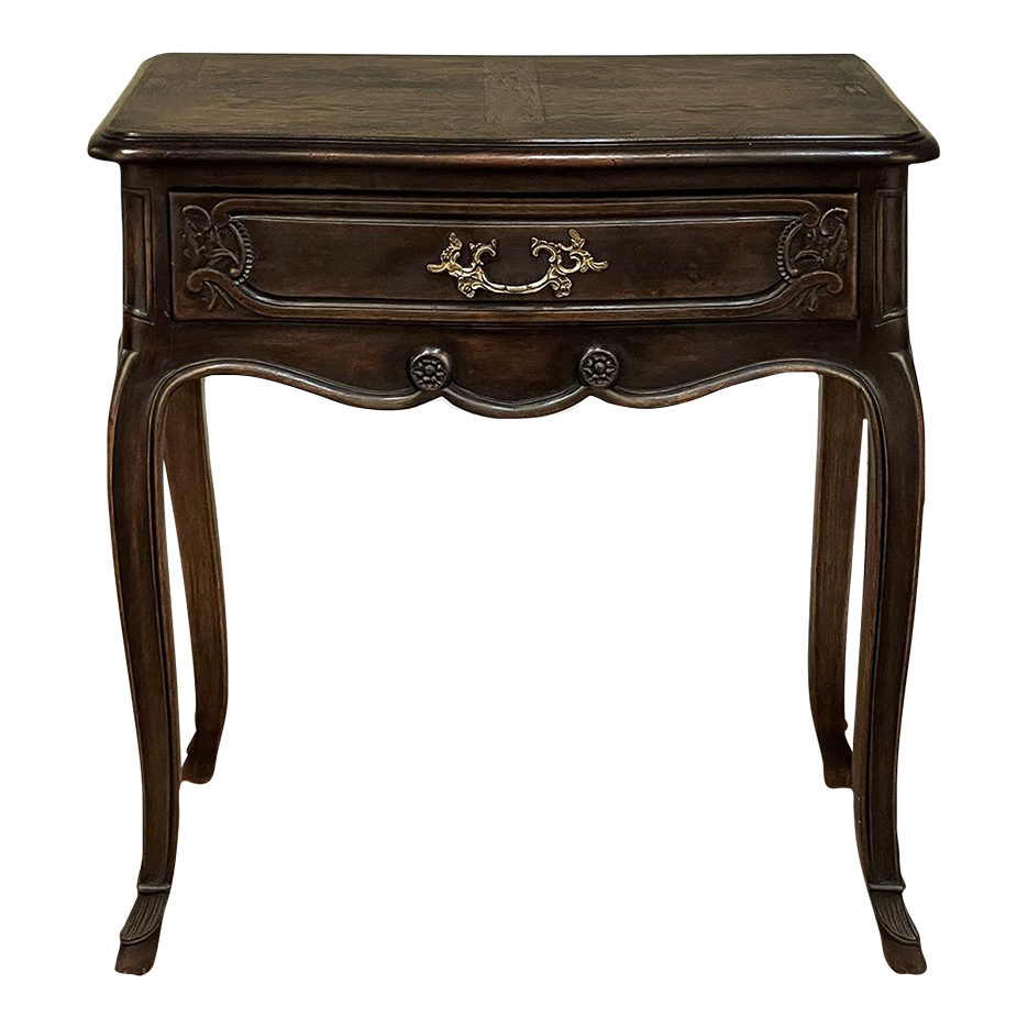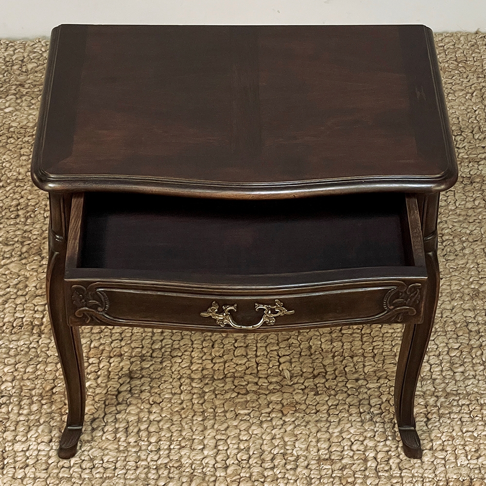 Antique Country French Louis XV Walnut Nightstand ~ End Table will make the perfect accompaniment to any seating group, reading area, wall accent, or as a bedside companion. Crafted from fine French walnut, it features a graceful contour with a subtly bowed front facade, starting with the double beveled top. Four cabriole legs provide support, with very subtly scrolled side aprons and a front apron with elegant scrolls with rosettes that complement the subtle carved detail on the drawer facade which features hints of olive branches and scallop shell. A beautifully cast brass Rococo style drawer pull provides access to the surprisingly spacious storage within.