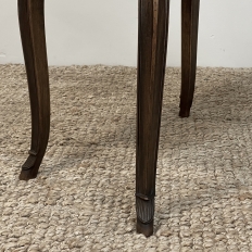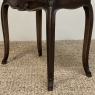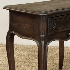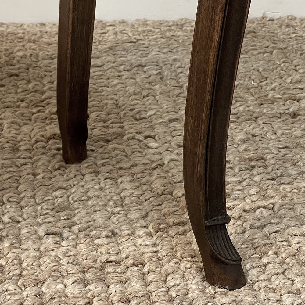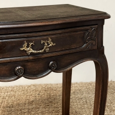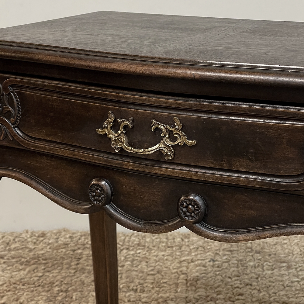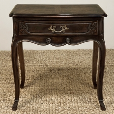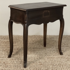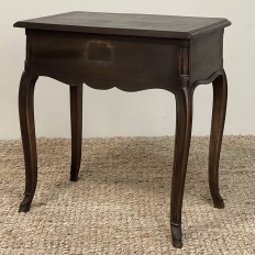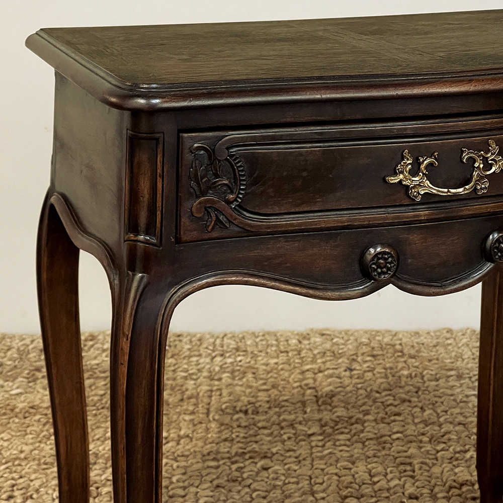 Antique Country French Louis XV Walnut Nightstand ~ End Table will make the perfect accompaniment to any seating group, reading area, wall accent, or as a bedside companion. Crafted from fine French walnut, it features a graceful contour with a subtly bowed front facade, starting with the double beveled top. Four cabriole legs provide support, with very subtly scrolled side aprons and a front apron with elegant scrolls with rosettes that complement the subtle carved detail on the drawer facade which features hints of olive branches and scallop shell. A beautifully cast brass Rococo style drawer pull provides access to the surprisingly spacious storage within.