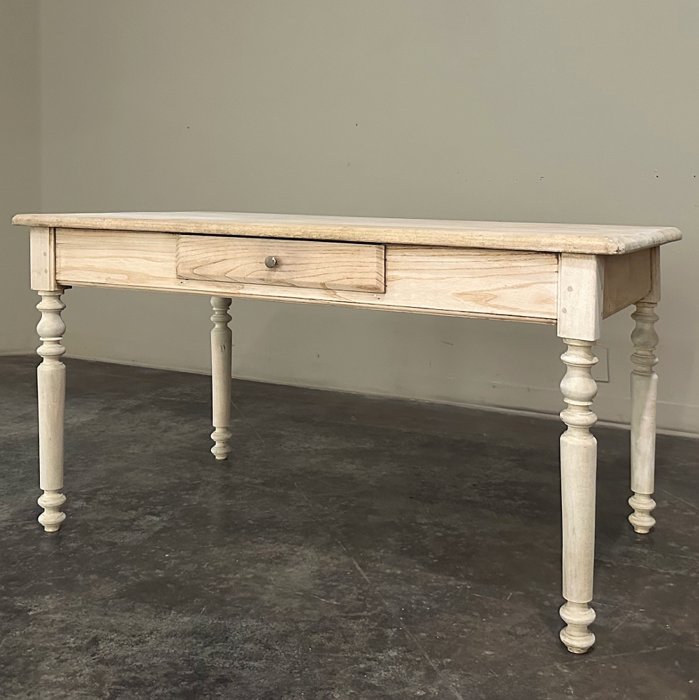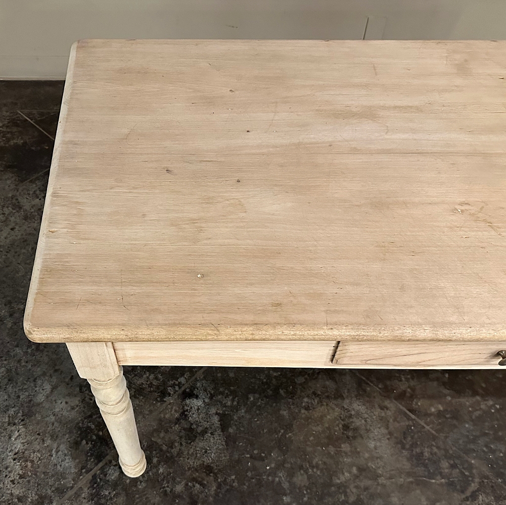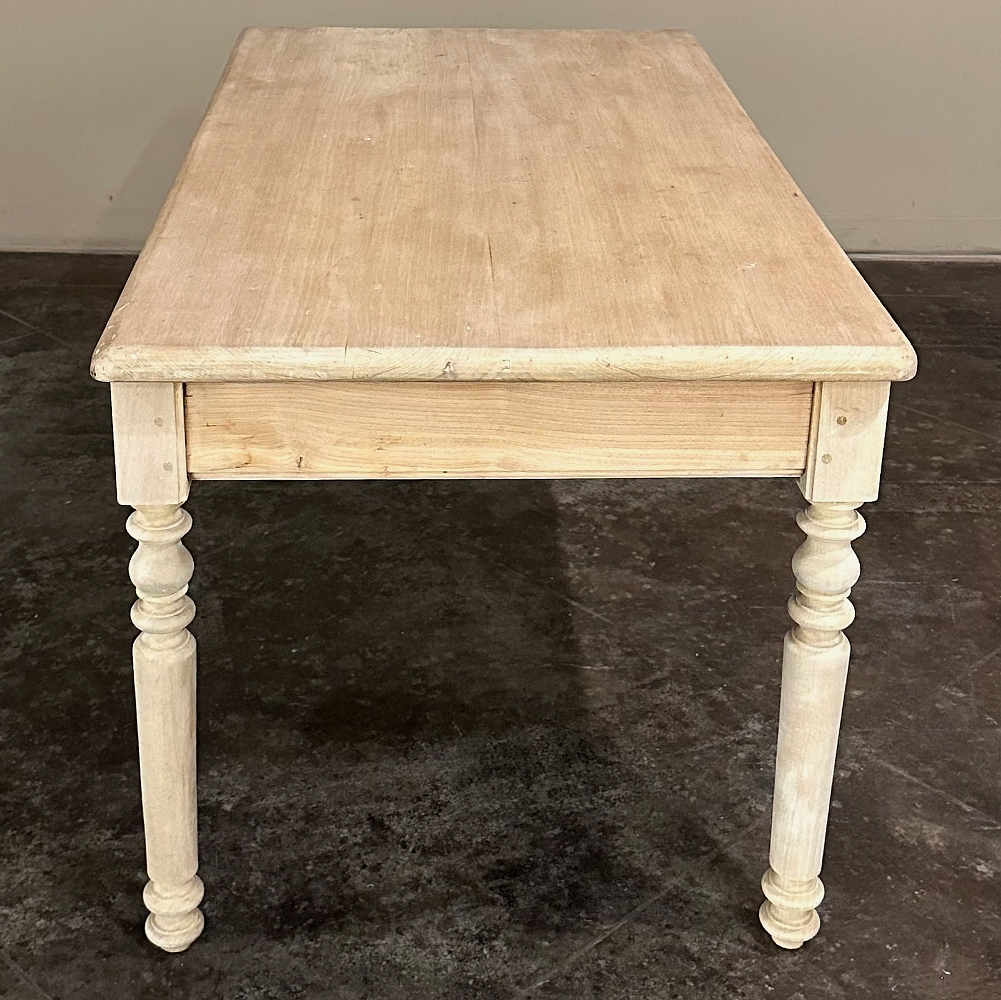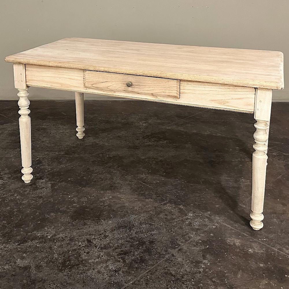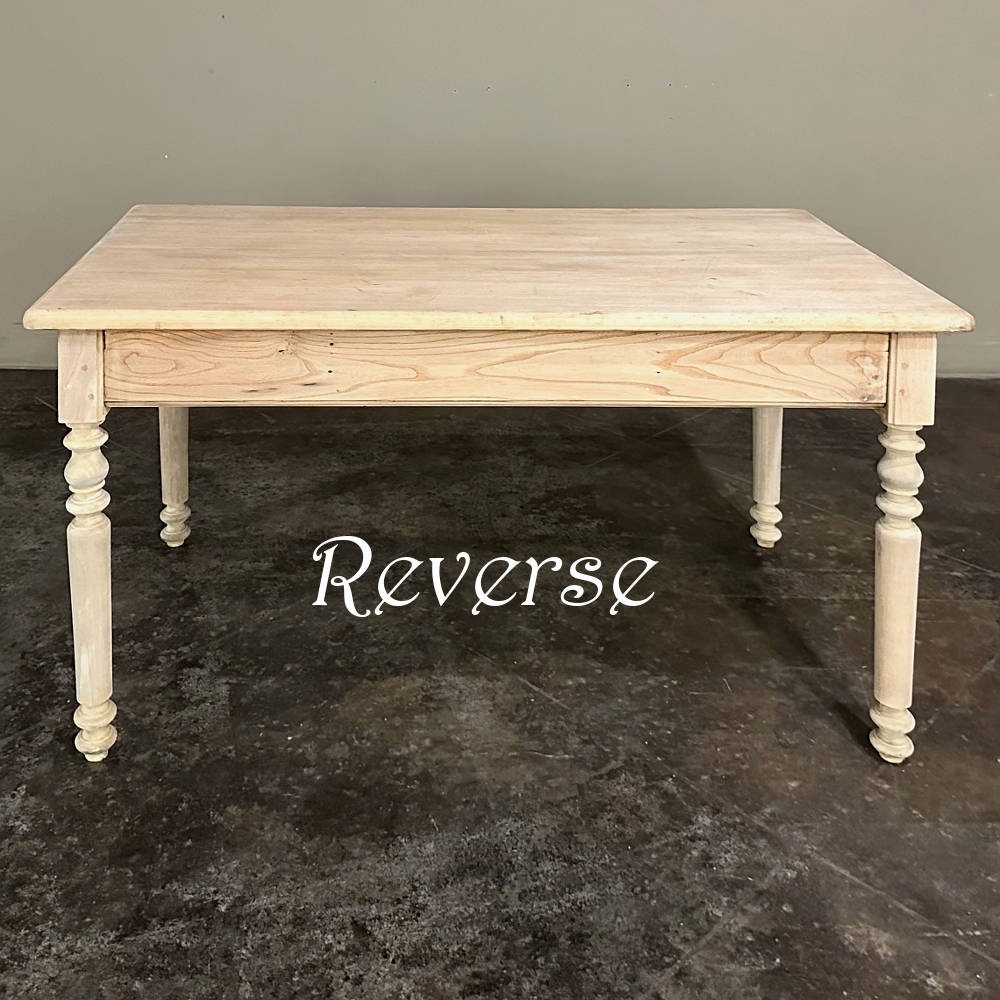 Antique Country French Oak End Table ~ Library Table is finished on all four sides making it a great choice for the center of the room. Sturdy double-pegged, mortise & tenon joinery ensures multiple generations of enjoyment. The single, centered drawer adds a nice convenience, accessed with a brass knob. Rustic Antique Oak farm style table from Lyon, France is a gorgeous maple was used in its construction which includes a solid plank top, making this antique furniture an extra special piece! The stripped finish is ideal for today's casual decors.