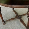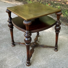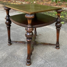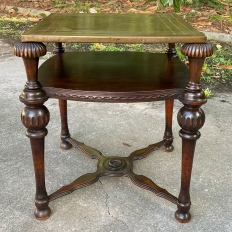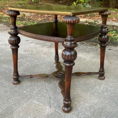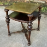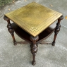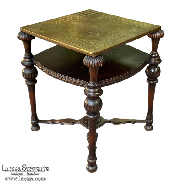 SaleAntique English Walnut End Table with Brass Top is a visually interesting design, with a square top covered with hammered and engraved brass creating a 24" x 24" square surface. The framework below, crafted from fine walnut, consists of four exquisitely turned and carved column legs which extend outwards from the brass top a bit on each corner, and are connected to the top, via contoured and molded stretchers below, and with a shelf that features subtly rounded edges carved with a variation of Greek coin molding. Ideal for placement anywhere in the room, it combines the carefree and spacious four square foot top with rounded corners thanks to the leg design making it both efficient and space-friendly!