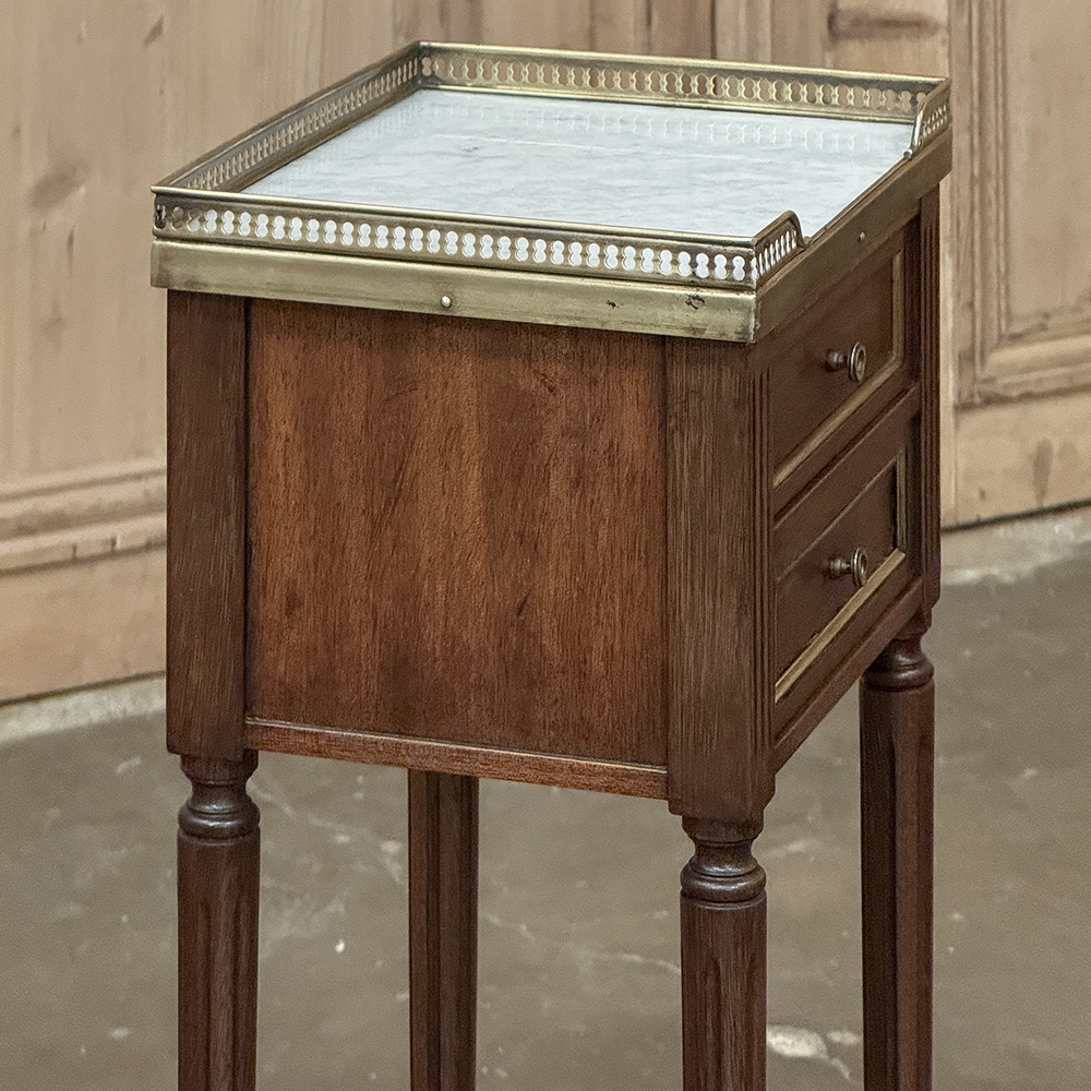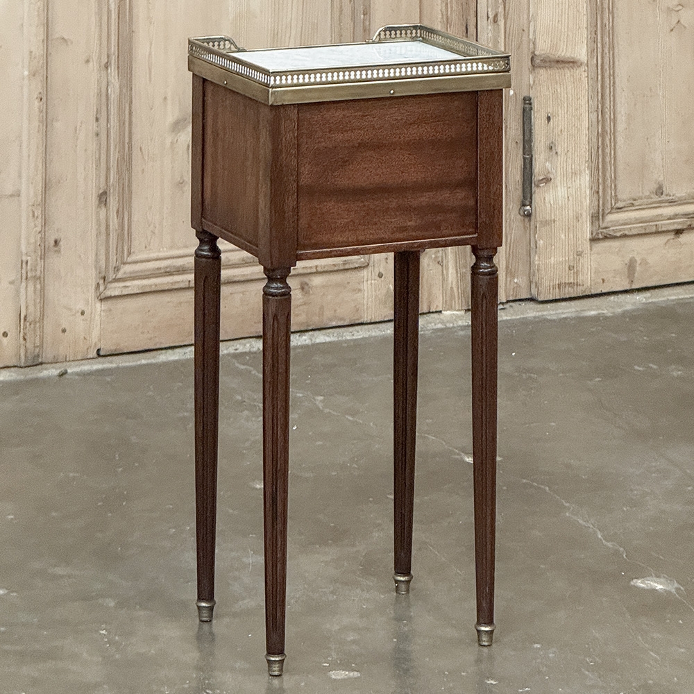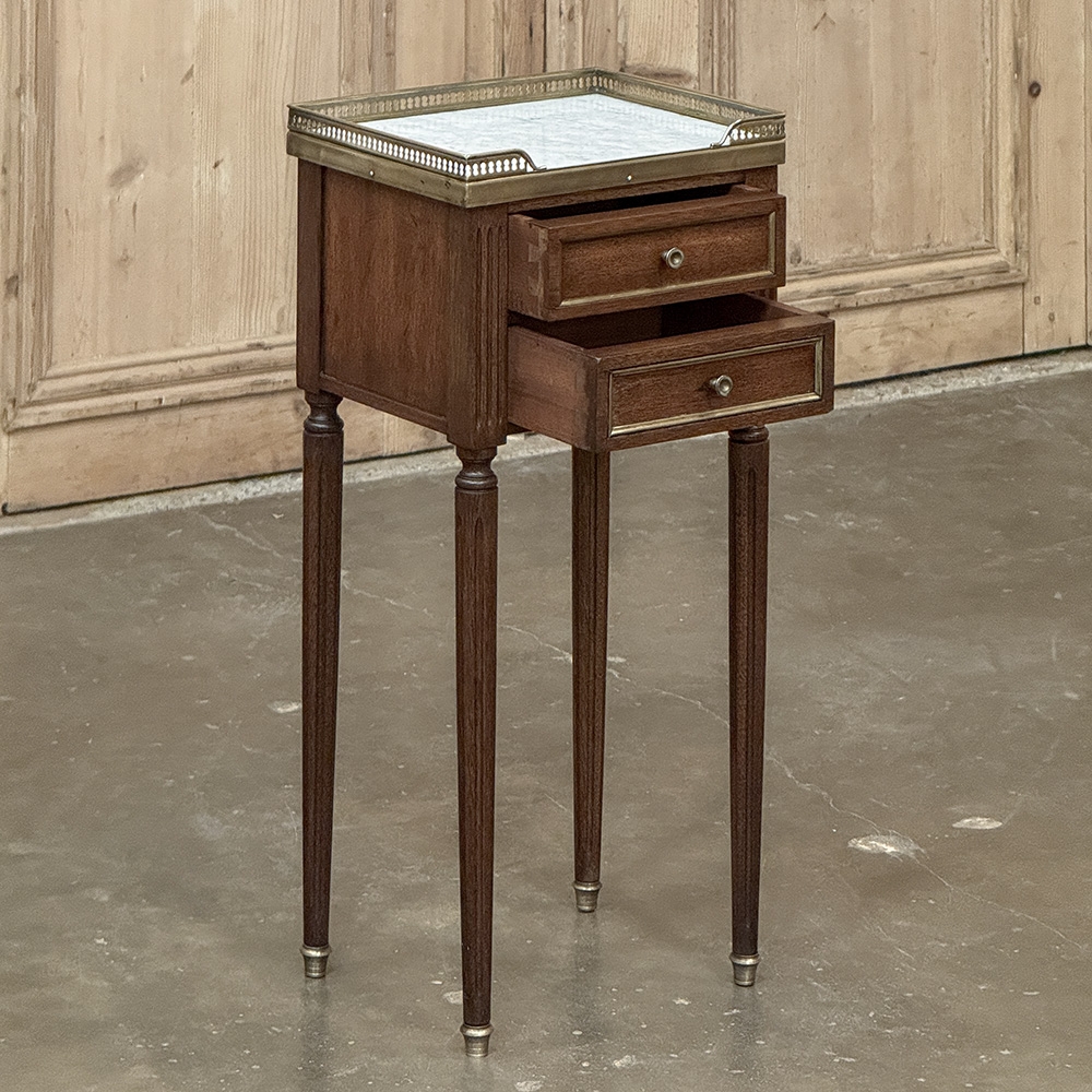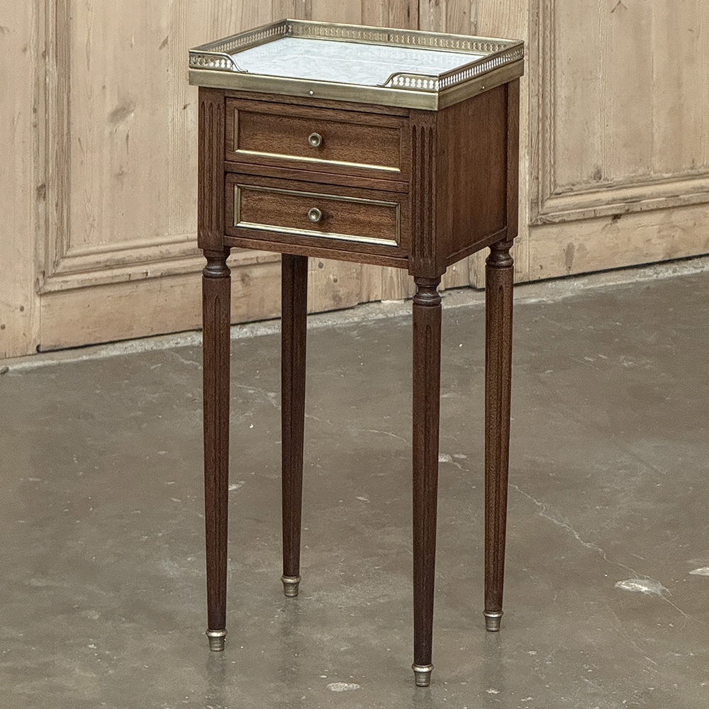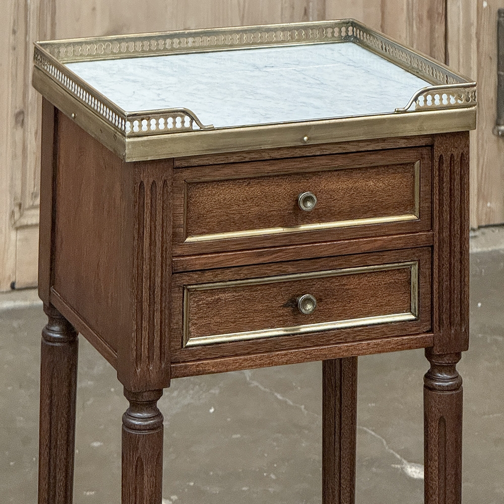 Antique French Directoire Mahogany End Table with Carrara Marble will make a great accent for any room. Its diminutive size makes it ideal for cozy dwellings or seating groups. Finished on all four sides, it can even be placed in the central areas of the room. Crafted from fine imported mahogany, the design is tailored and features two convenient drawers outlined in brass trim and fitted with brass knobs. The front corner posts are fluted, melding with the fluted and subtly tapered legs below, fitted with brass tips on the feet. On top, luxurious Carrara marble with a pierced gallery rail in brass providing both a finishing touch as well as a fence to keep things in place.