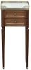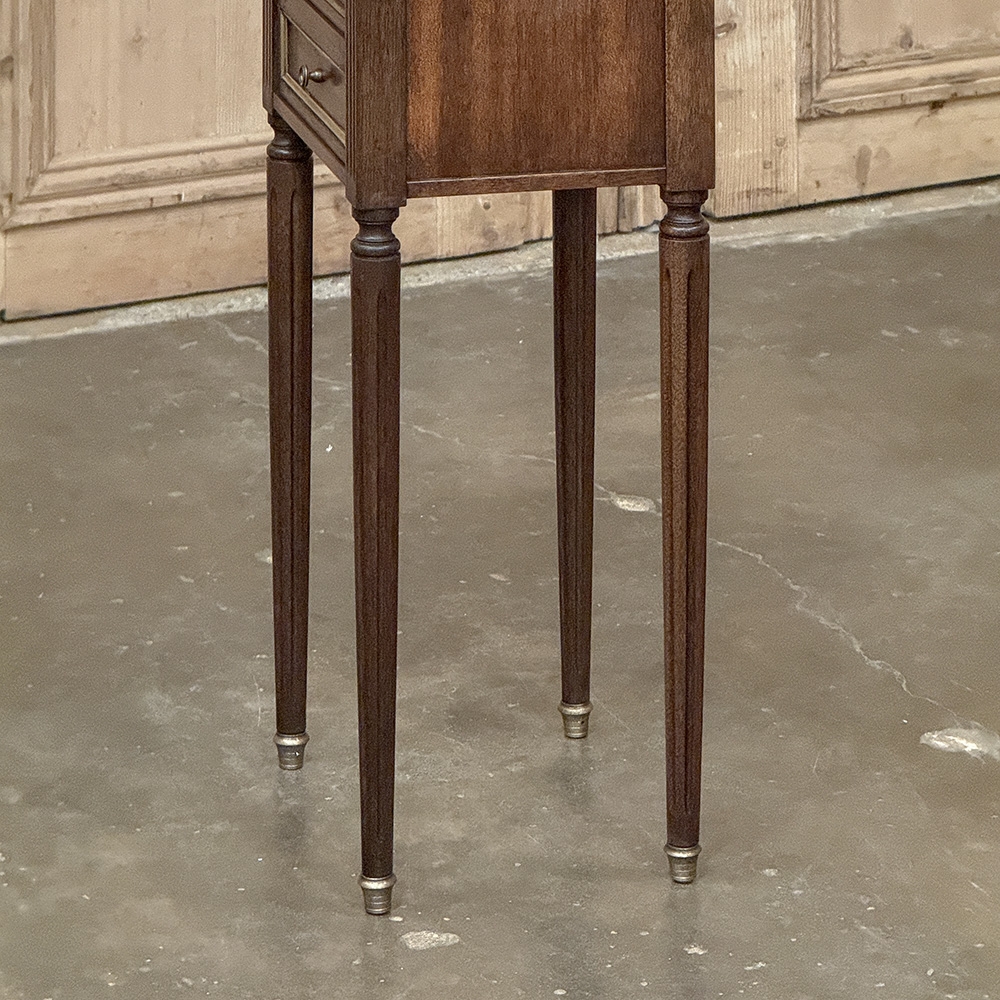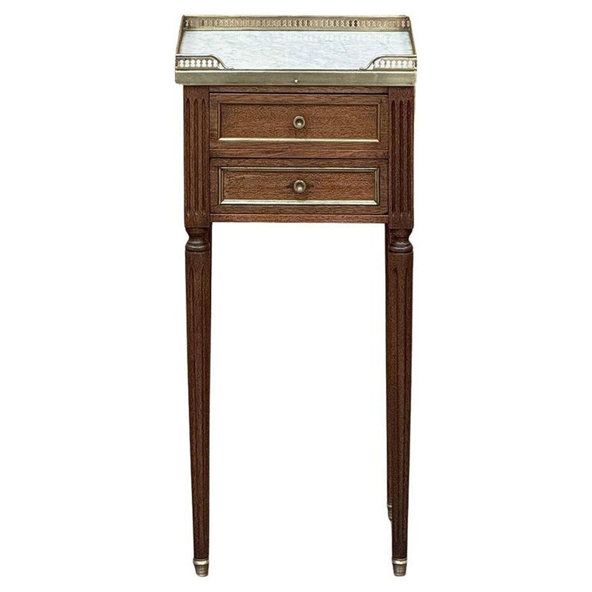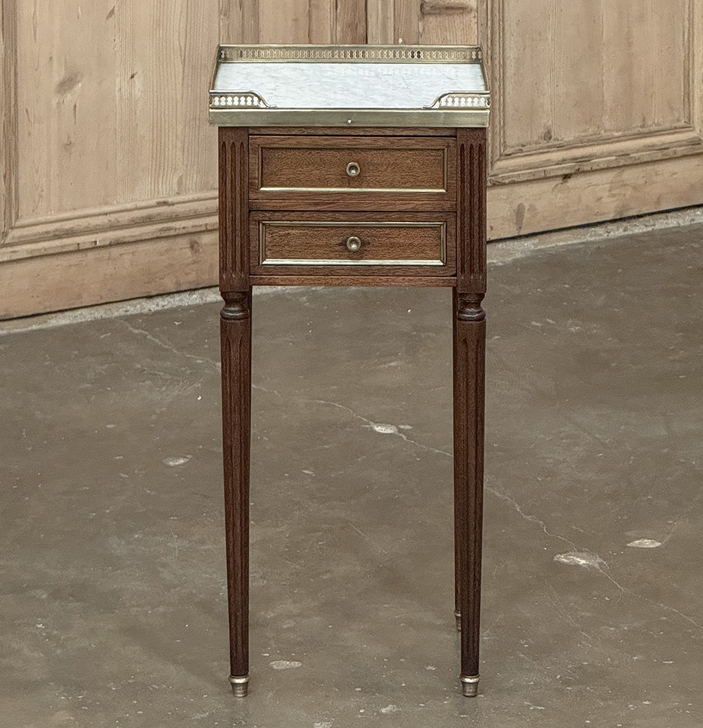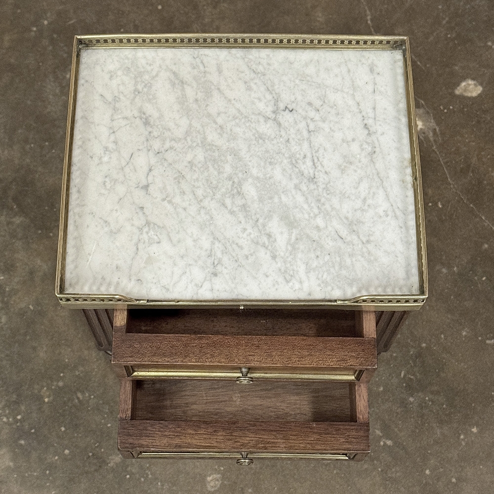 Antique French Directoire Mahogany End Table with Carrara Marble will make a great accent for any room. Its diminutive size makes it ideal for cozy dwellings or seating groups. Finished on all four sides, it can even be placed in the central areas of the room. Crafted from fine imported mahogany, the design is tailored and features two convenient drawers outlined in brass trim and fitted with brass knobs. The front corner posts are fluted, melding with the fluted and subtly tapered legs below, fitted with brass tips on the feet. On top, luxurious Carrara marble with a pierced gallery rail in brass providing both a finishing touch as well as a fence to keep things in place.