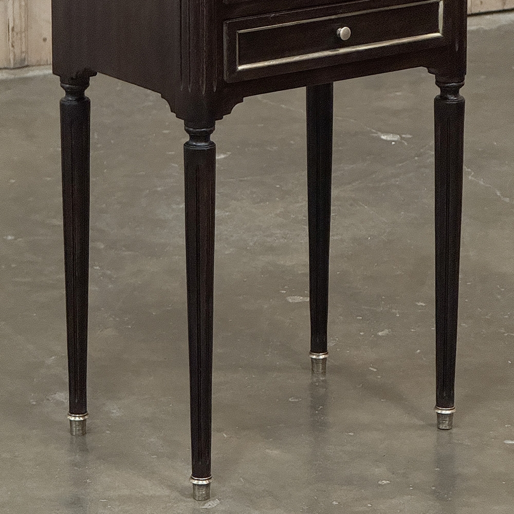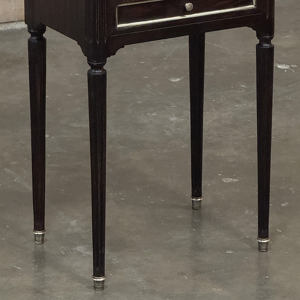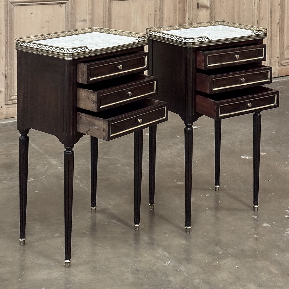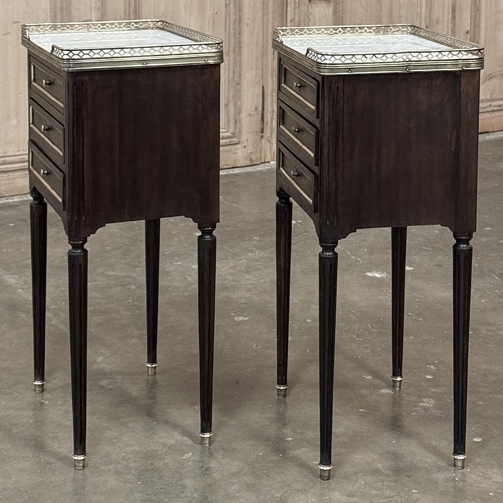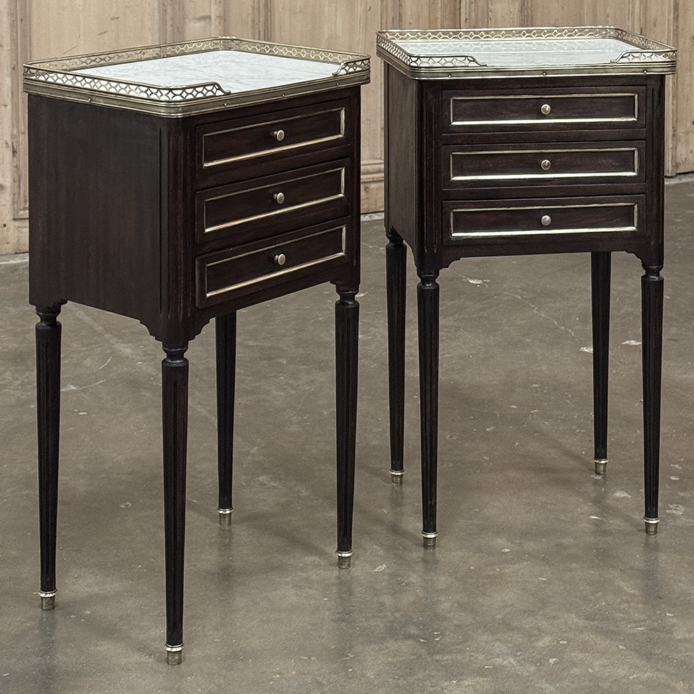 Pair Antique French Directoire Mahogany End Tables with Carrara Marble will make a delightful addition to your room, providing storage, display, perhaps a place for a lamp, three convenient drawers, and tailored elegance that is truly timeless, and in a pair! Hand-crafted from imported mahogany, each features brass trim around the three drawer faces, which are also fitted with brass knobs, designed to allow one to more fully appreciate the sheer natural beauty of the exotic imported wood. Even the side panels have brass trim. The drawer casework is supported by four tapered & fluted legs all tipped with brass feet. Topped with luxuriously veined Carrara marble for a carefree surface, the marble has been beveled and contoured to follow the casework below. Finished on all four sides, the pair are great choices for anywhere, especially the center of the room!