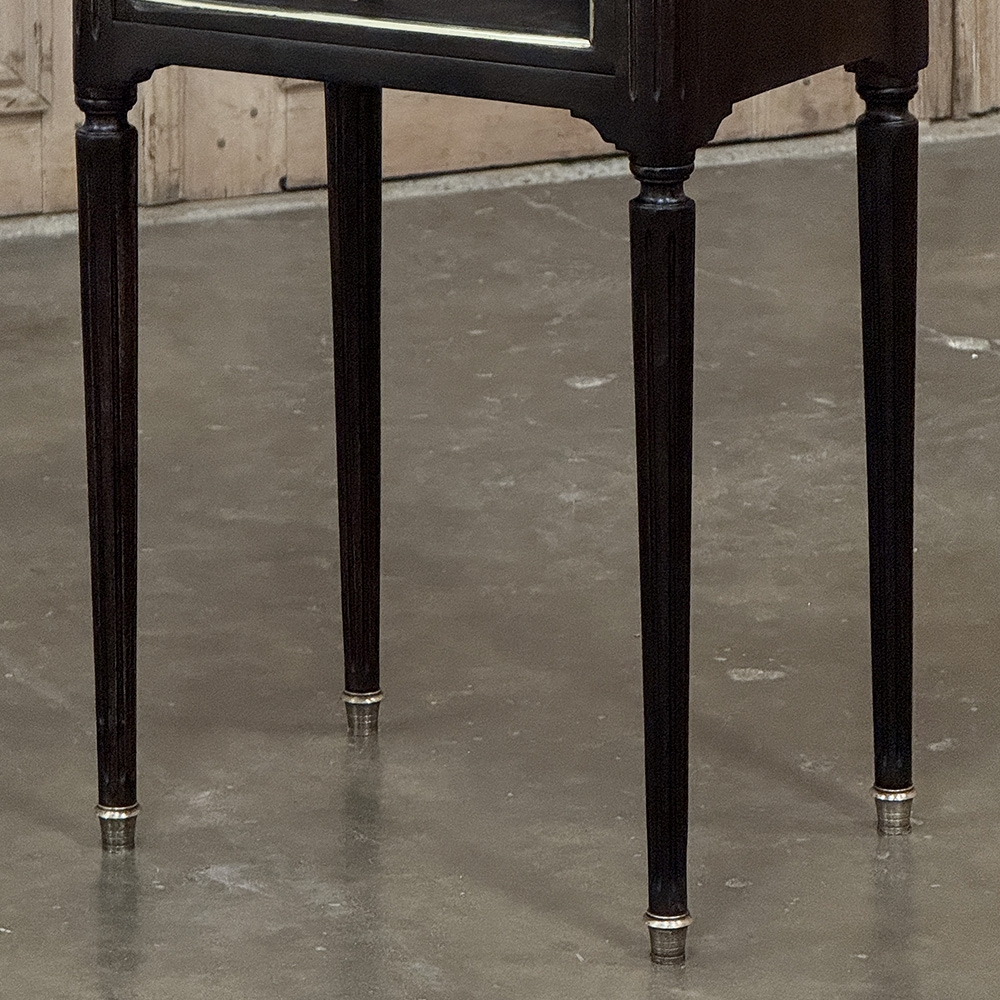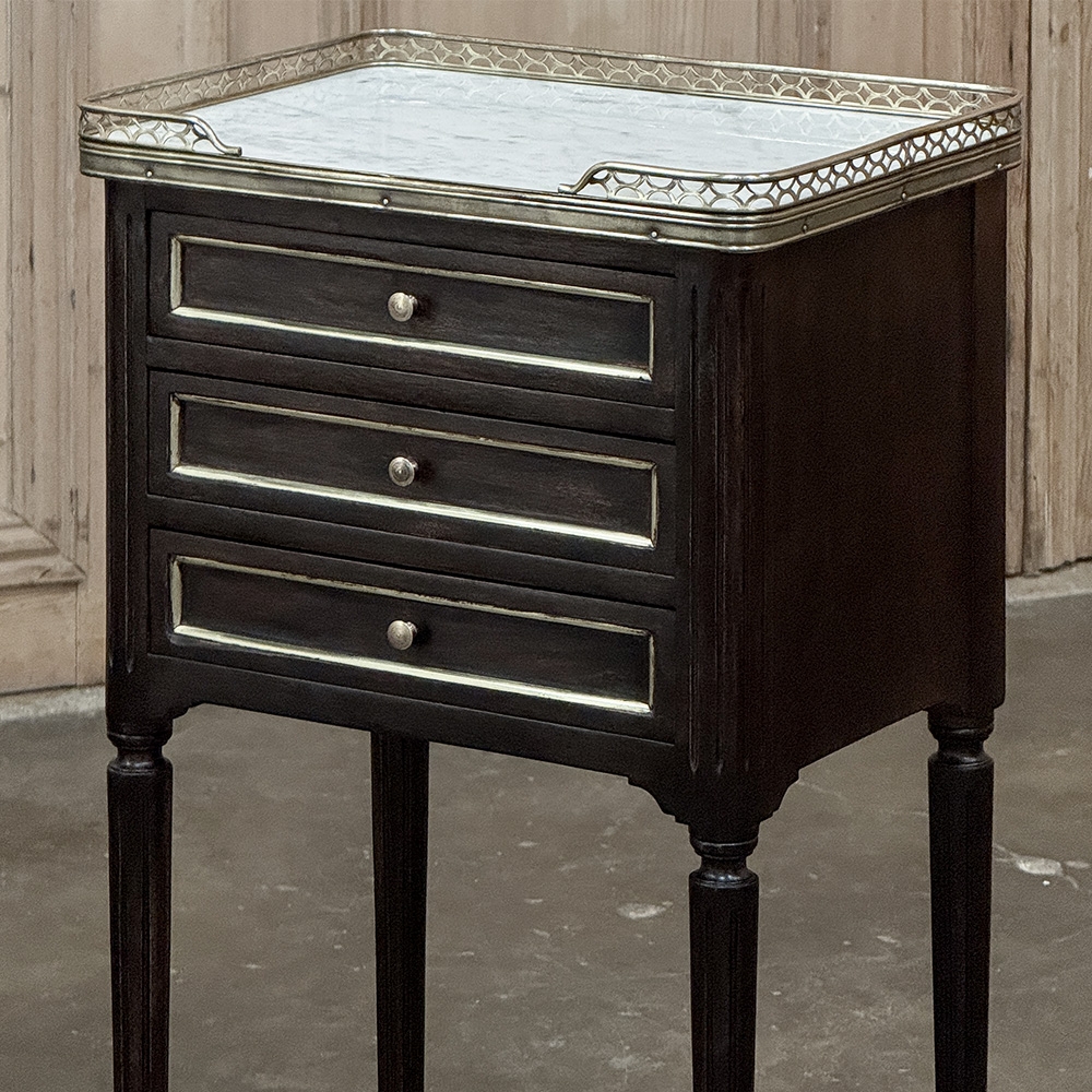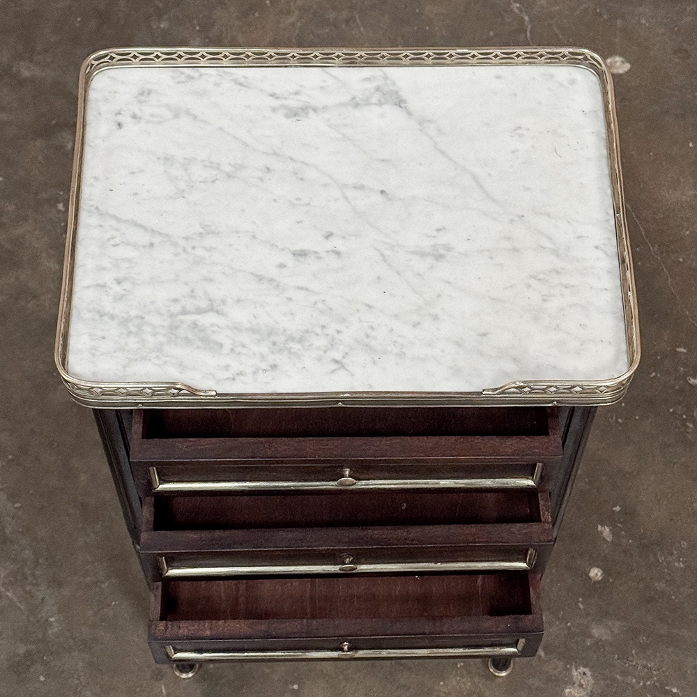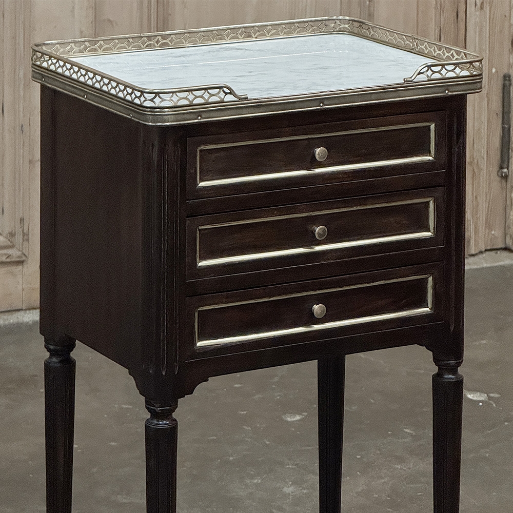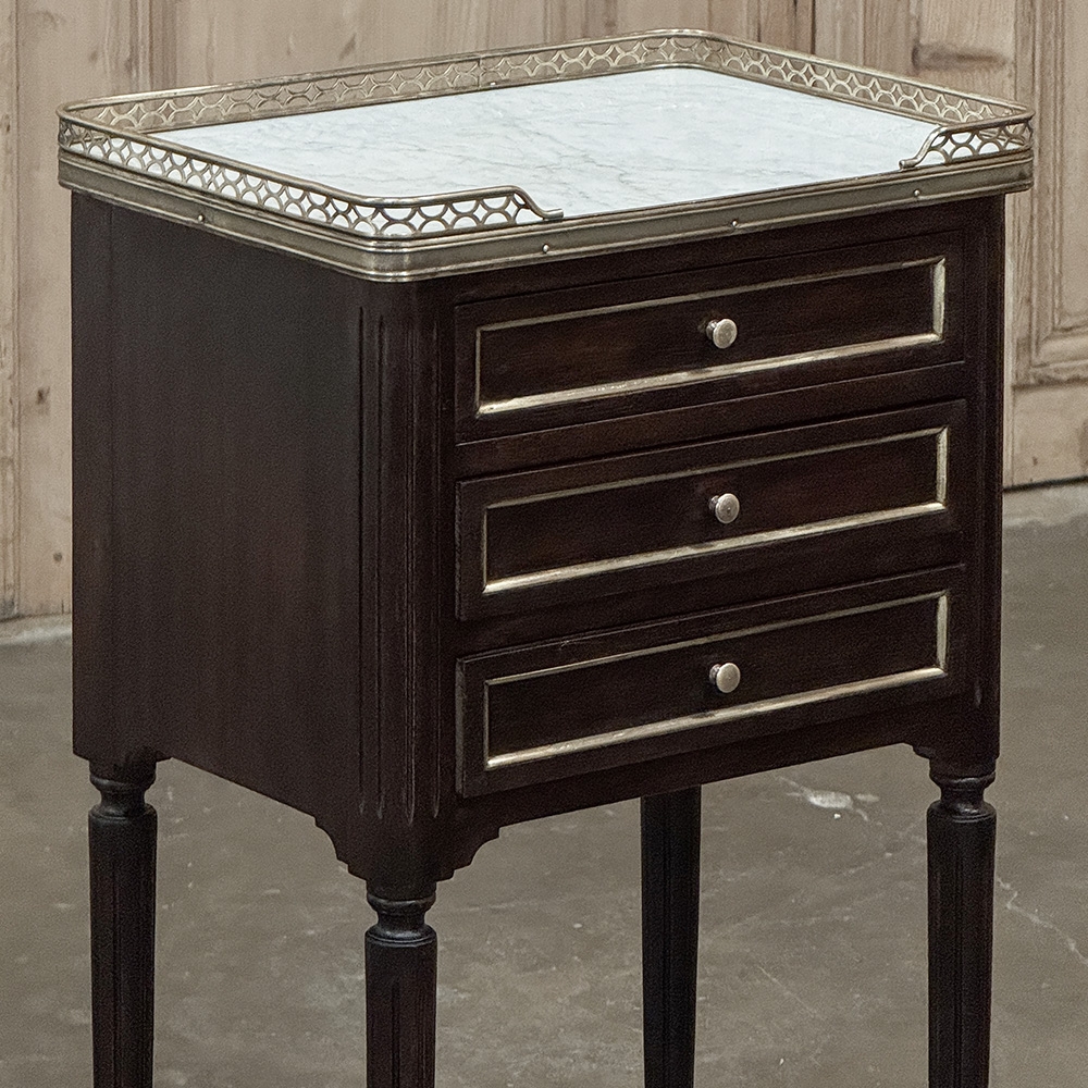 Pair Antique French Directoire Mahogany End Tables with Carrara Marble will make a delightful addition to your room, providing storage, display, perhaps a place for a lamp, three convenient drawers, and tailored elegance that is truly timeless, and in a pair! Hand-crafted from imported mahogany, each features brass trim around the three drawer faces, which are also fitted with brass knobs, designed to allow one to more fully appreciate the sheer natural beauty of the exotic imported wood. Even the side panels have brass trim. The drawer casework is supported by four tapered & fluted legs all tipped with brass feet. Topped with luxuriously veined Carrara marble for a carefree surface, the marble has been beveled and contoured to follow the casework below. Finished on all four sides, the pair are great choices for anywhere, especially the center of the room!
