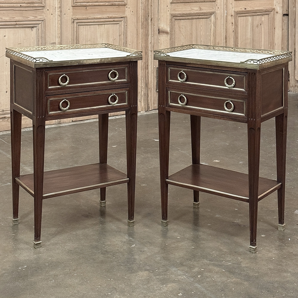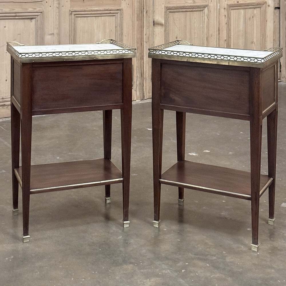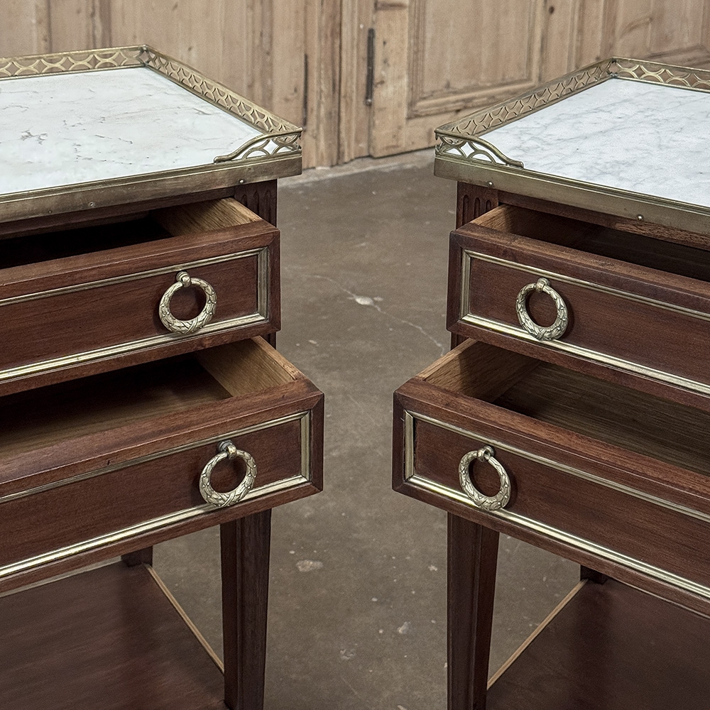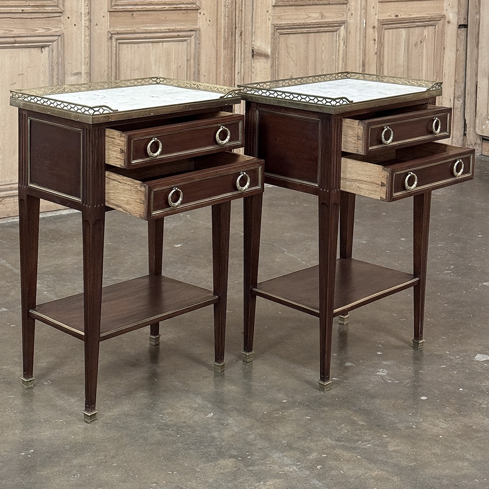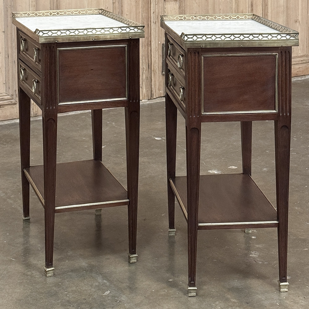 Pair Antique French Louis XVI Neoclassical End Tables with Carrara Marble are ideal companions for any setting. Hand-crafted from exotic imported mahogany, each showcases the sheer natural beauty of the exotic imported wood. One immediately notices the luxurious Carrara marble top, surrounded by a pierced brass gallery fence. Support is provided by four corner posts with fluting on the front, with each affixed to four tapered and scalloped legs tipped with brass feet. Below is also a convenient and attractive lower display/storage shelf trimmed in brass. Each piece also sports a brace of convenient drawers stacked one on top of the other in the casework, with each outlined in brass trim and fitted with a beautiful cast brass ring pull. Note the dovetail workmanship on the sides of the drawers.