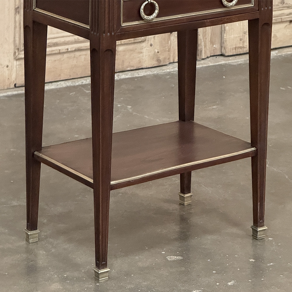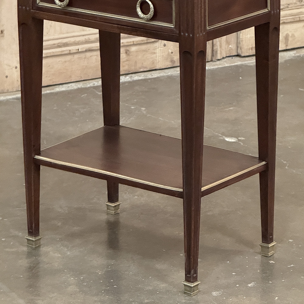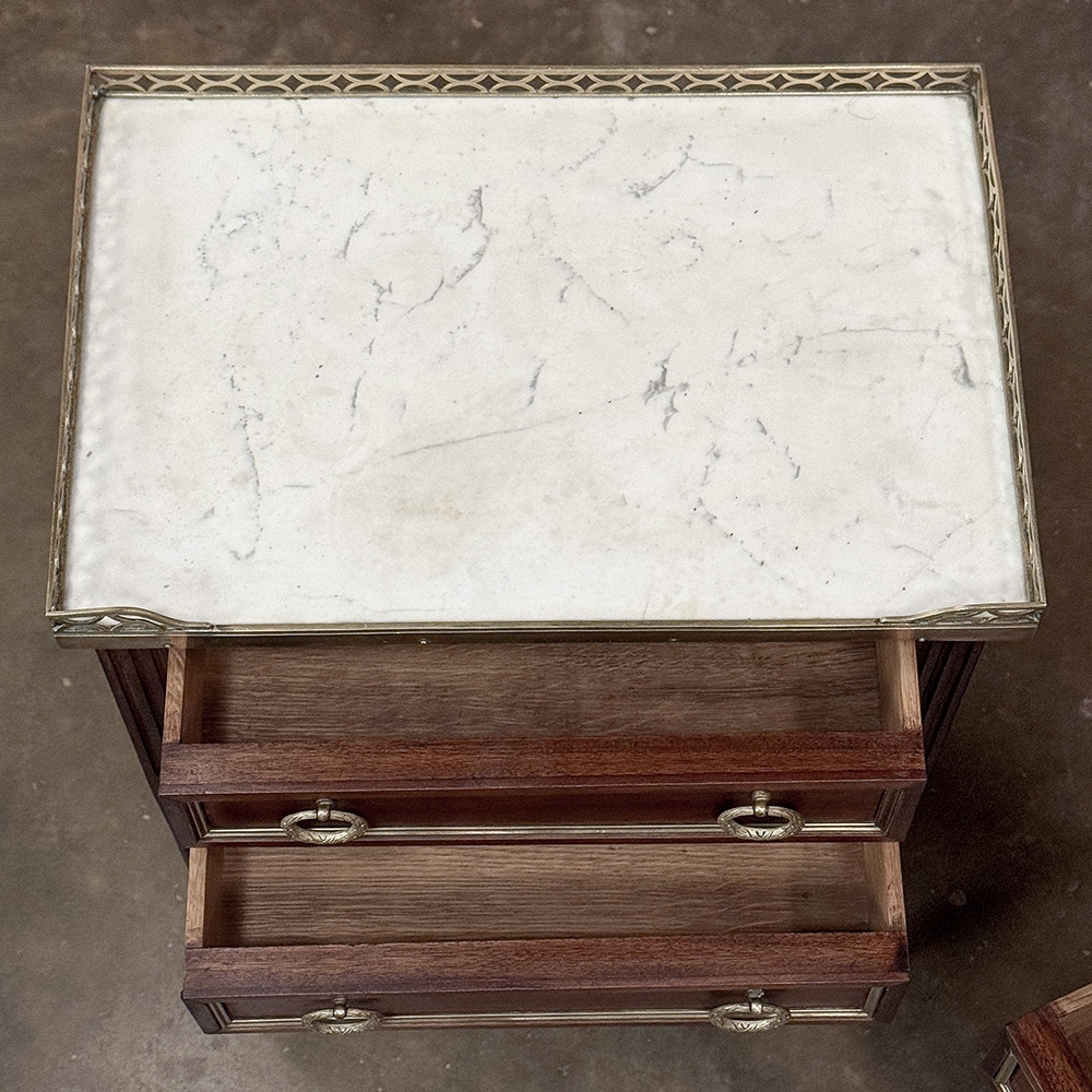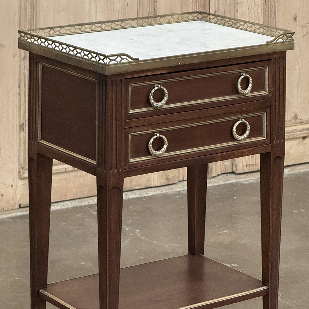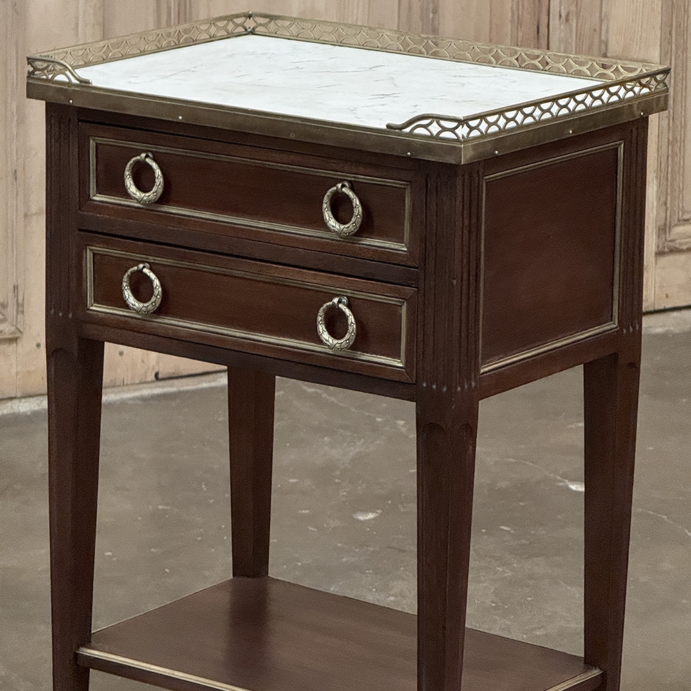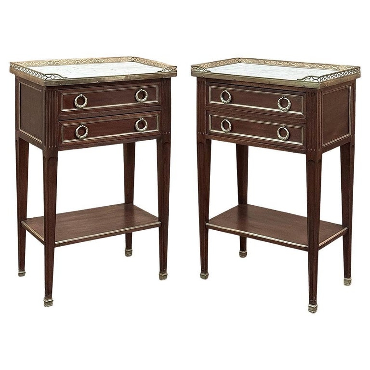 Pair Antique French Louis XVI Neoclassical End Tables with Carrara Marble are ideal companions for any setting. Hand-crafted from exotic imported mahogany, each showcases the sheer natural beauty of the exotic imported wood. One immediately notices the luxurious Carrara marble top, surrounded by a pierced brass gallery fence. Support is provided by four corner posts with fluting on the front, with each affixed to four tapered and scalloped legs tipped with brass feet. Below is also a convenient and attractive lower display/storage shelf trimmed in brass. Each piece also sports a brace of convenient drawers stacked one on top of the other in the casework, with each outlined in brass trim and fitted with a beautiful cast brass ring pull. Note the dovetail workmanship on the sides of the drawers.