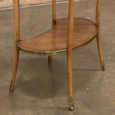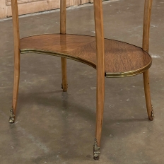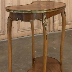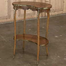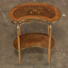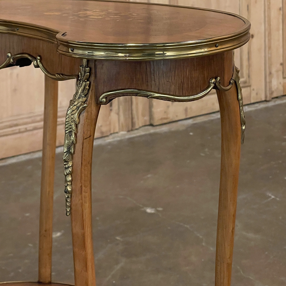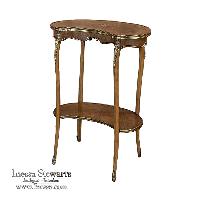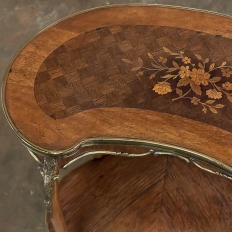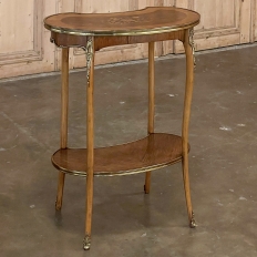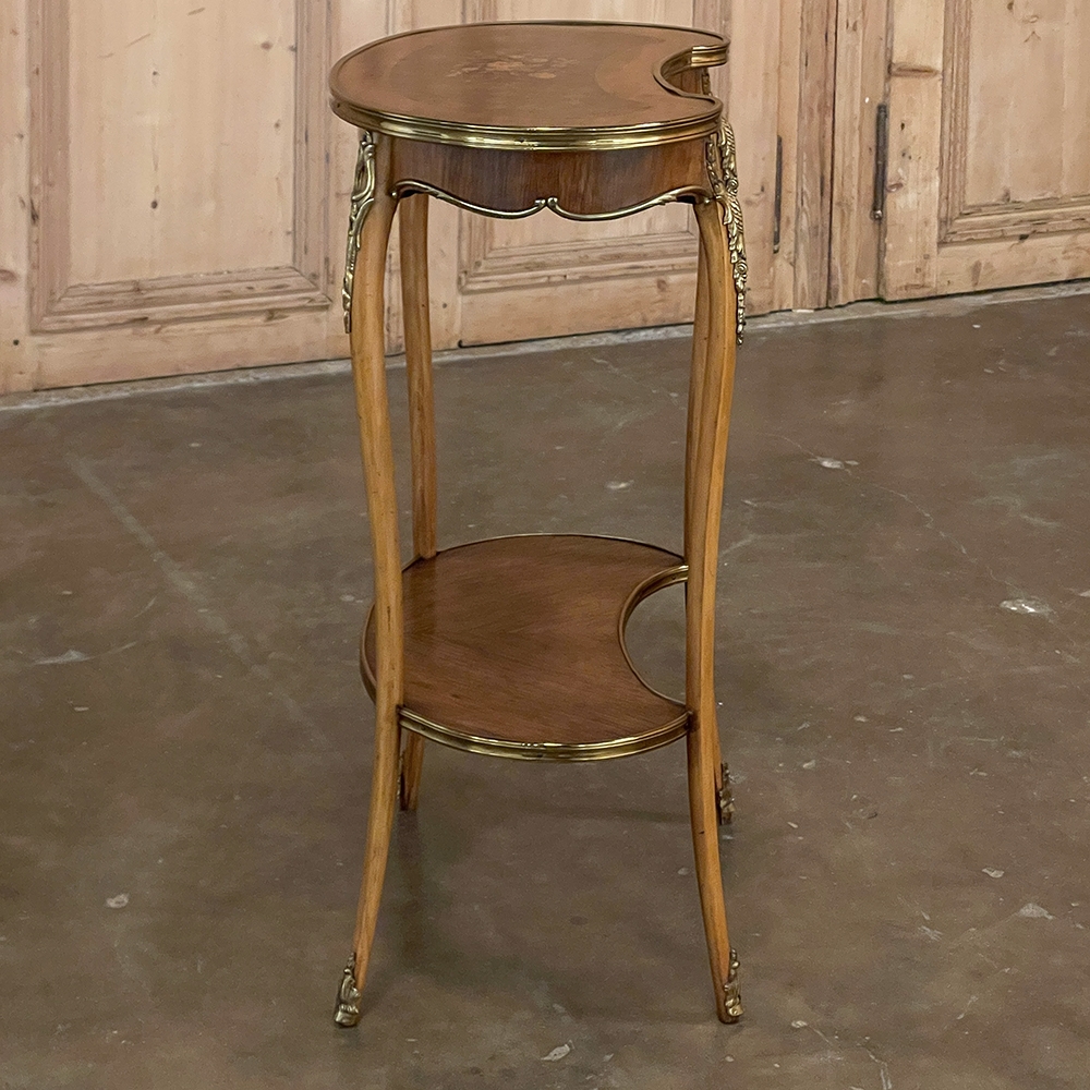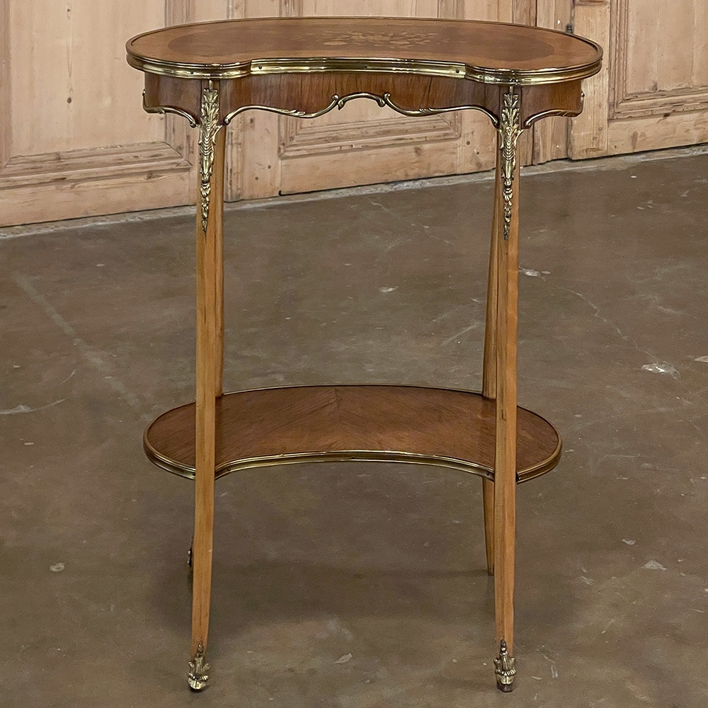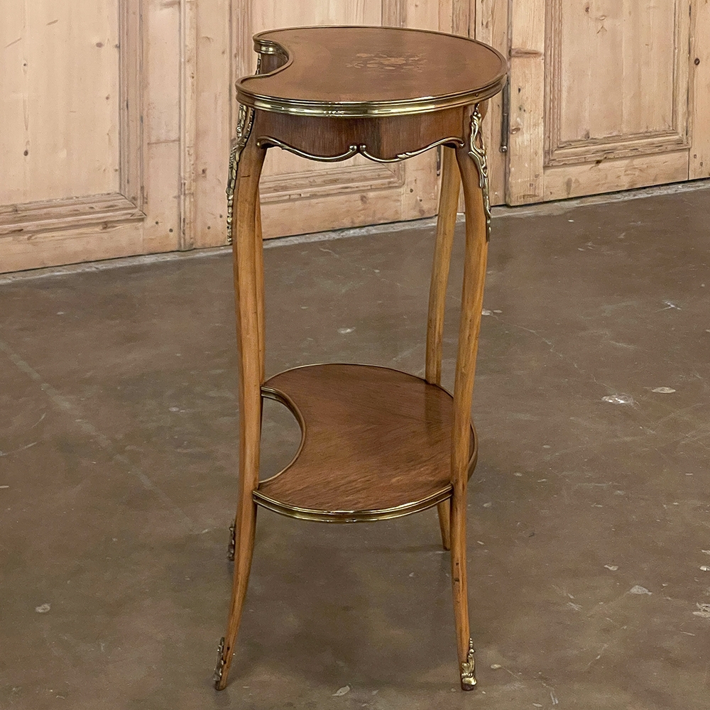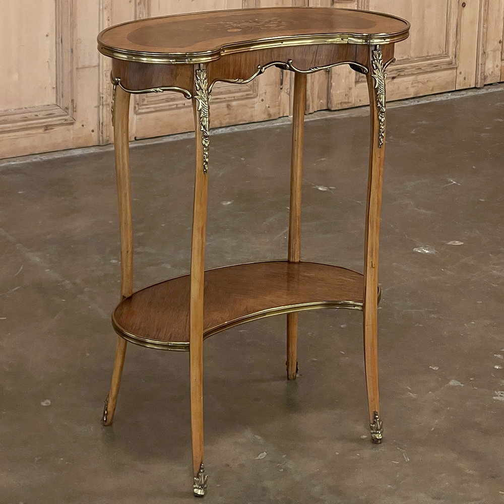 Antique French Louis XV Kidney Shaped Marquetry End Table combines convenient size with double the surface area plus incredible artistry. Utilizing various shades of walnut and satinwood, the two surfaces feature oriented grain for added visual appeal, with the top boasting a border around minute parquetry canvas upon which the woodworker expressed his art insetting and orienting different shades of wood to create a visual image of a floral bouquet. The contours of the apron all around contrast with the straighter horizontal line of the shelf below, yet both surfaces were designed with a kidney shape creating a lot of surface for a table that is less than a foot deep overall. Subtly scrolled legs provide support, and the entire work is accentuated with brass castings and edging for an opulent touch.