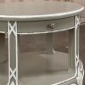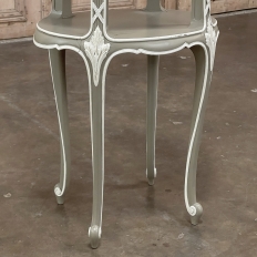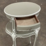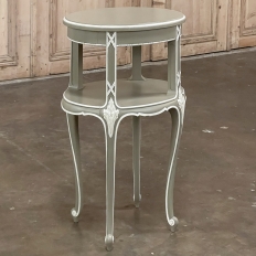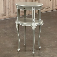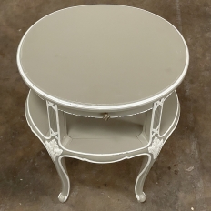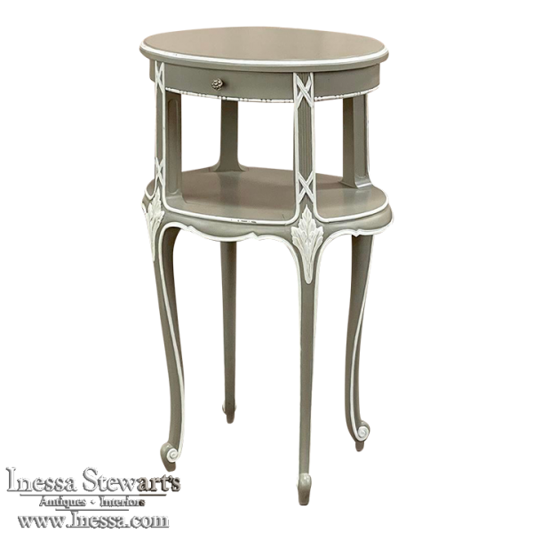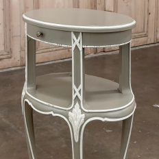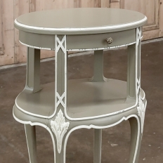 SaleAntique French Louis XV Oval Painted Occasional Table represents the essence of tailored elegance, with a subtle architectural design that includes an oval top with drawer beneath, and an oval shelf with flared and contoured apron all around, and four very subtly scrolled legs, all of which is accentuated by carved embellishments in the neoclassic theme augmenting the otherwise Louis XV overall effect. The carvings and molding are highlighted in off white to contrast with the taupe color of the rest of the piece, for a pleasing effect, and the size is such that it can be used just about anywhere, for a wide variety of purposes.