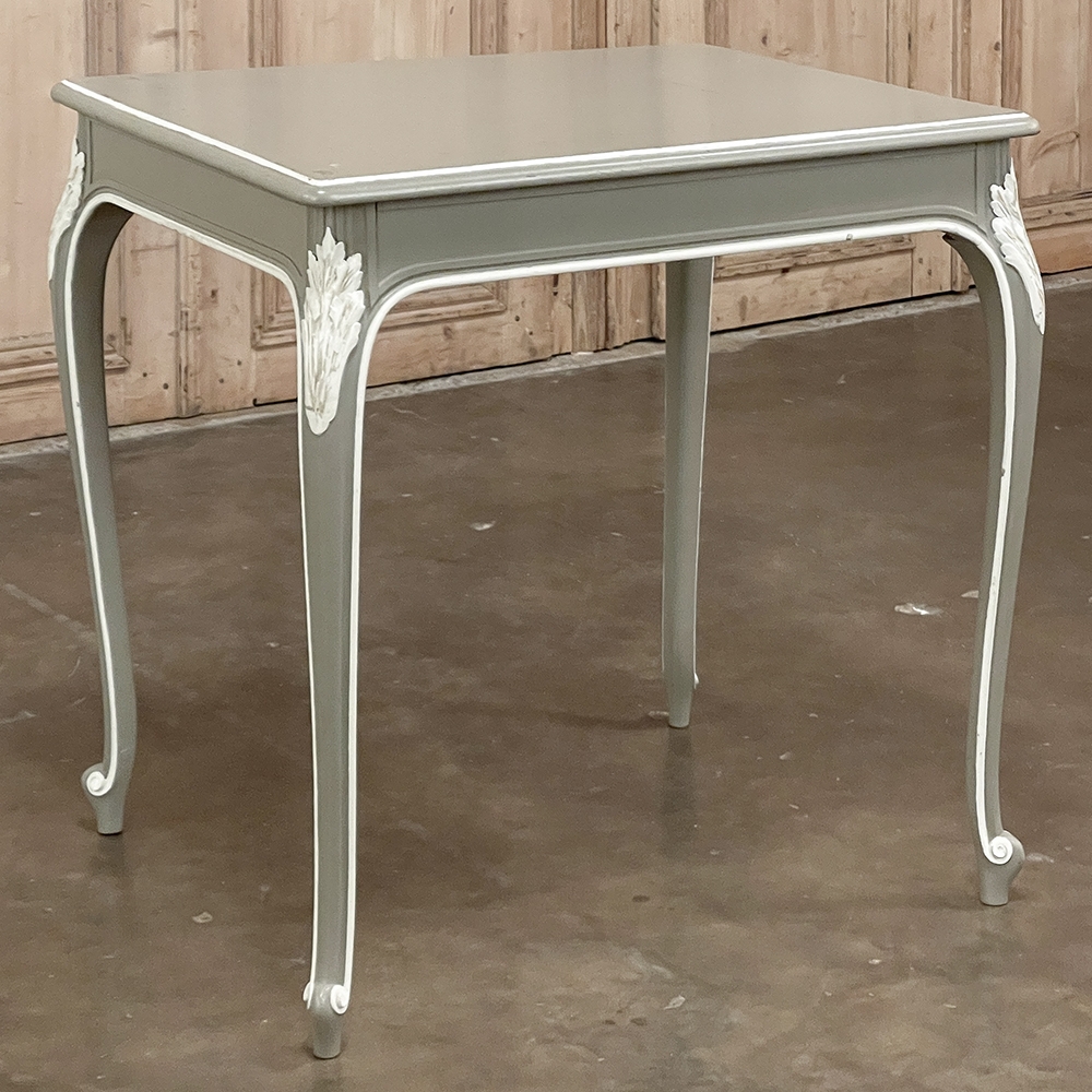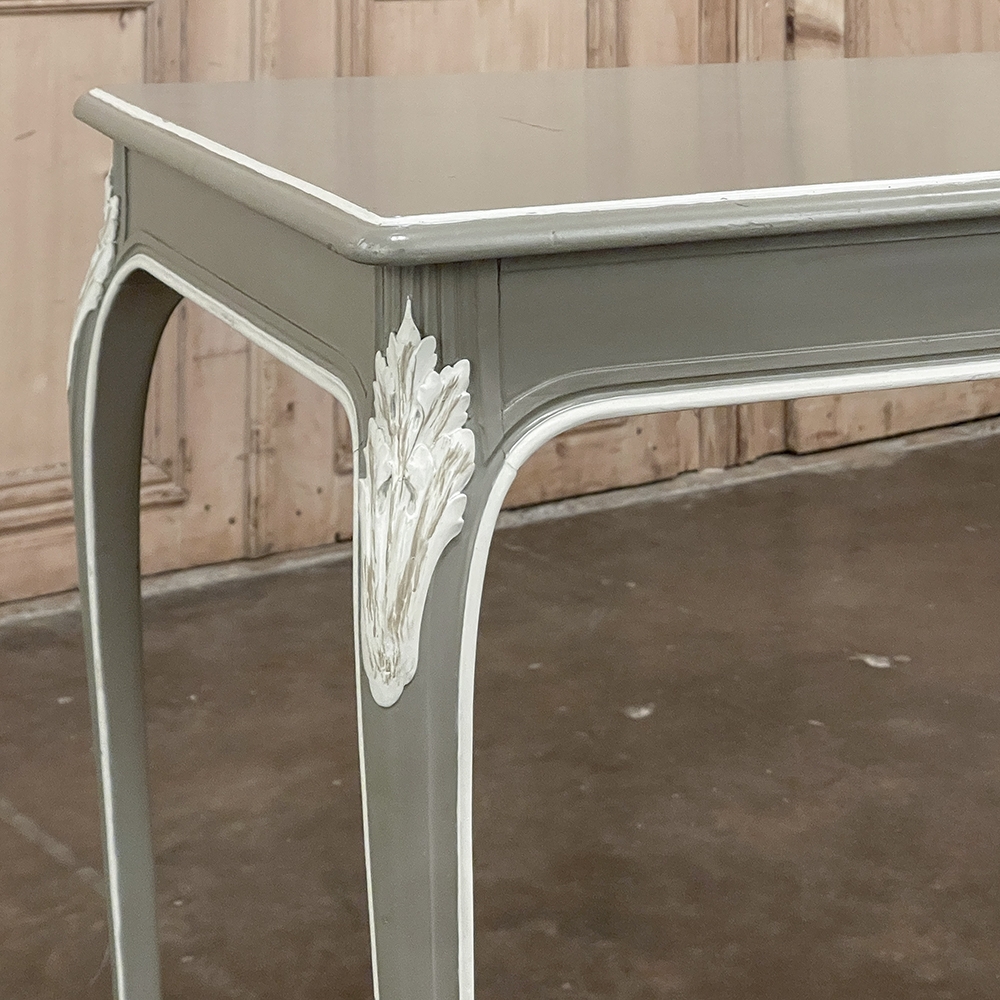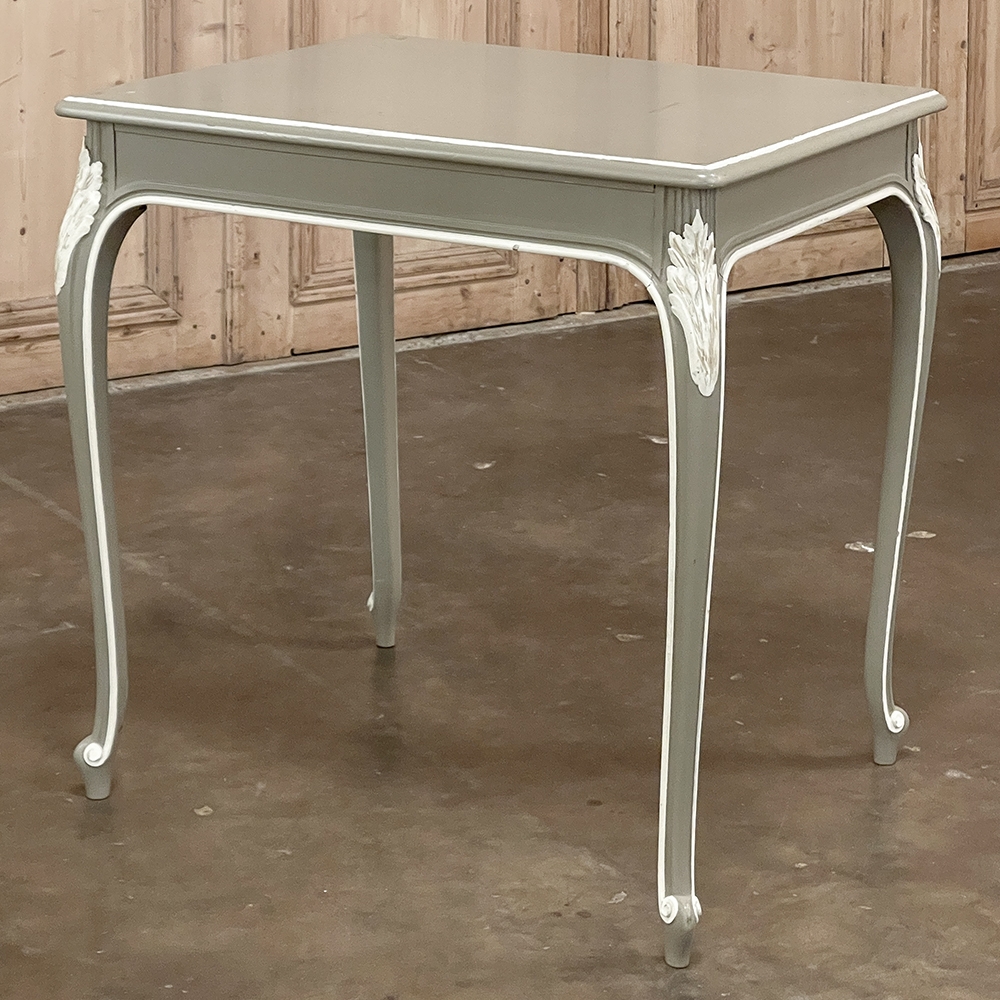 SaleAntique French Louis XV Painted Occasional Table represents the essence of tailored elegance, with a subtle architectural design that includes an rectangular top supported by a tailored apron all around, and four very subtly scrolled legs, each of which is accentuated by carved embellishments in the neoclassic theme augmenting the otherwise Louis XV overall effect. The carvings and molding are highlighted in off white to contrast with the taupe color of the rest of the piece, for a pleasing effect, and the size is such that it can be used just about anywhere, for a wide variety of purposes.