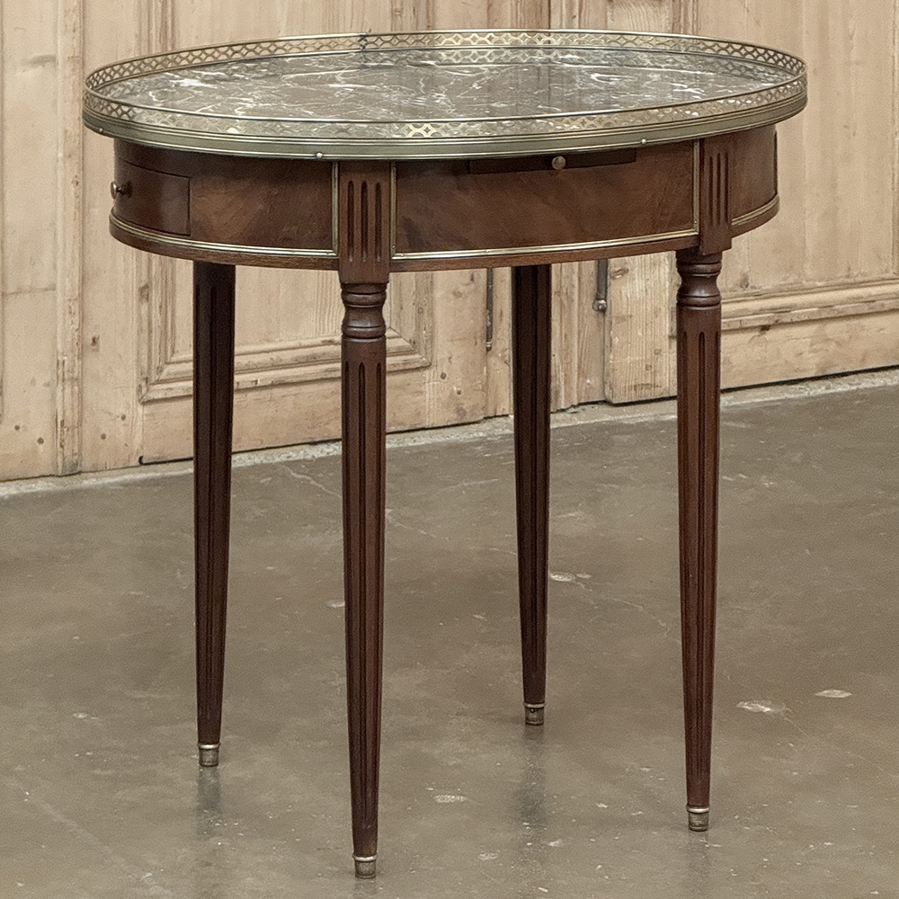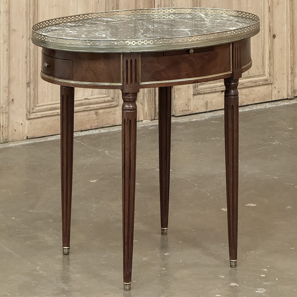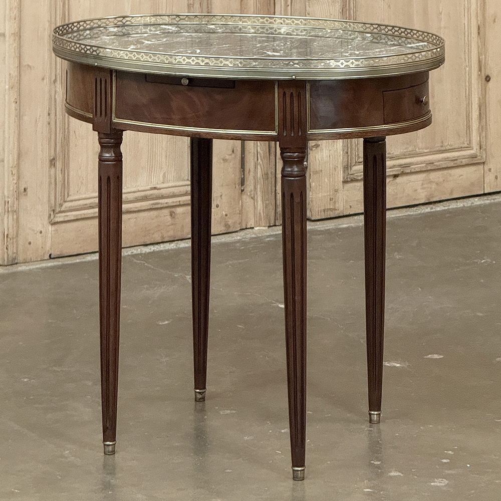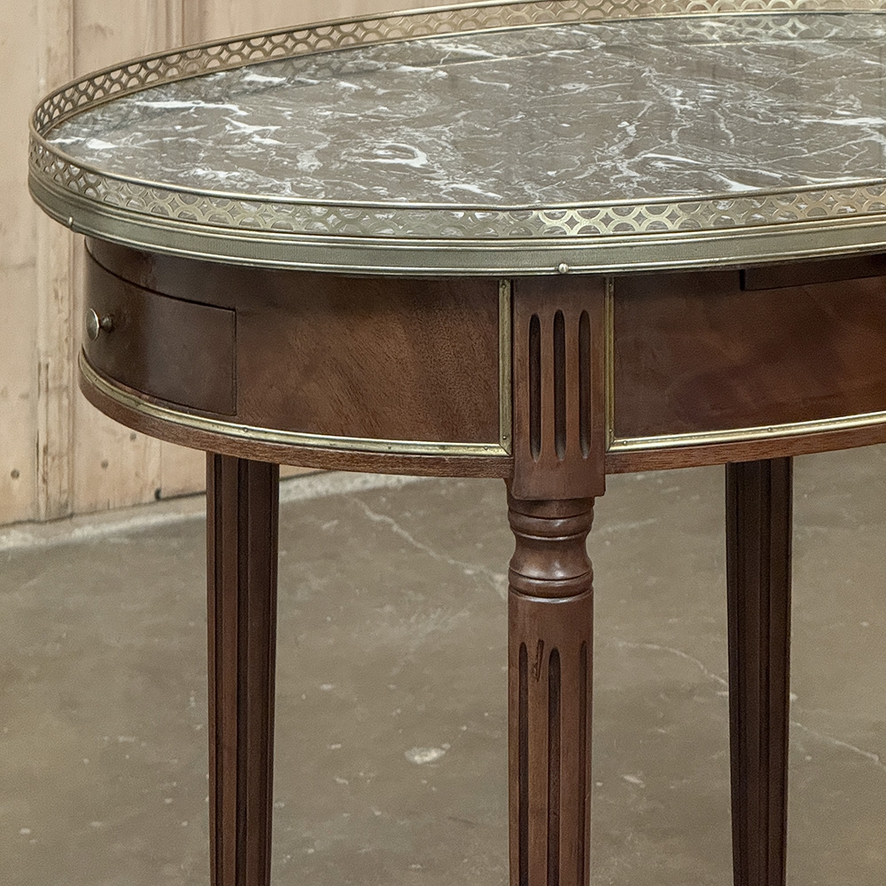 Antique French Louis XVI Mahogany Marble Top Oval Bouillotte Table represents an understated elegance that is perfect for the tailored yet refined decor. Unusual to find in an oval shape, it was hand-crafted from exotic imported mahogany, it features a round apron interrupted by fluted plinth blocks that serve as mounts for the four tapered and fluted legs, all tipped with brass feet. A pierced brass gallery rail surrounds the luxuriously veined gray marble top which protects the edge and provides a fence to keep things in place. Two drawers add a convenient touch, and opposed to them are two drink pull-outs, with all four accessed by brass knobs or rings. The size makes it ideal for any seating group but it also works well as a side or end table for any use. Being finished all around it can be placed anywhere in the room one desires, becoming the perfect companion piece for your favorite room.