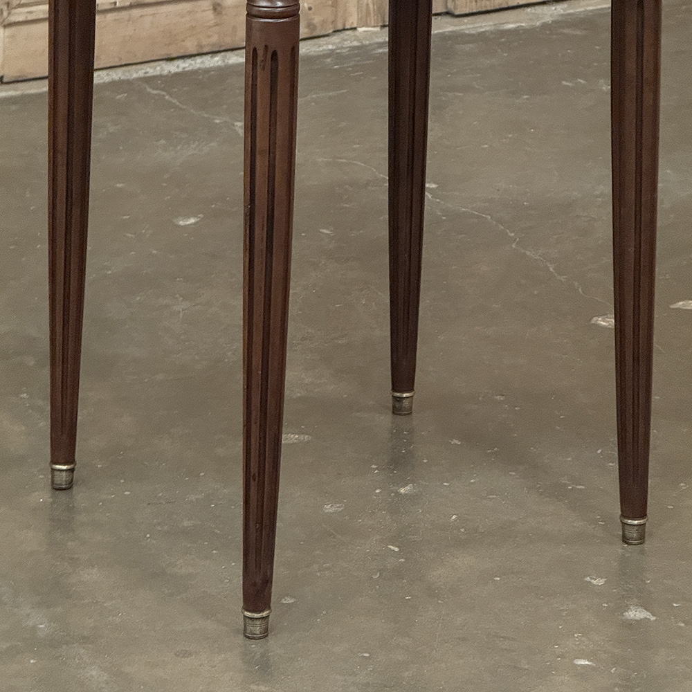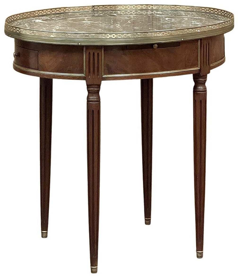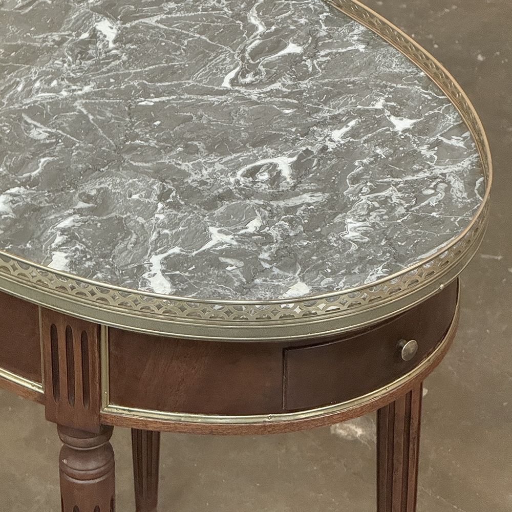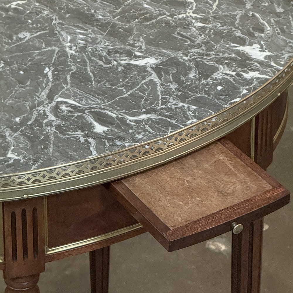 Antique French Louis XVI Mahogany Marble Top Oval Bouillotte Table represents an understated elegance that is perfect for the tailored yet refined decor. Unusual to find in an oval shape, it was hand-crafted from exotic imported mahogany, it features a round apron interrupted by fluted plinth blocks that serve as mounts for the four tapered and fluted legs, all tipped with brass feet. A pierced brass gallery rail surrounds the luxuriously veined gray marble top which protects the edge and provides a fence to keep things in place. Two drawers add a convenient touch, and opposed to them are two drink pull-outs, with all four accessed by brass knobs or rings. The size makes it ideal for any seating group but it also works well as a side or end table for any use. Being finished all around it can be placed anywhere in the room one desires, becoming the perfect companion piece for your favorite room.