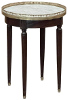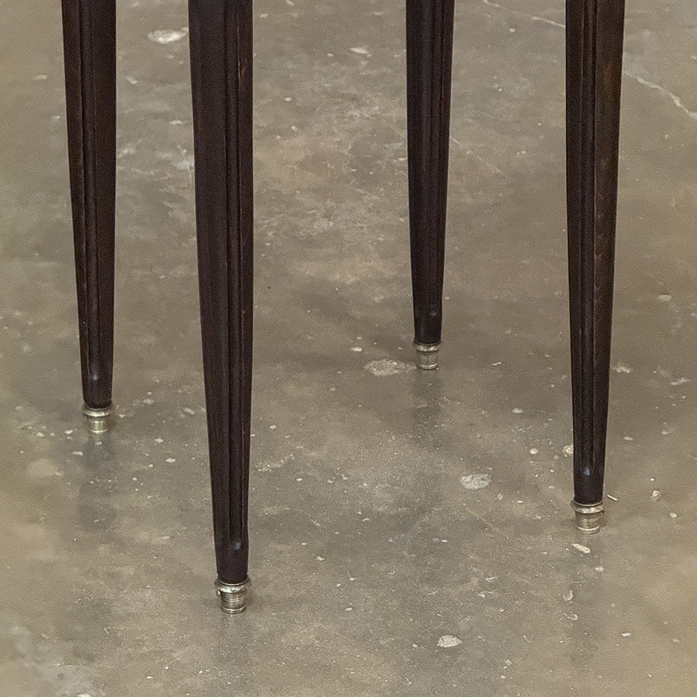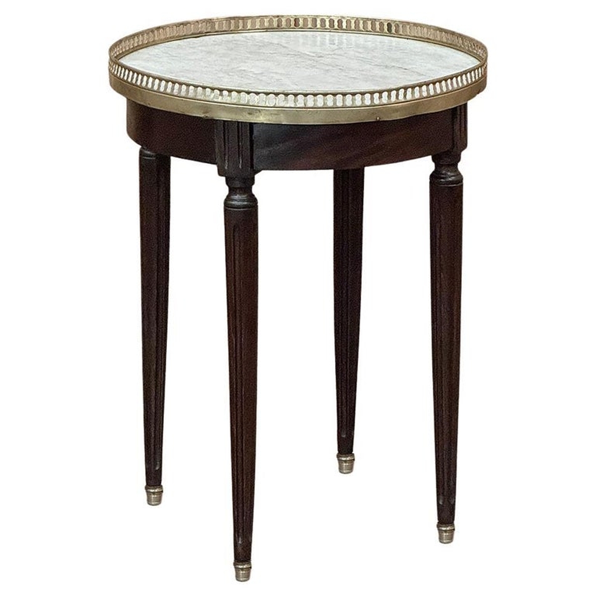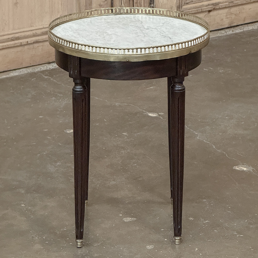 Antique French Louis XVI Round Mahogany End Table with Carrara Marble will make the perfect accompaniment to any seating group! Crafted from imported mahogany ~ considered one of the finest furniture woods in the world ~ its round shape makes it adaptable to any floor plan layout. Four tapered and fluted legs tipped with brass feet provide support, joined to the apron with fluted plinth blocks. The luxurious yet carefree marble top is surrounded by a pierced brass fence to keep things in place on the table.