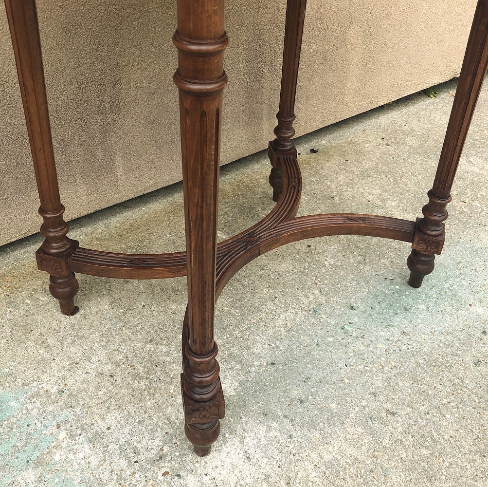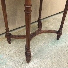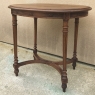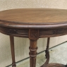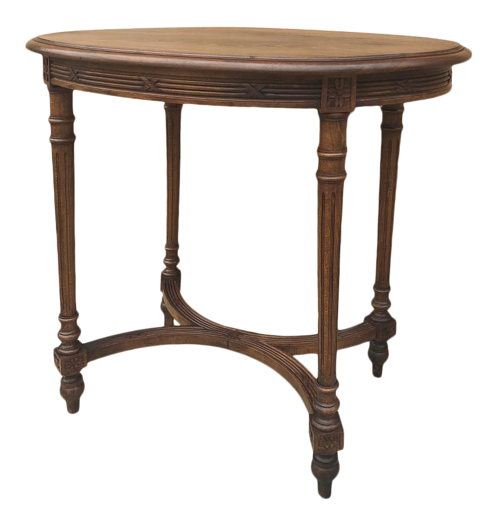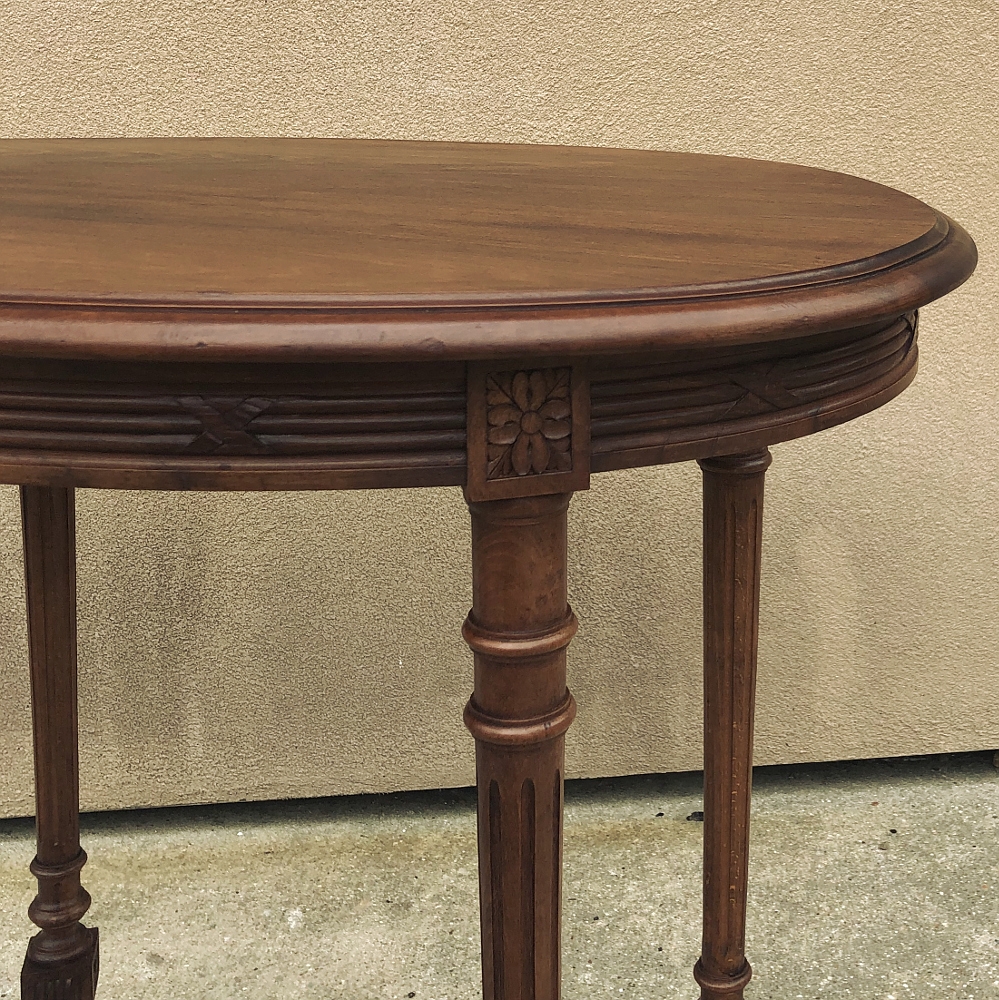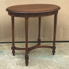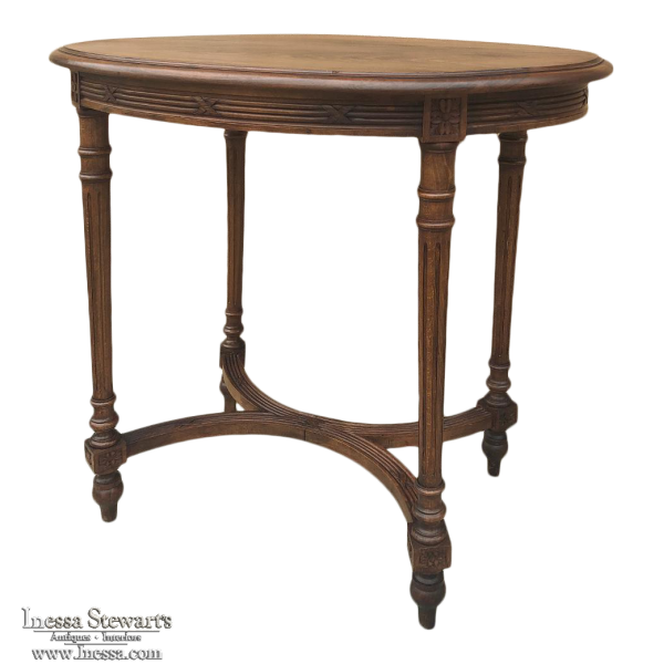 Antique French Walnut Louis XVI Oval End Table represents the essence of the classical style, rendered in luxurious indigenous French walnut for a rich, lustrous effect. The double beveled oval top rests upon an apron carved with banded wheat, interrupted by the four plinth blocks carved with acanthus rosettes that are used to mount the tapered and fluted legs. The legs are connected with elegant bowed stretchers below for style and strength, with turned feet to finish the look.