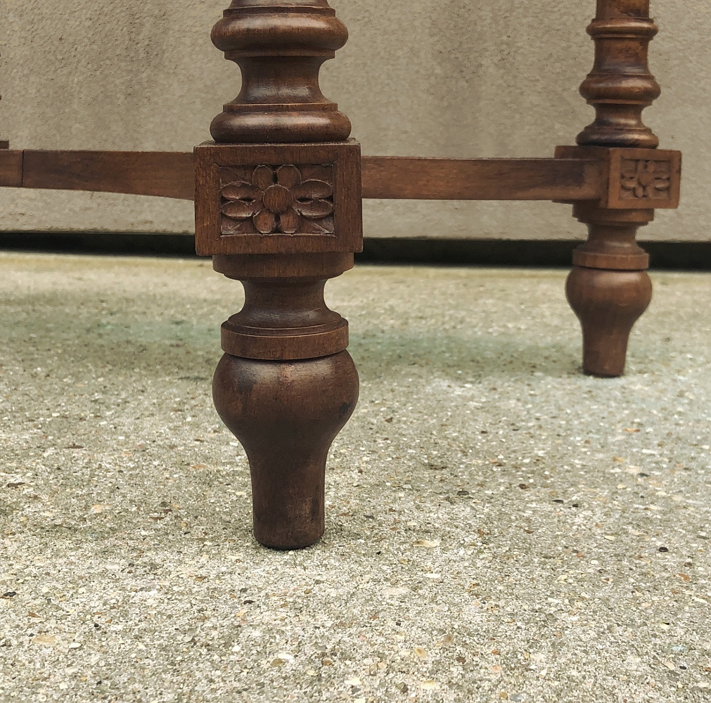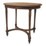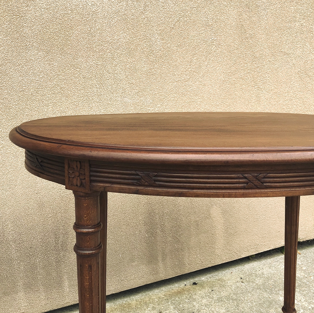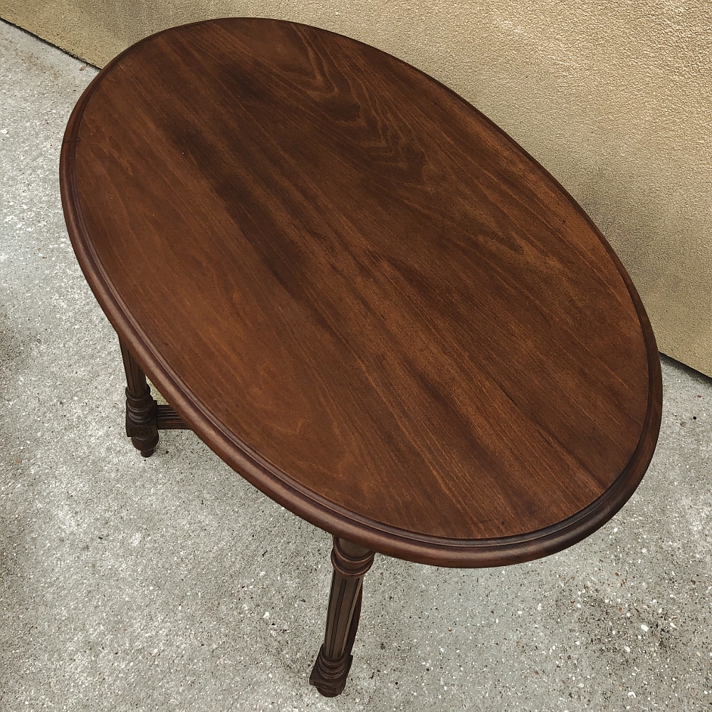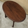 Antique French Walnut Louis XVI Oval End Table represents the essence of the classical style, rendered in luxurious indigenous French walnut for a rich, lustrous effect. The double beveled oval top rests upon an apron carved with banded wheat, interrupted by the four plinth blocks carved with acanthus rosettes that are used to mount the tapered and fluted legs. The legs are connected with elegant bowed stretchers below for style and strength, with turned feet to finish the look.