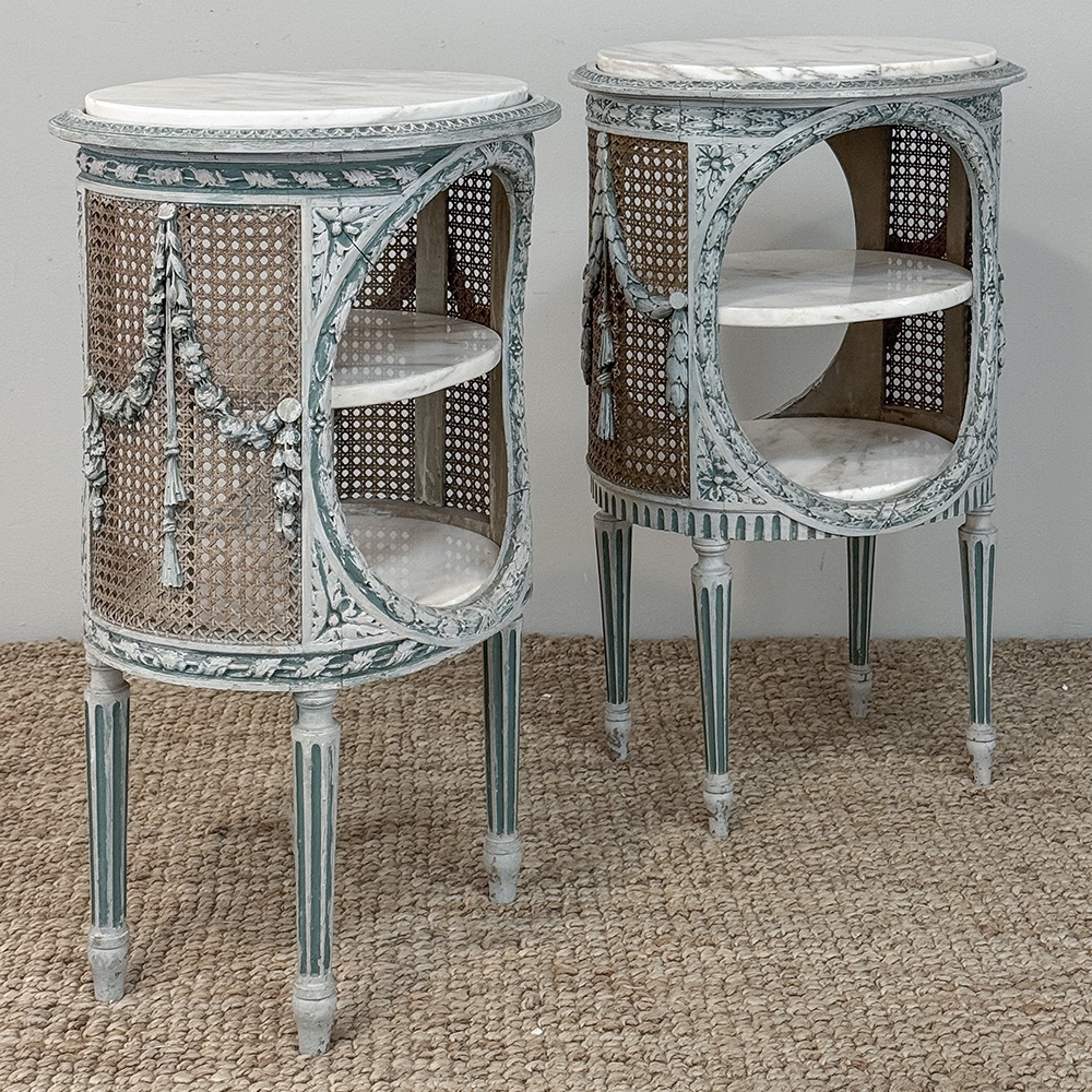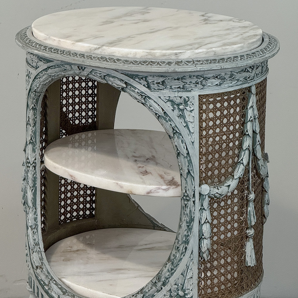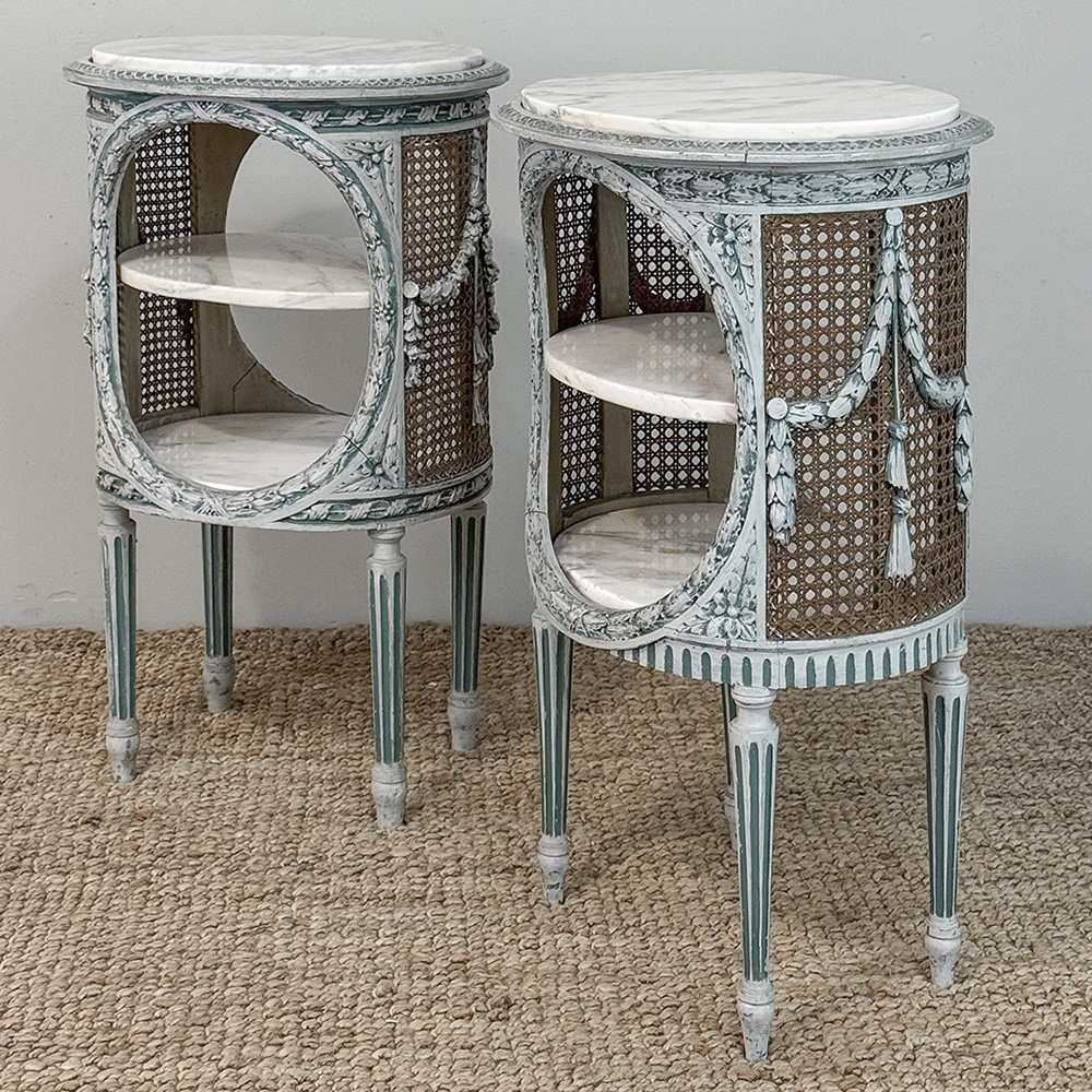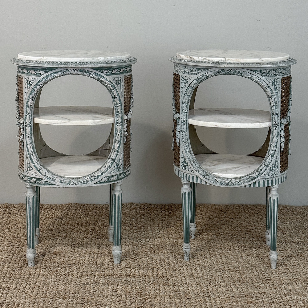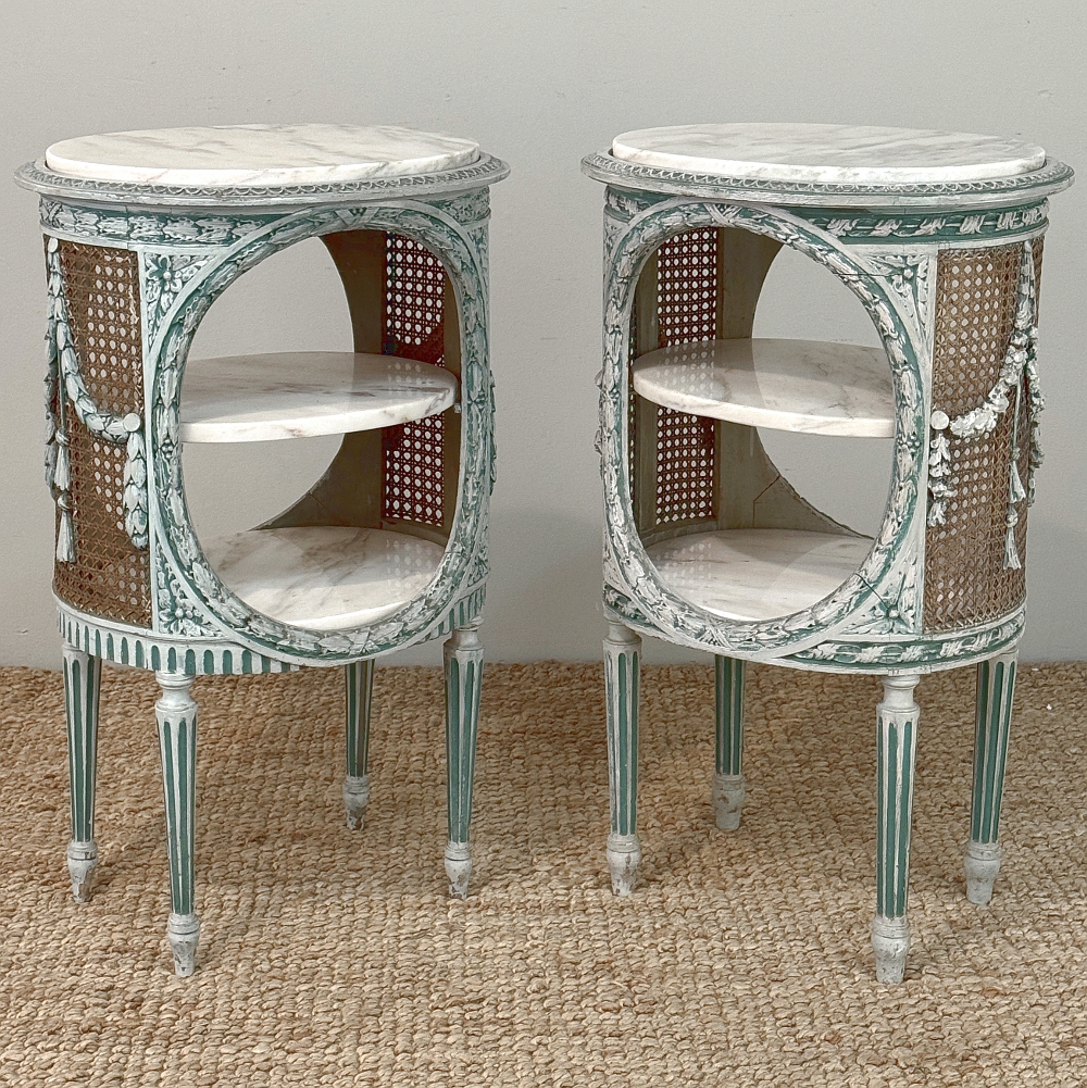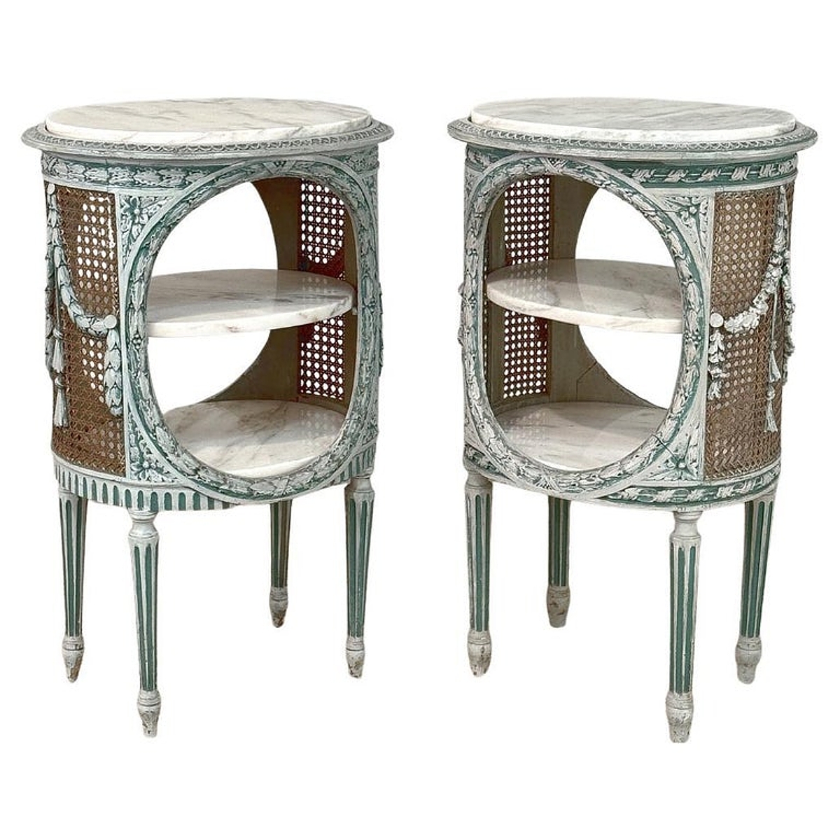 Pair 19th Century French Louis XVI Painted Oval End Tables with Marble are a superlative find! Crafted in the neoclassical style in an oval shape, with oval openings on front and back and caned sides, they are remarkably light in visual impact, yet each provides three marble surfaces for your utter enjoyment. The intricately embellished casework includes laurel bordering underneath the molding surrounding the top marble, with the same laurel bordering motif applied around each oval opening front and back. Rosettes fill the somewhat triangular space between the oval openings and the cane above and below. The openings allow access to the middle and lower marble shelves. The caned sides allow light in and are overlaid with hand-sculpted laurel swags with tassels to add to the amazing detail. A fluted apron below leads the eye to the four tapered and fluted legs. The overall works were painted in a pastel blueish-green with a darker bluish-green used for contrasting highlights. Perfect for placement anywhere in any room!