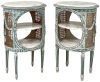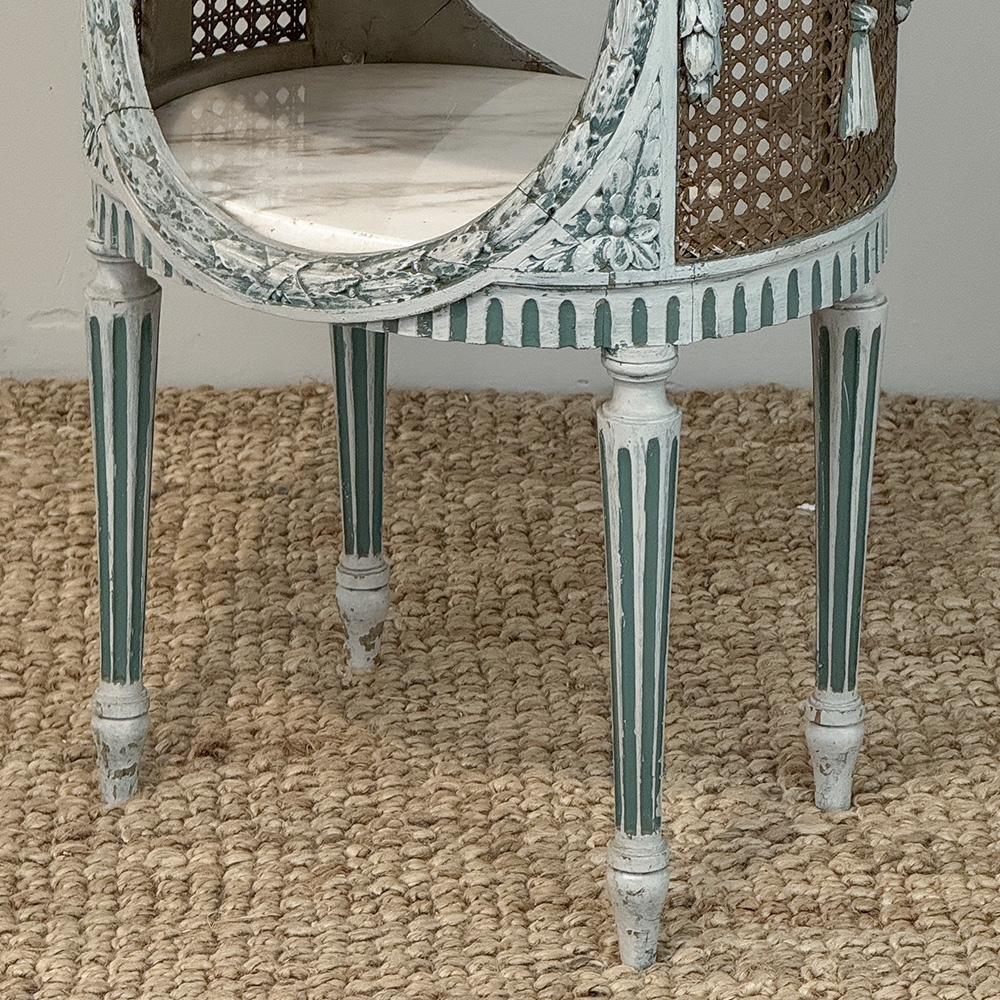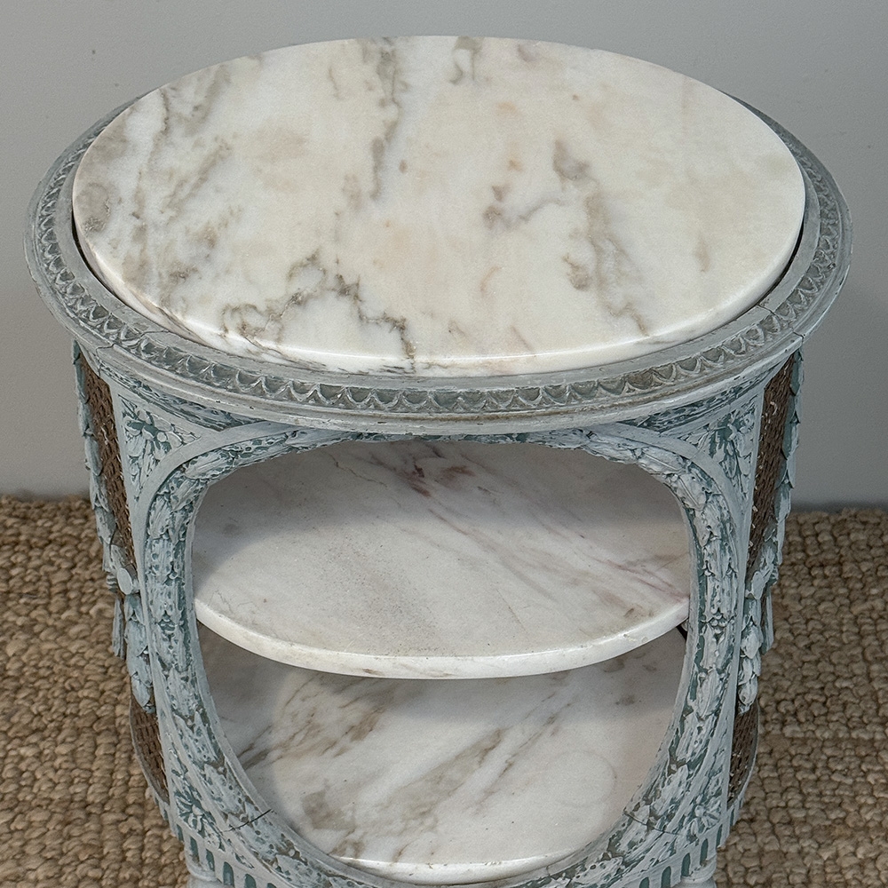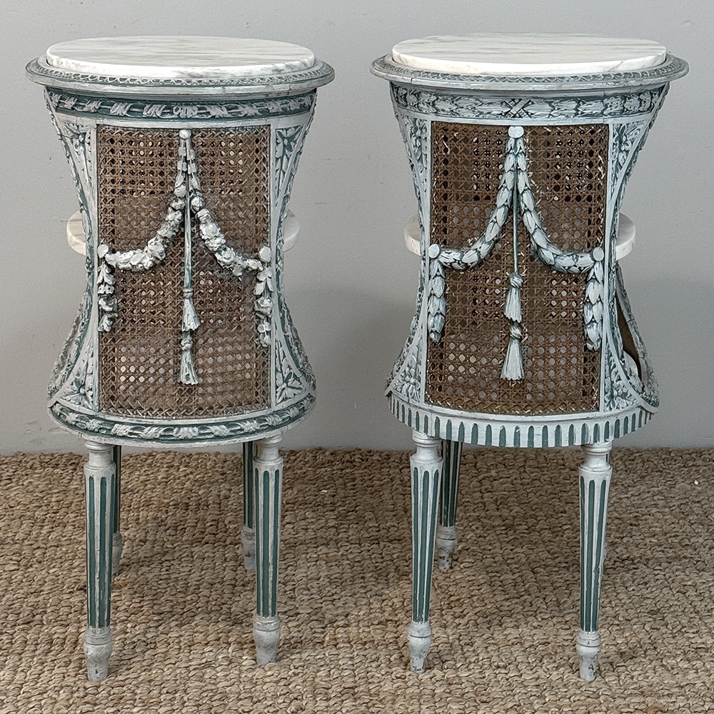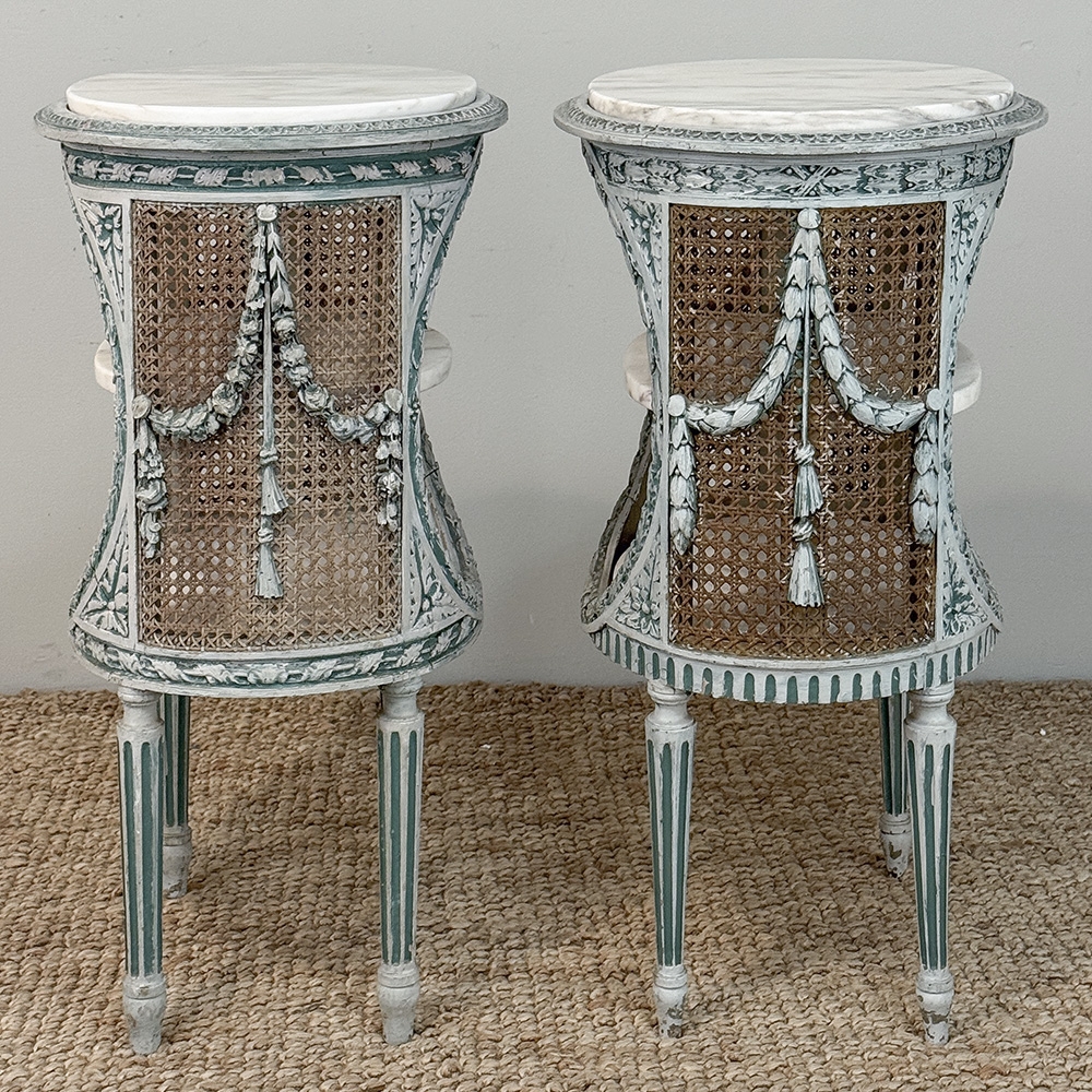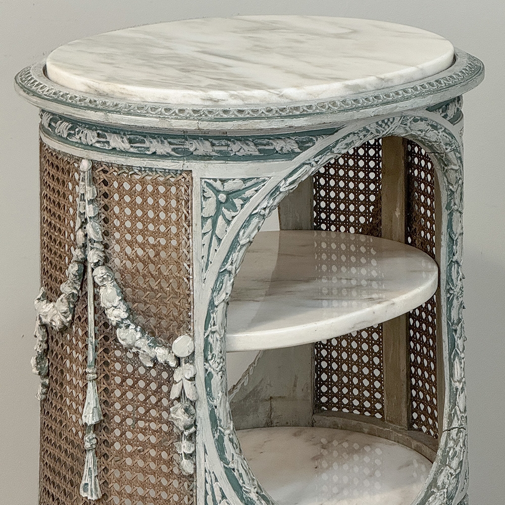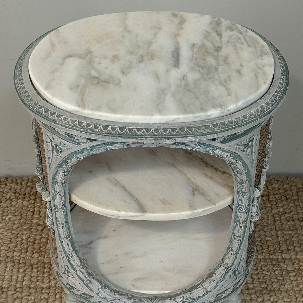 Pair 19th Century French Louis XVI Painted Oval End Tables with Marble are a superlative find! Crafted in the neoclassical style in an oval shape, with oval openings on front and back and caned sides, they are remarkably light in visual impact, yet each provides three marble surfaces for your utter enjoyment. The intricately embellished casework includes laurel bordering underneath the molding surrounding the top marble, with the same laurel bordering motif applied around each oval opening front and back. Rosettes fill the somewhat triangular space between the oval openings and the cane above and below. The openings allow access to the middle and lower marble shelves. The caned sides allow light in and are overlaid with hand-sculpted laurel swags with tassels to add to the amazing detail. A fluted apron below leads the eye to the four tapered and fluted legs. The overall works were painted in a pastel blueish-green with a darker bluish-green used for contrasting highlights. Perfect for placement anywhere in any room!