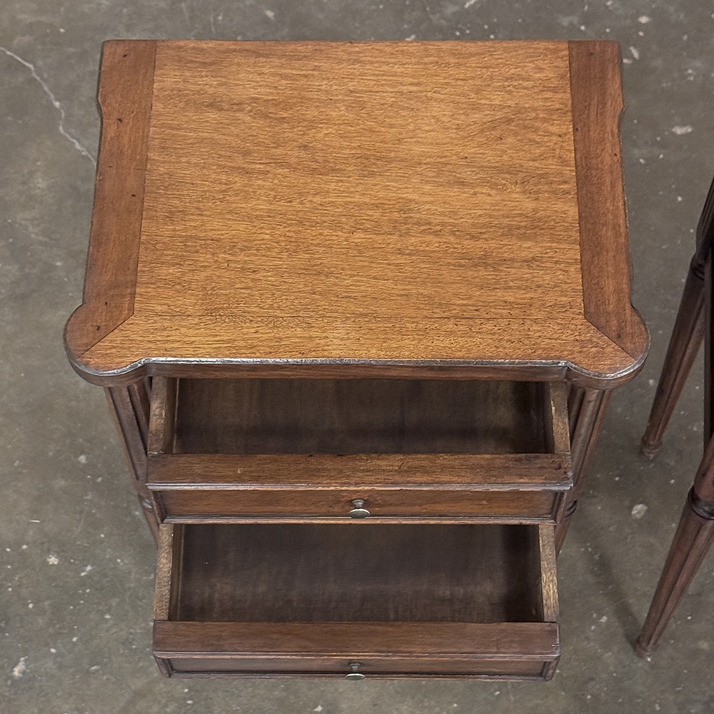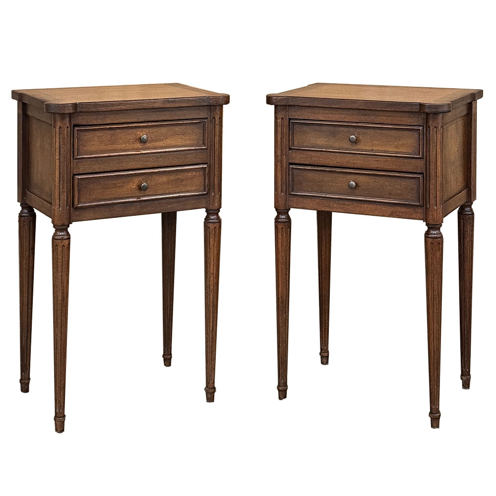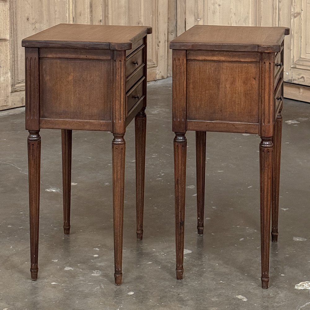 Pair Antique French Directoire ~ Neoclassical End Tables - Nightstands are a tailored expression of the genre, with only the sheer natural beauty of the walnut and stately timeless craftsmanship used to create the look. Ideal for wall placement adjacent to chairs or sofas, the pair can also be used as bedside companions. Each sports a pair of drawers for convenience, plus a nicely sized surface for such diminutive case pieces. The front legs are rounded and fluted, leading the eye to the gracefully tapered legs below. The Directoire style is celebrated for its ability to work with a wide variety of designs, thanks to the neoclassical origins of its architecture.