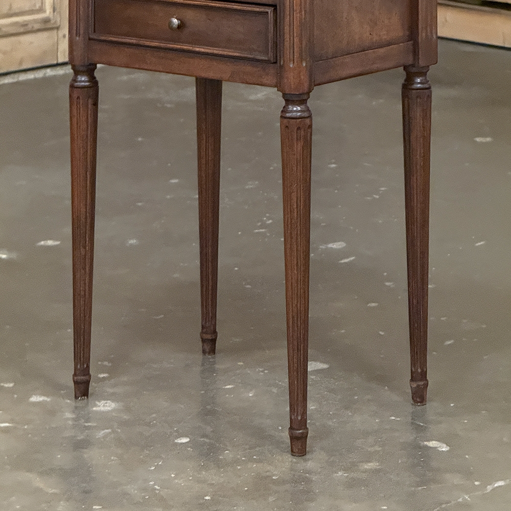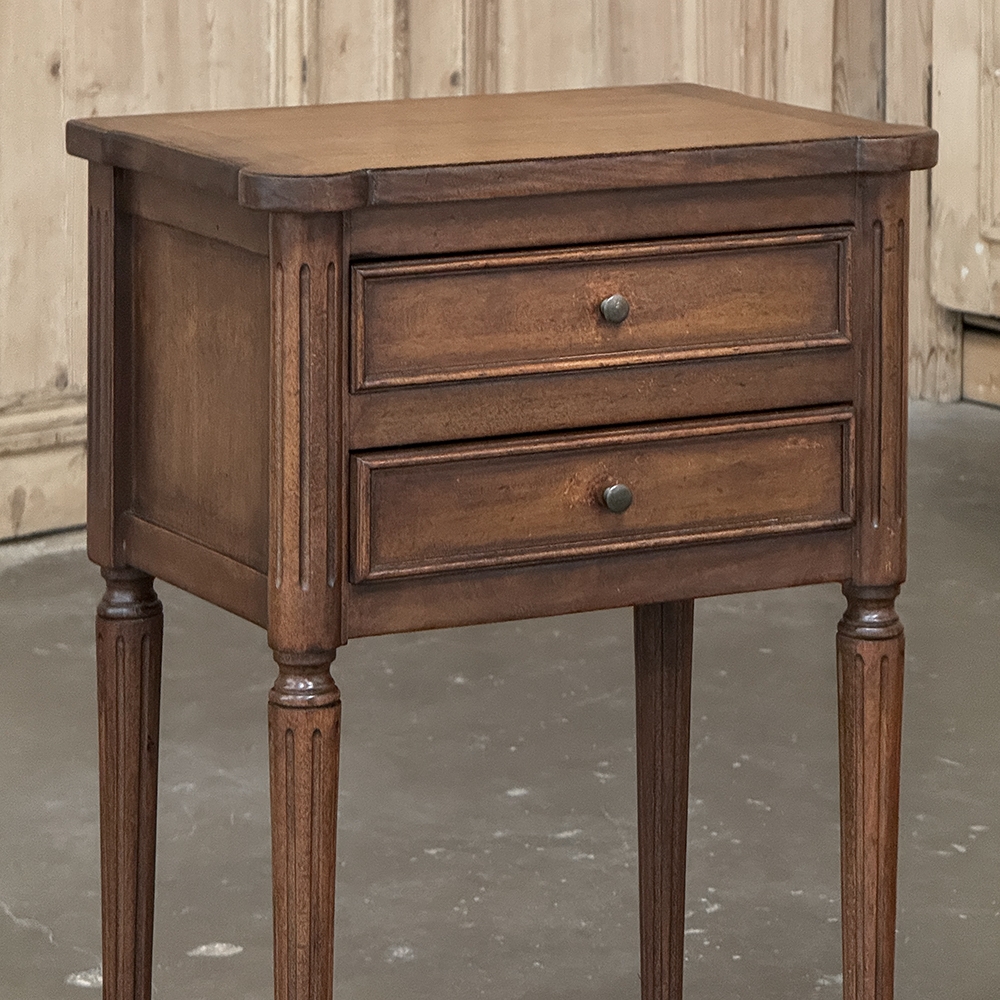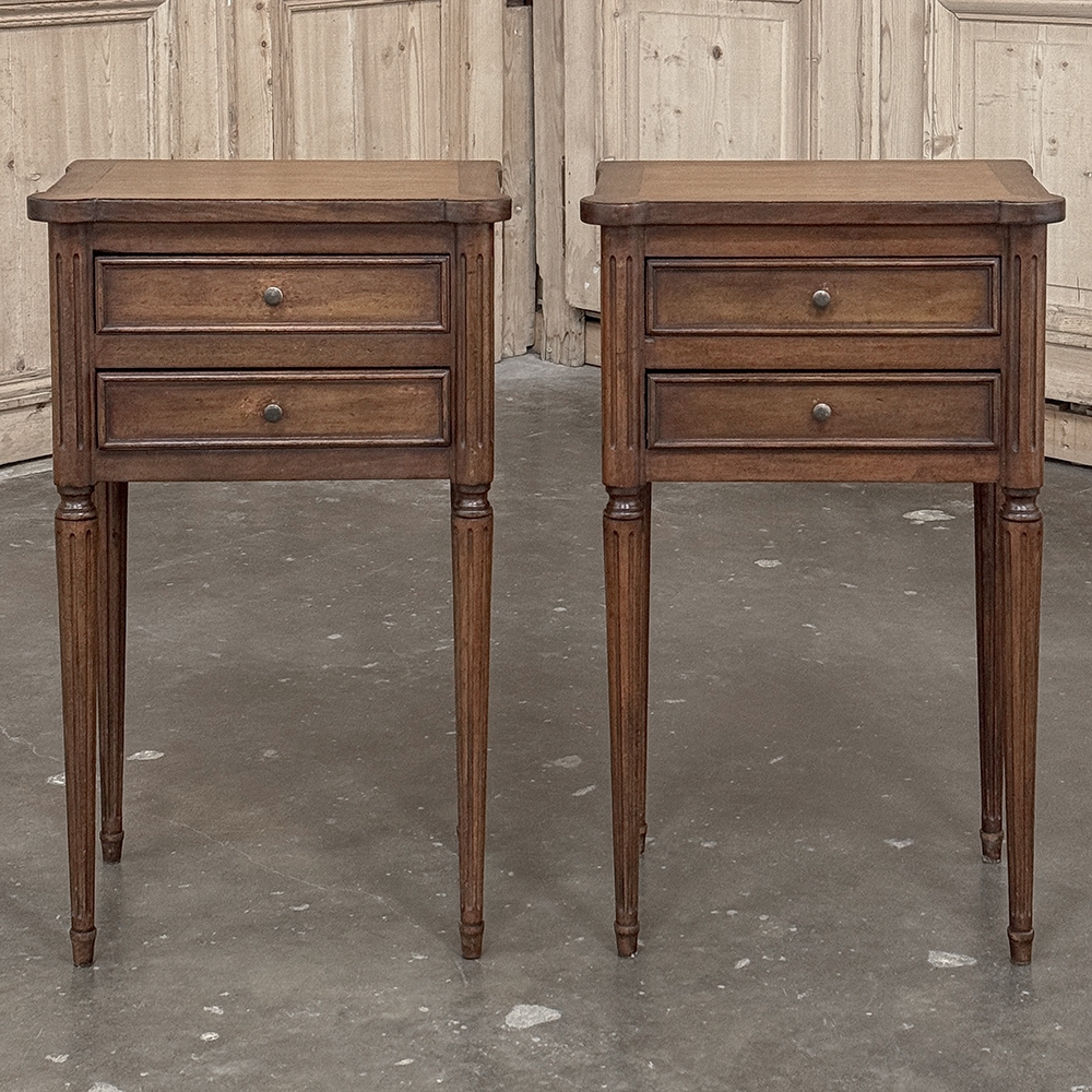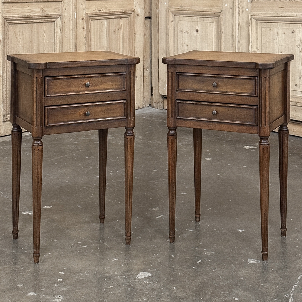 Pair Antique French Directoire ~ Neoclassical End Tables - Nightstands are a tailored expression of the genre, with only the sheer natural beauty of the walnut and stately timeless craftsmanship used to create the look. Ideal for wall placement adjacent to chairs or sofas, the pair can also be used as bedside companions. Each sports a pair of drawers for convenience, plus a nicely sized surface for such diminutive case pieces. The front legs are rounded and fluted, leading the eye to the gracefully tapered legs below. The Directoire style is celebrated for its ability to work with a wide variety of designs, thanks to the neoclassical origins of its architecture.