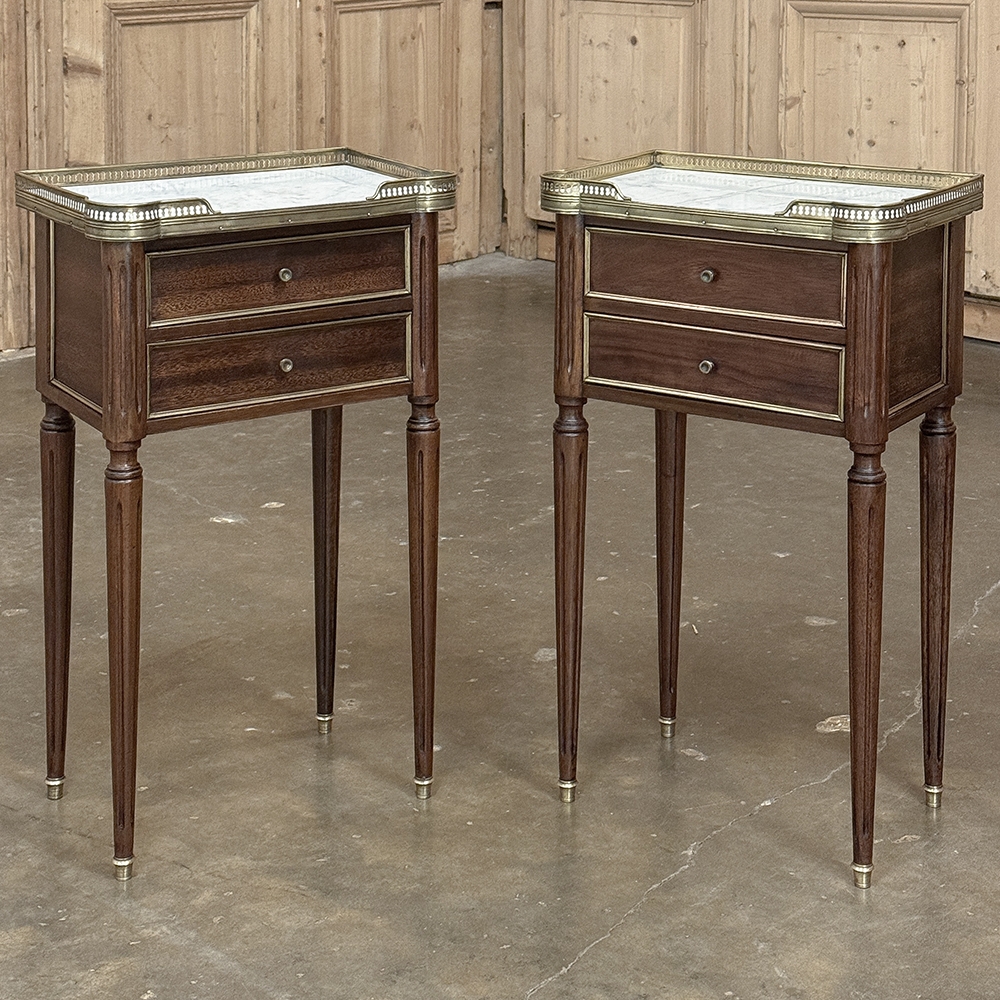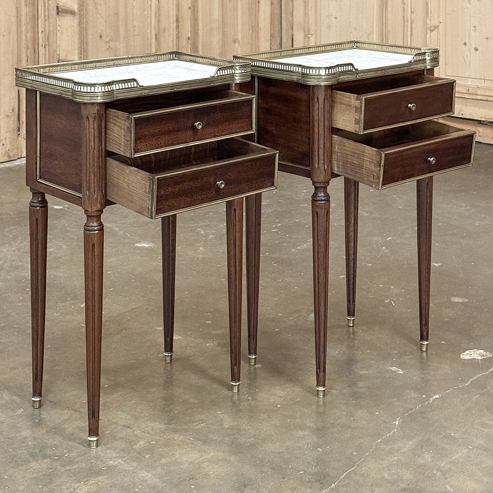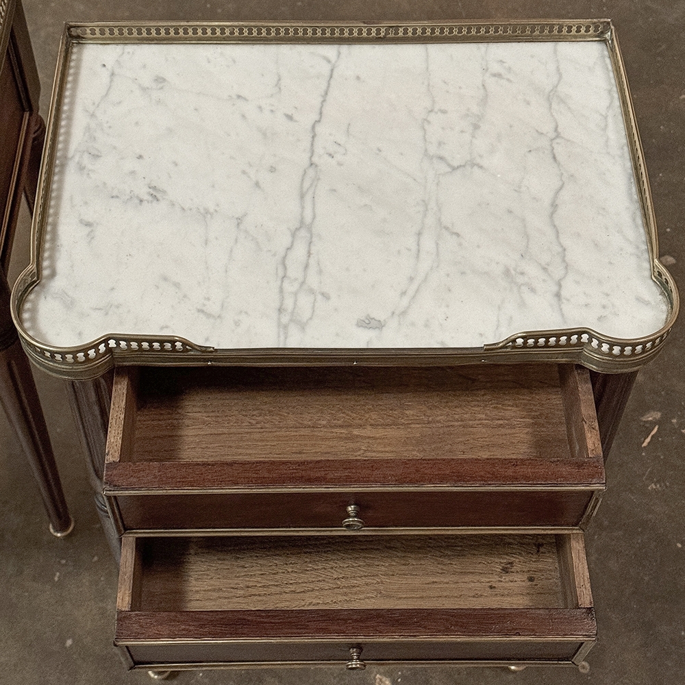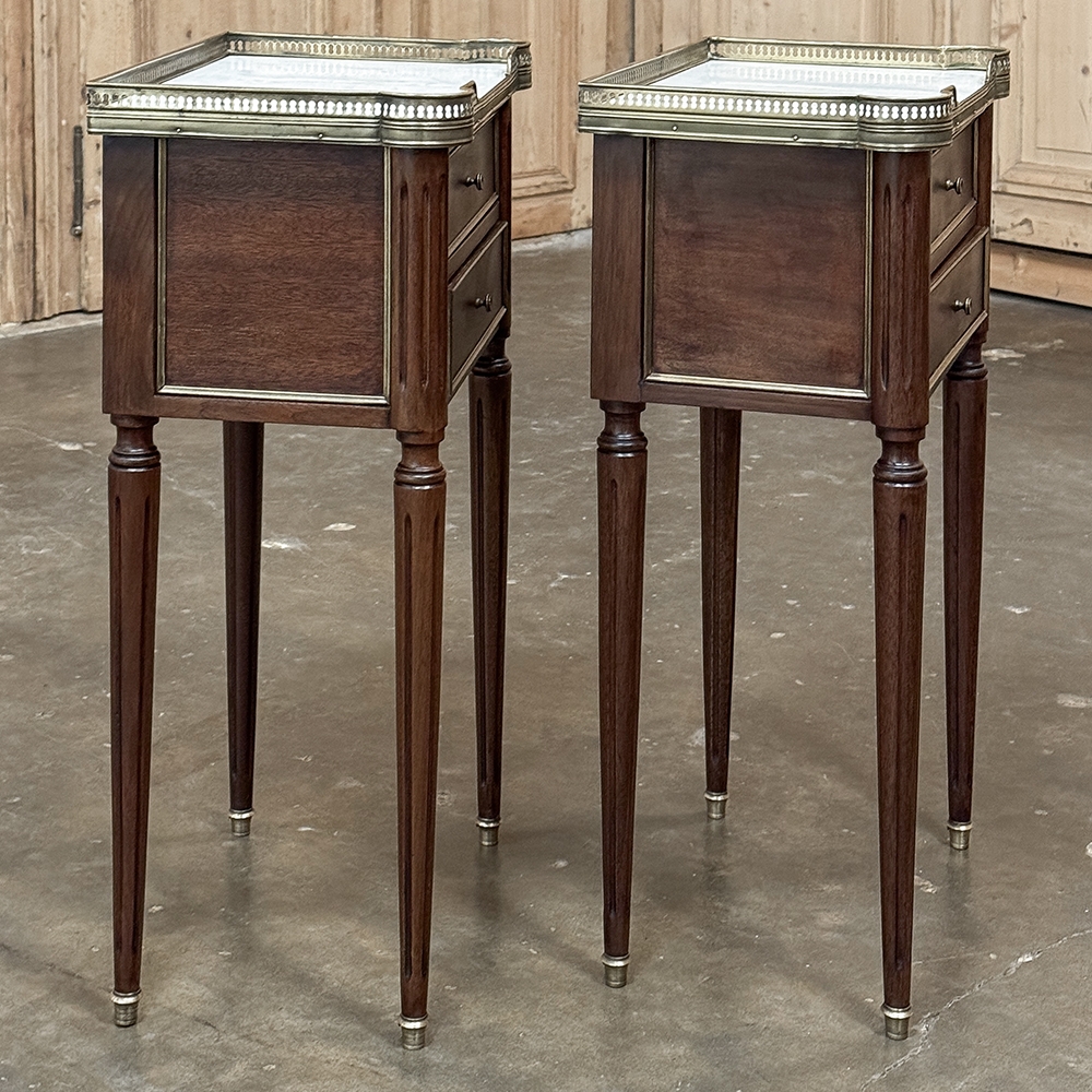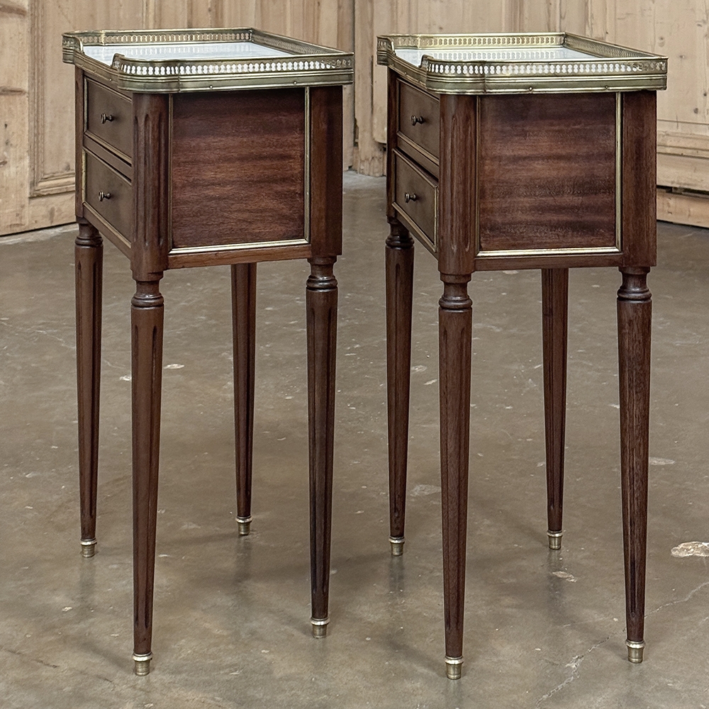 Pair Antique French Directoire Style End Tables with Carrara Marble will make the perfect finishing touch to any seating group, or even as compact bedside companions for a cozy bedroom! Hand-crafted from exotic imported mahogany, each features a tailored design accented with brass molding trim, with a pair of drawers fitted with brass knobs allowing the richness and sheer natural beauty of the wood to shine forth. Rounded front corners with flutes create a shape mirrored by the Carrara marble on top fitted with a pierced brass rail to keep things in place and do it in style! Tapered and fluted legs with brass tips complete the look.