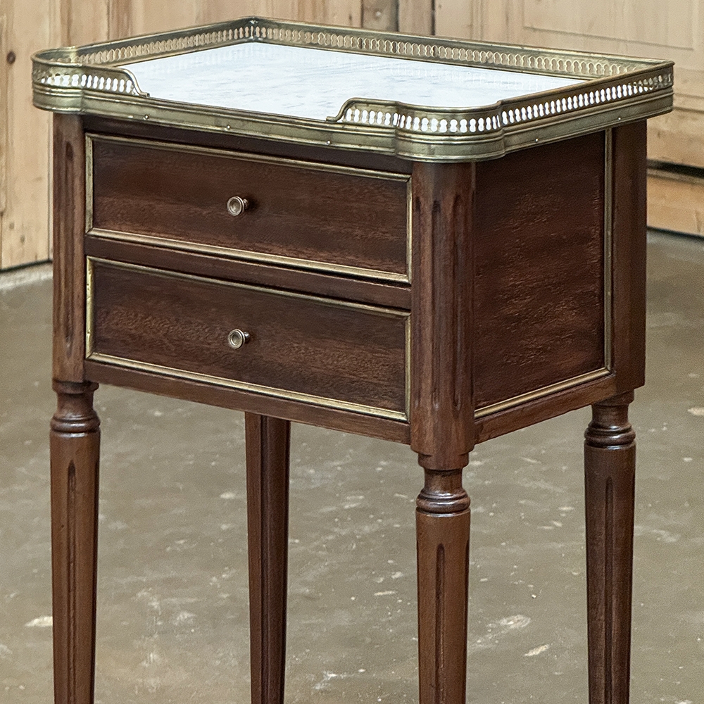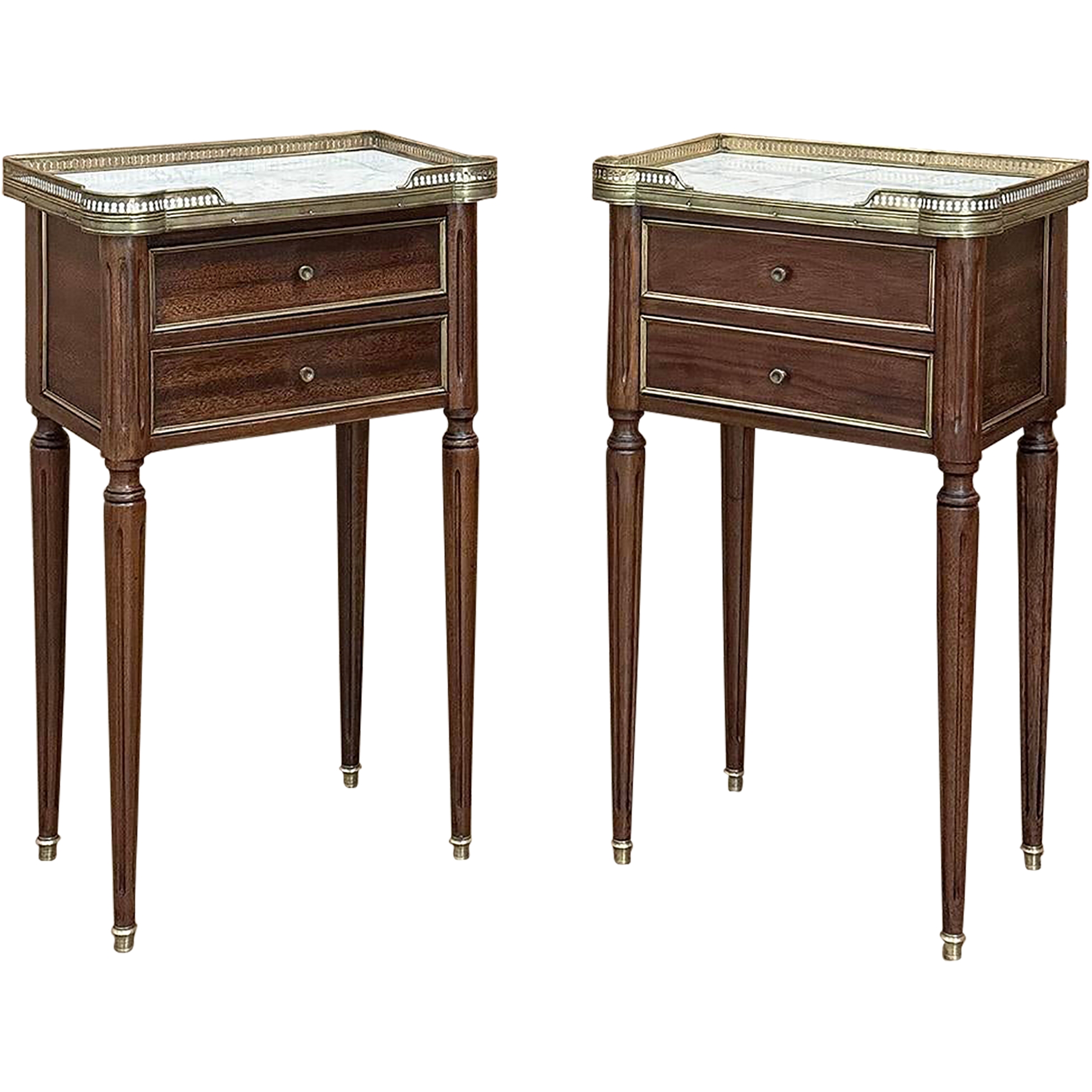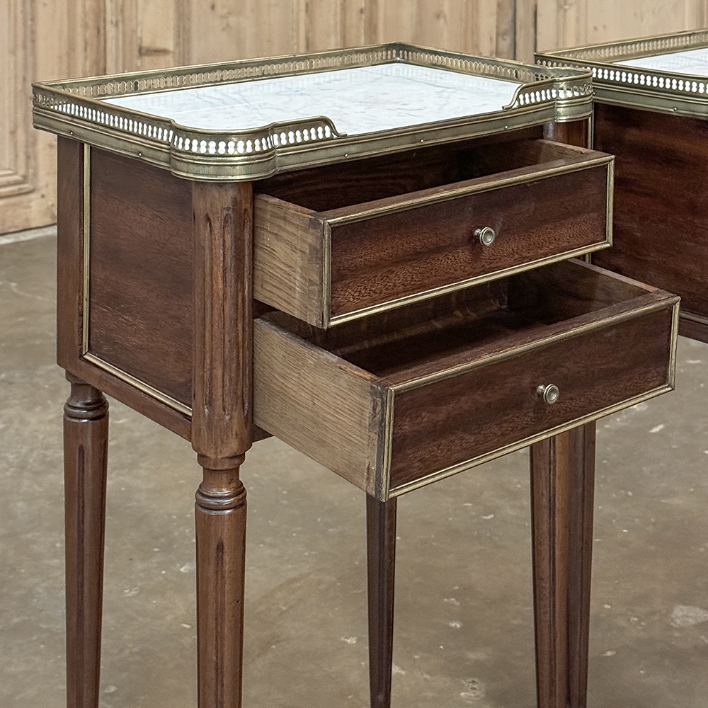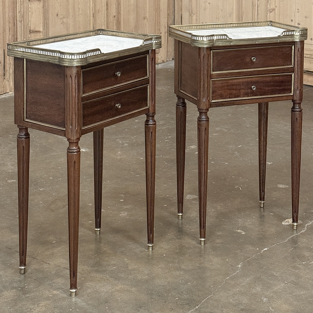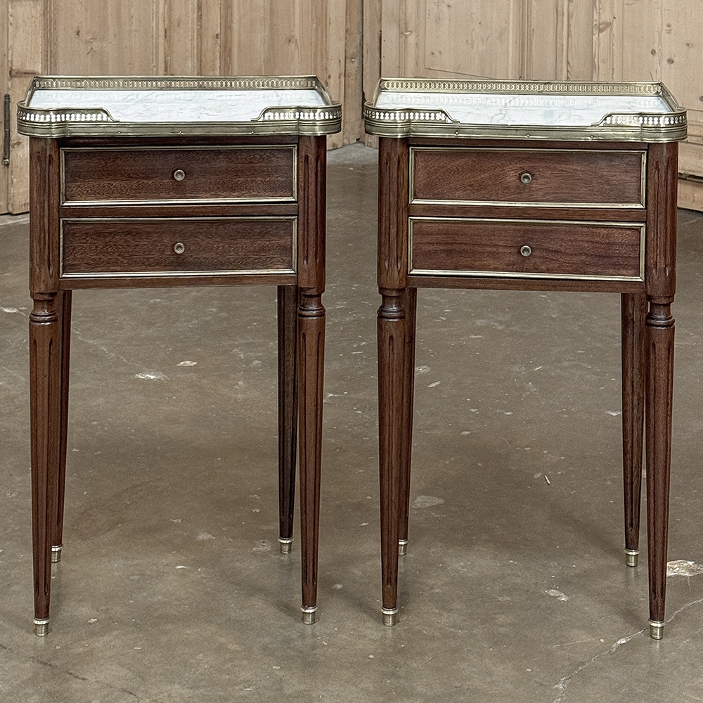 Pair Antique French Directoire Style End Tables with Carrara Marble will make the perfect finishing touch to any seating group, or even as compact bedside companions for a cozy bedroom! Hand-crafted from exotic imported mahogany, each features a tailored design accented with brass molding trim, with a pair of drawers fitted with brass knobs allowing the richness and sheer natural beauty of the wood to shine forth. Rounded front corners with flutes create a shape mirrored by the Carrara marble on top fitted with a pierced brass rail to keep things in place and do it in style! Tapered and fluted legs with brass tips complete the look.
