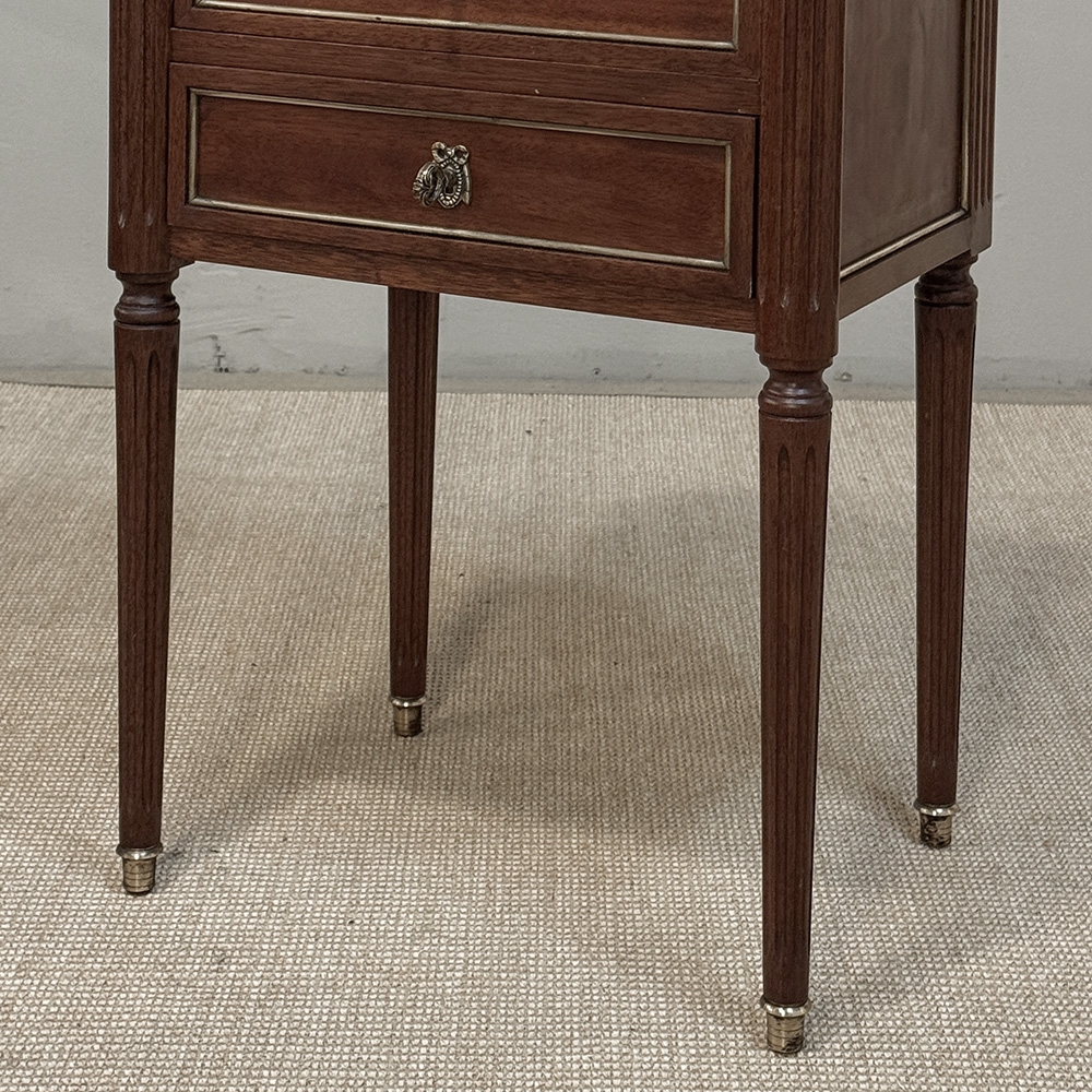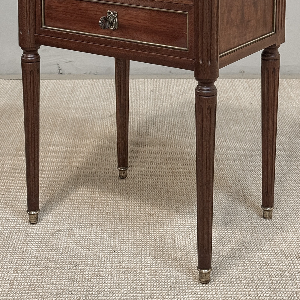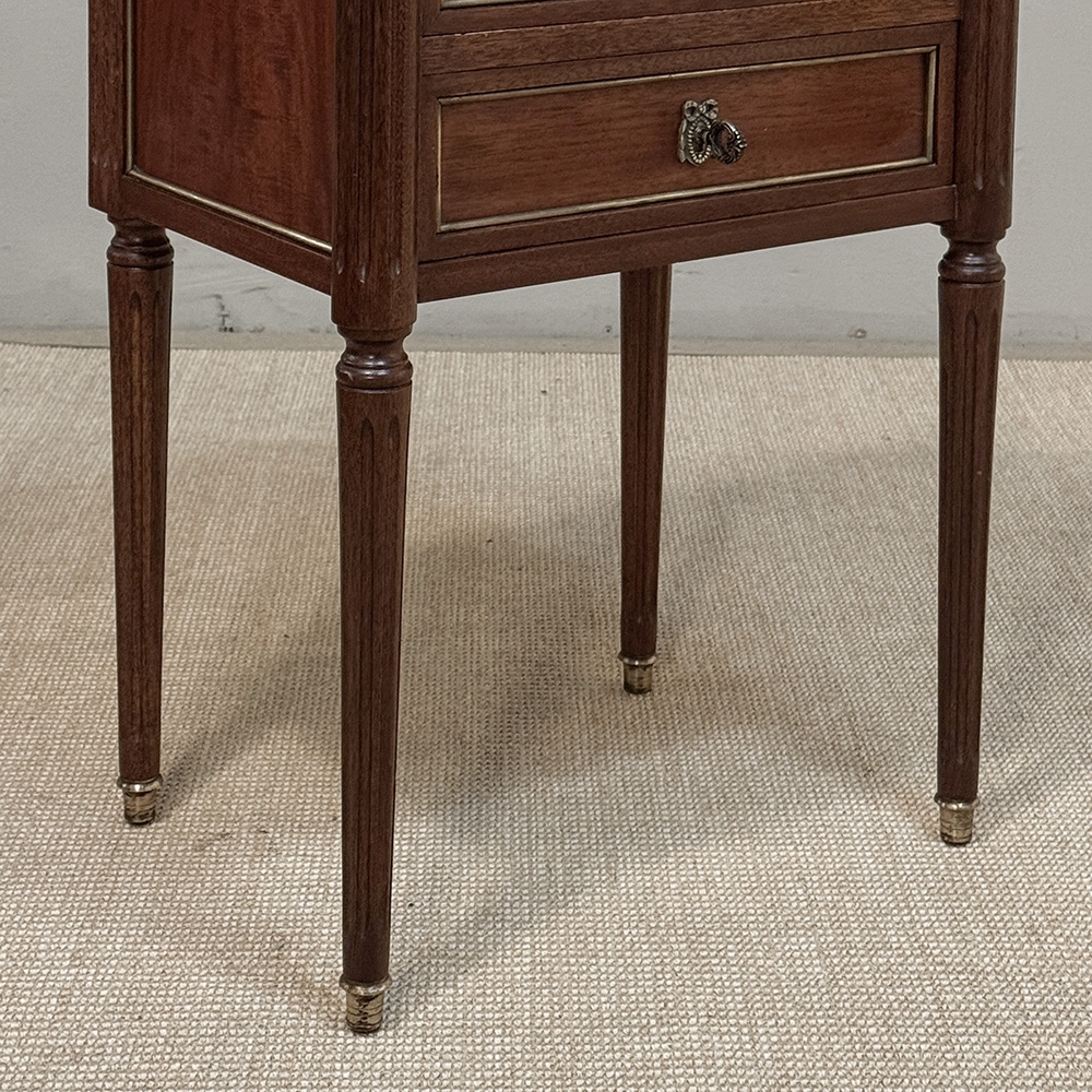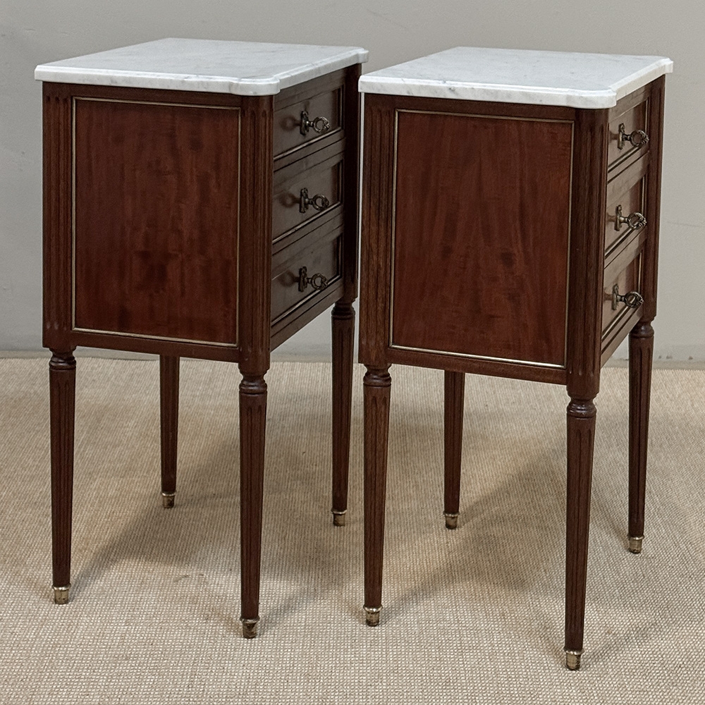 A distinguished pair of French Louis XVI style nightstands from the early twentieth century, reflecting the refined, tailored aesthetic associated with the work of Maison Jansen. The design is deliberate and architectural, with clean lines and balanced proportions that allow the richness of the mahogany to speak with quiet authority.