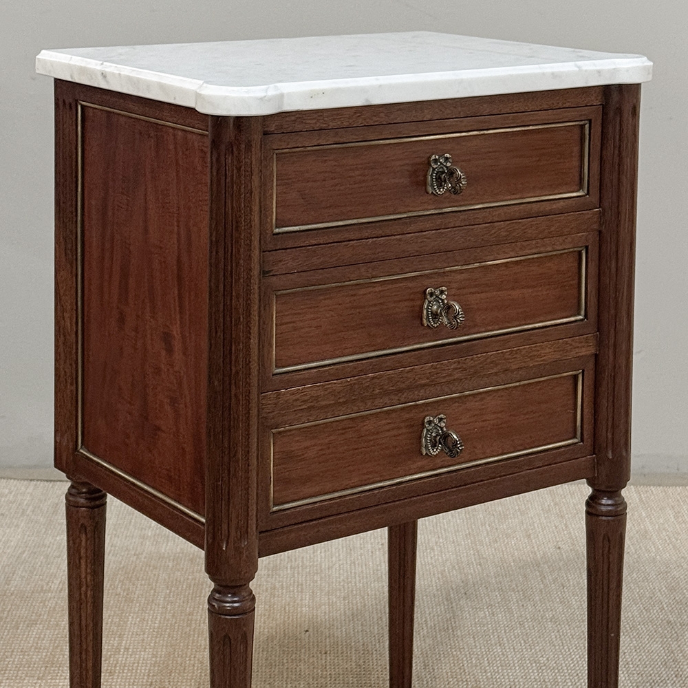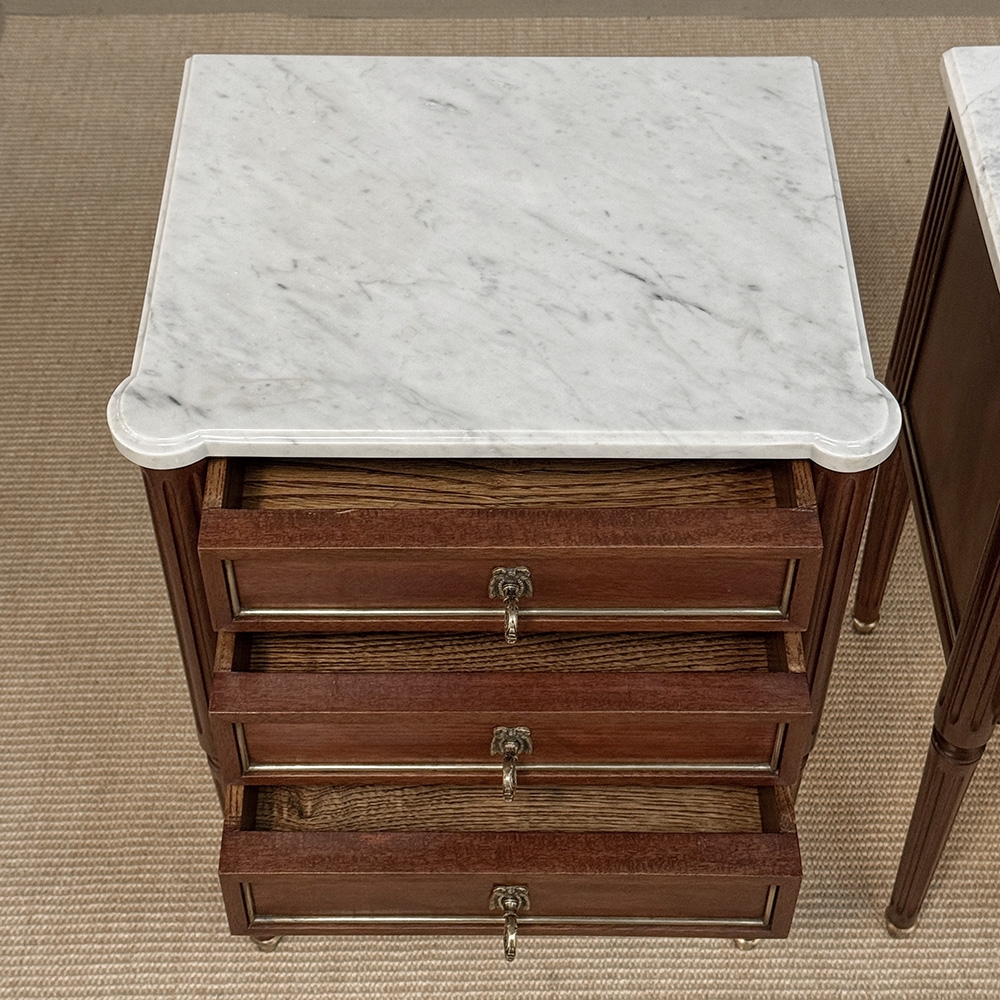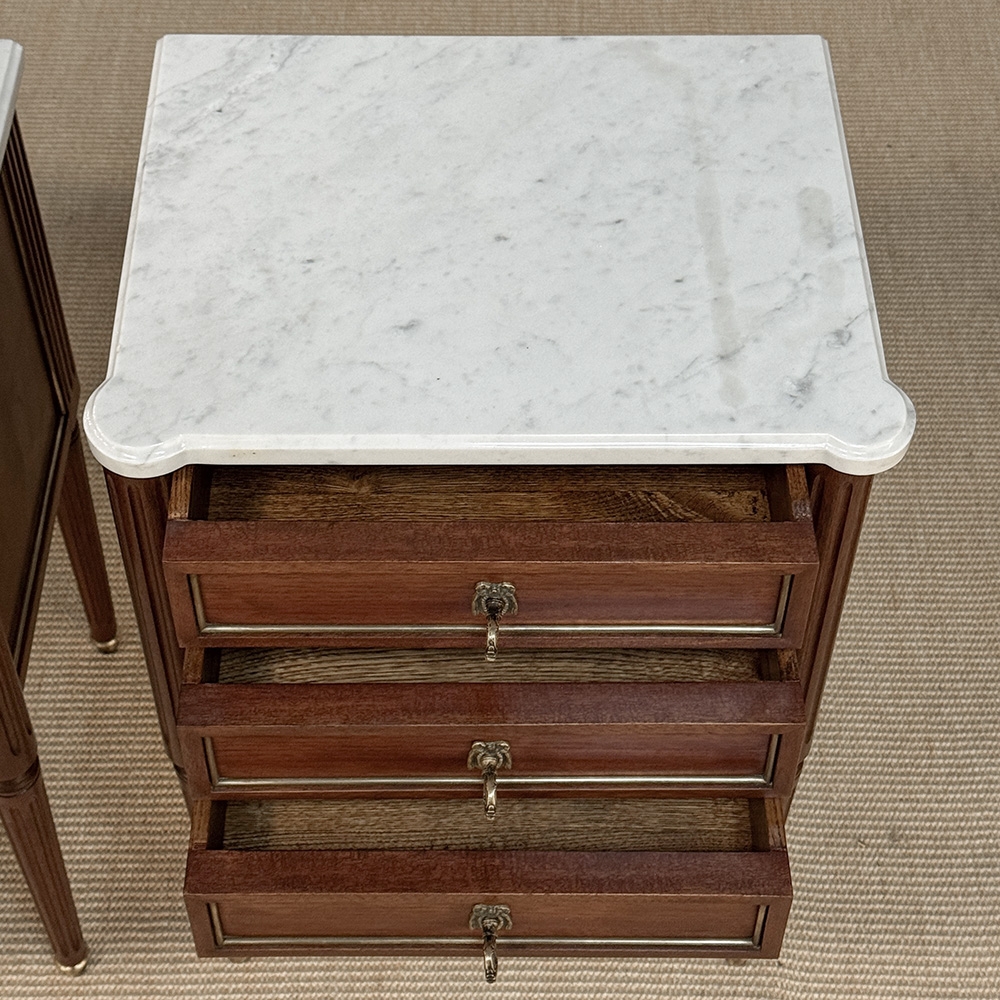 Pair Early 20th Century French Louis XVI Style Mahogany Marble Top Nightstands in the Manner of Maison Jansen