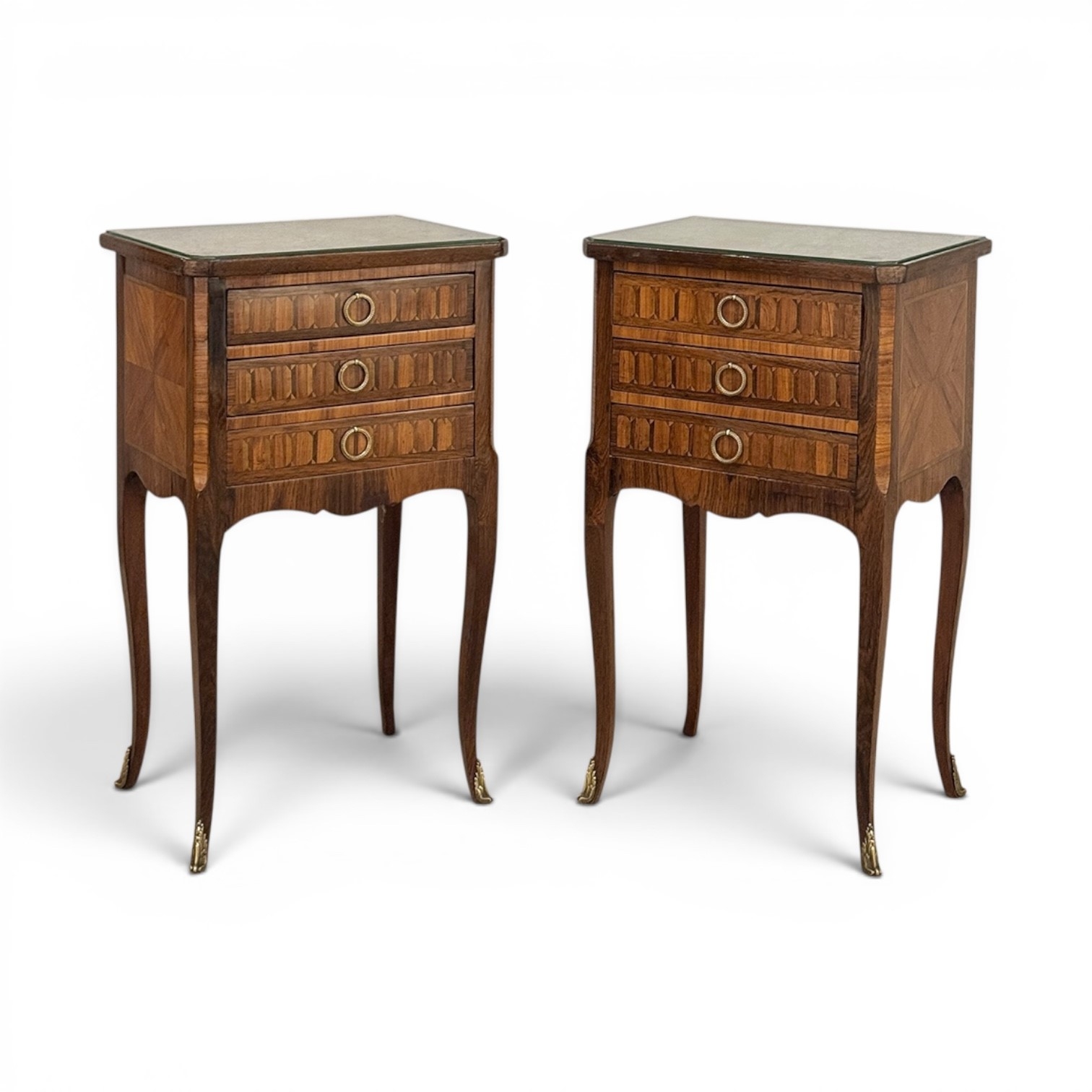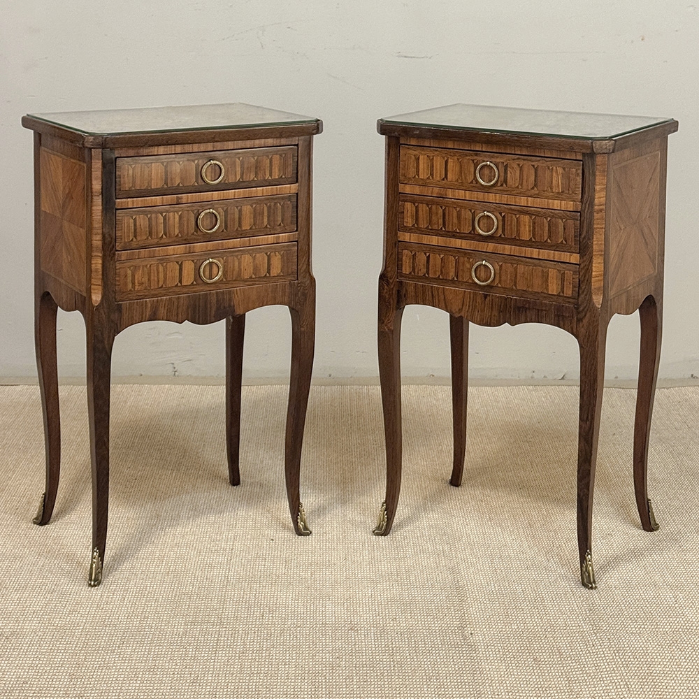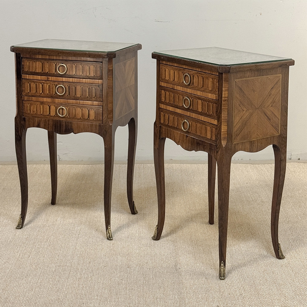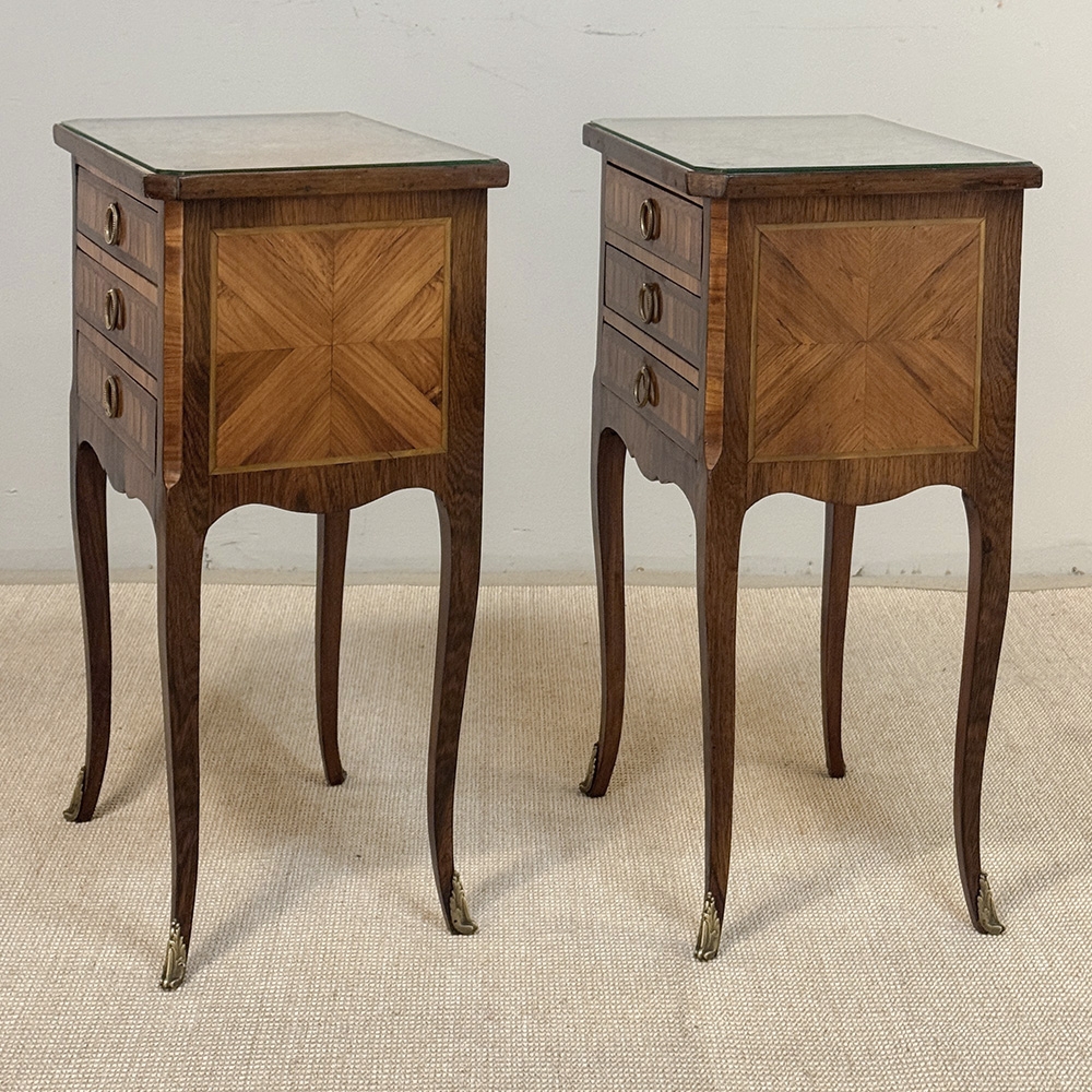 An elegant pair of French Marble Top Marquetry Side Tables ~ Nightstands, each fitted with three drawers and raised on slender cabriole legs ending in delicate bronze sabots. The casework is beautifully proportioned, with a light, refined presence that is heightened by the graceful curve of the legs and the tailored scale. Richly figured veneers and intricate marquetry lend the pair depth, movement, and that unmistakable sense of French sophistication.