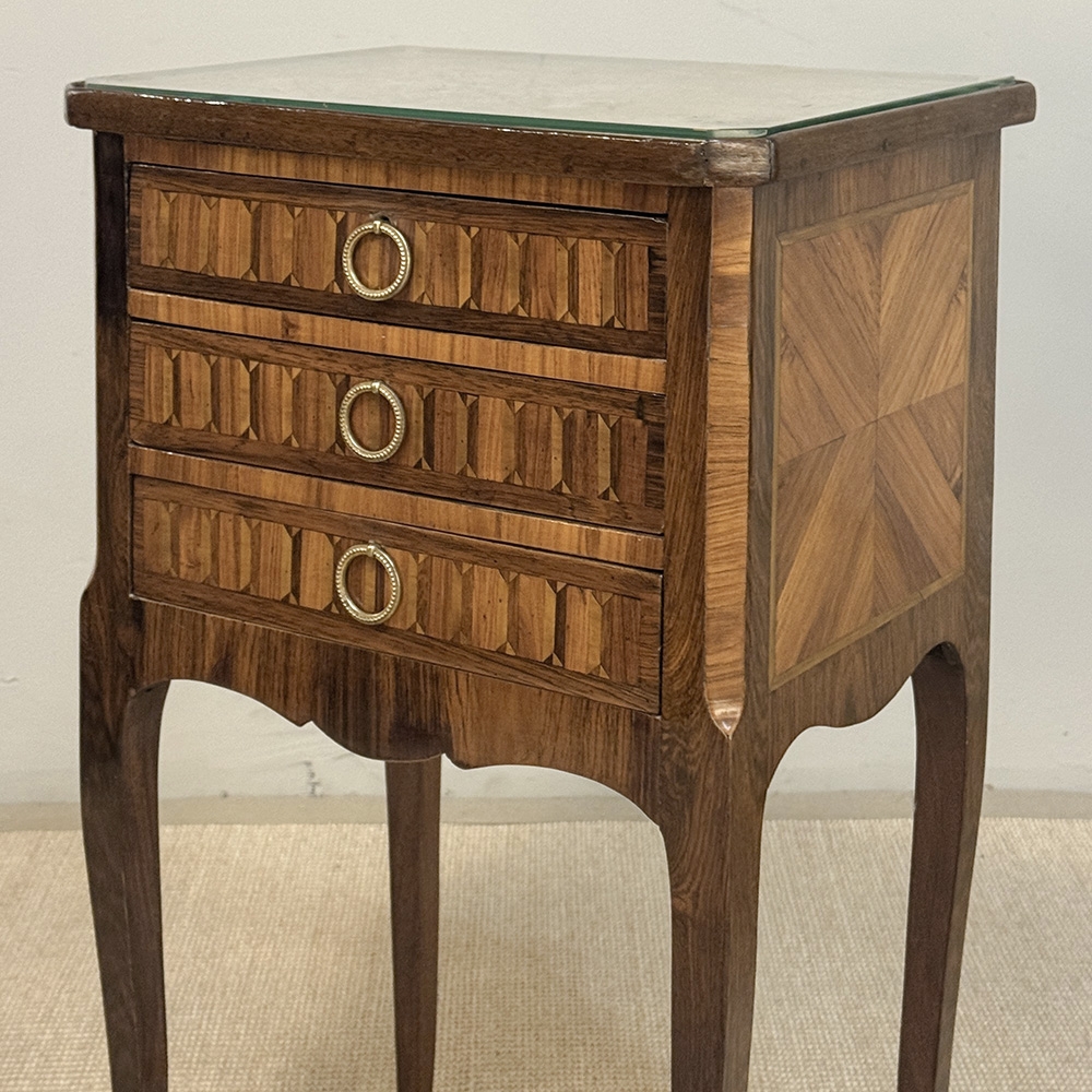 Each table is crowned with a richly veined marble top and retains its original glass protector, preserving the beauty of the marquetry beneath while adding another layer of polish to the design. Three drawers add wonderful convenience, and each drawer front is accented with bronze ring pulls, while the side panels are finished with complementary inlay that makes the pair feel considered from every angle. Elegant and versatile, they bring warmth, craftsmanship, and quiet luxury to a room.