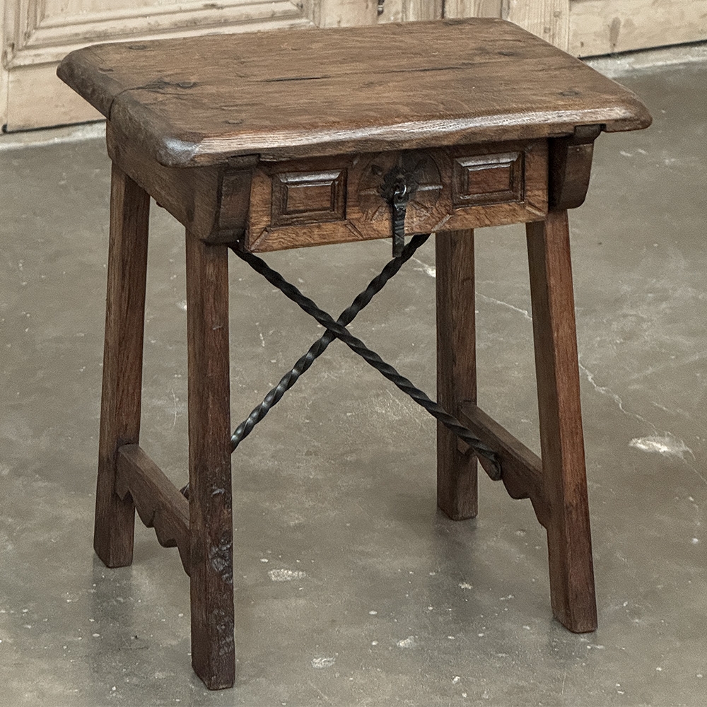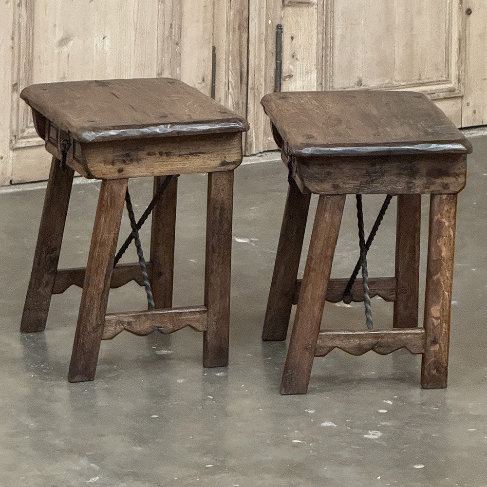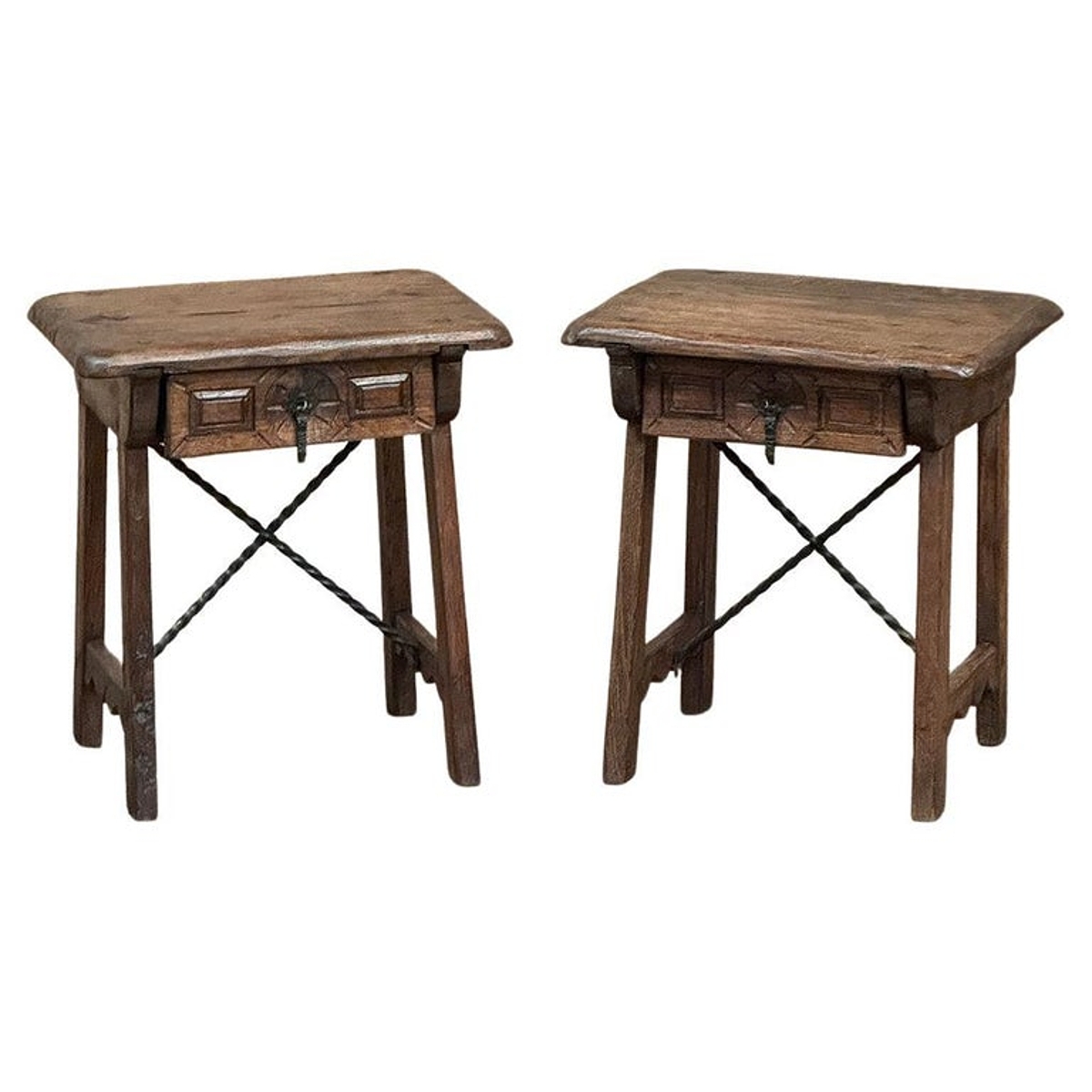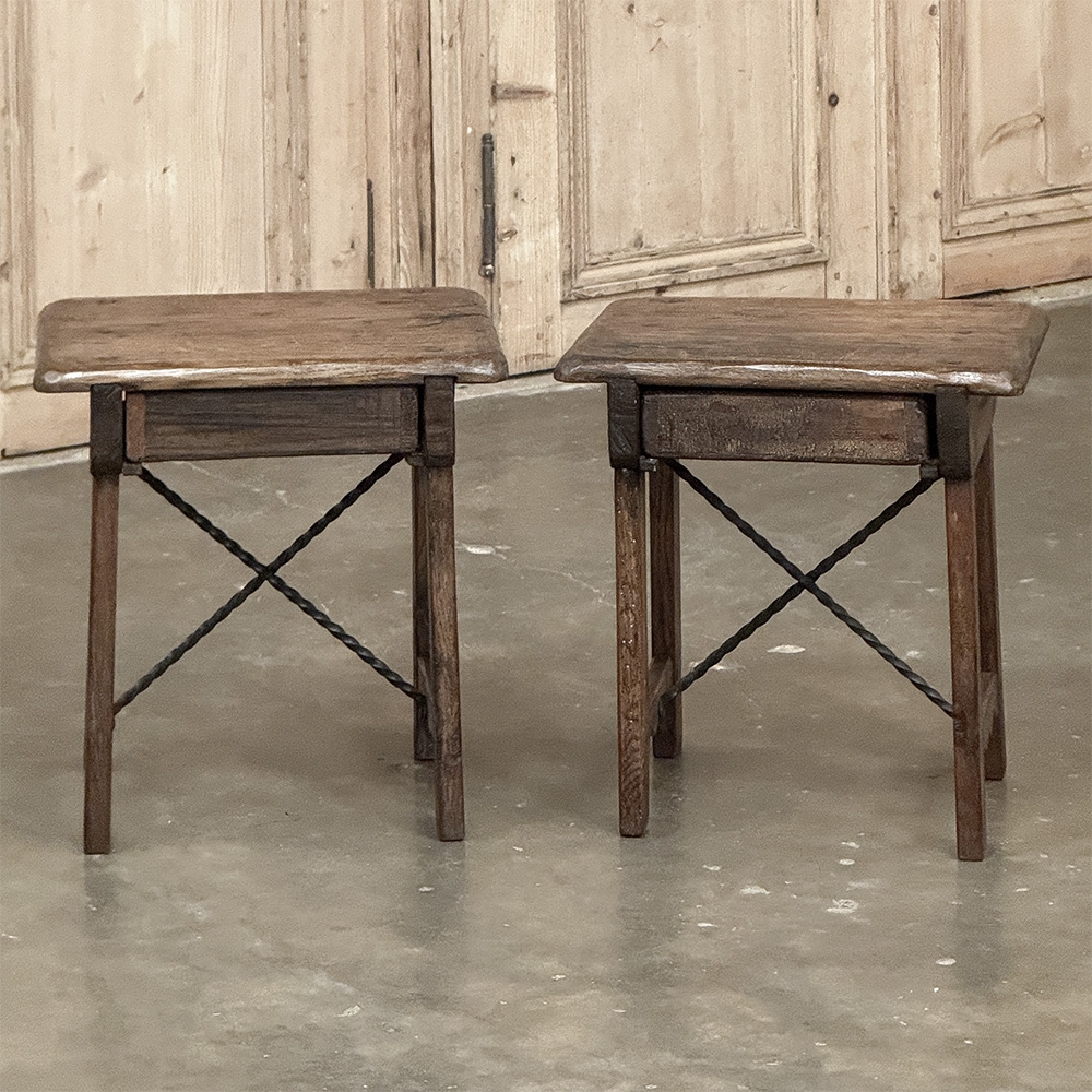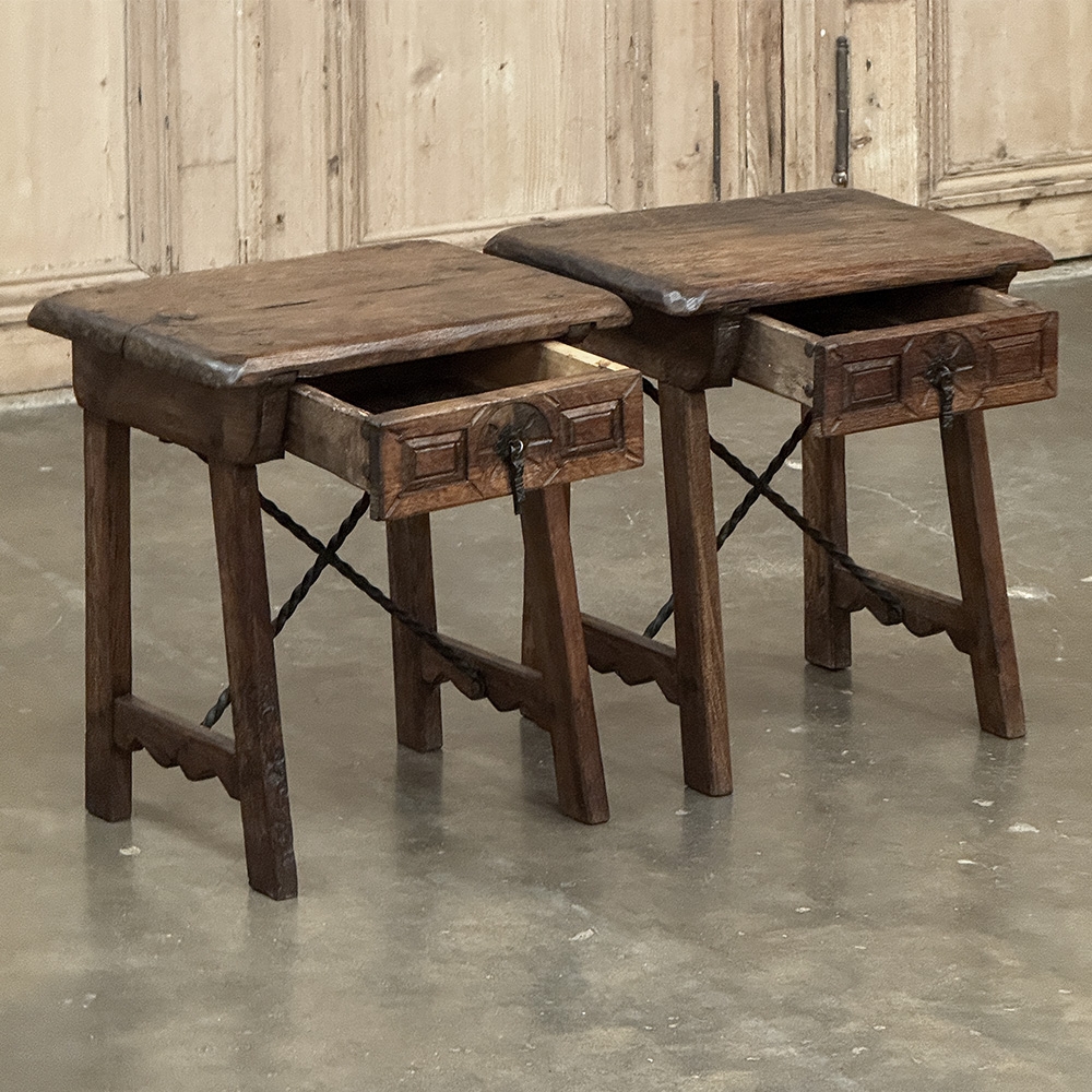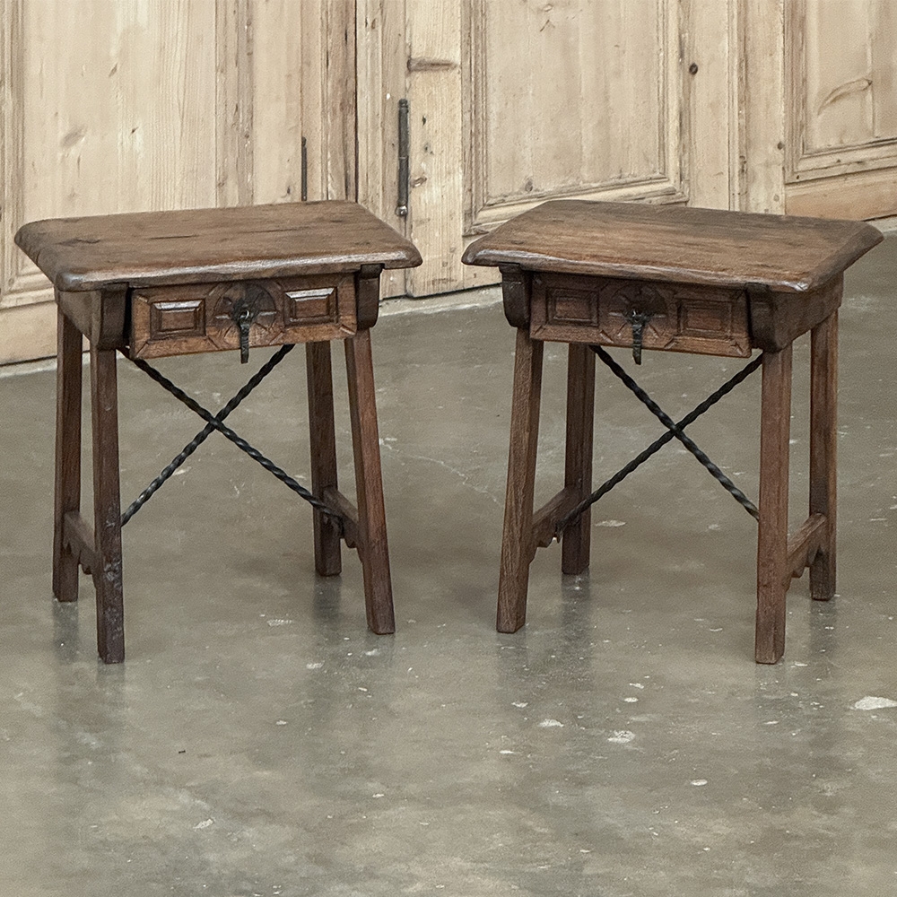 Pair Rustic Spanish End Tables with Wrought Iron are ideal for the Southwest Decor, or any relaxed or rustic design. Hand-crafted from solid oak, each was made to last for decades, and consists of a solid plank top and splayed legs which add stability, especially when reinforced by a scalloped stretcher and twisted iron crossbars below, which also add visual flair. Iron pendant pulls on the convenient drawers add a nice touch. Finished all around, they're destined to be your favorite accompaniment to any seating group or bedroom set.
