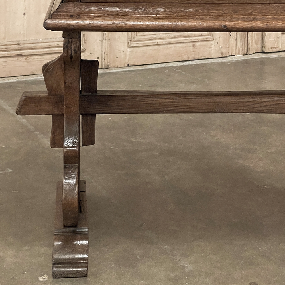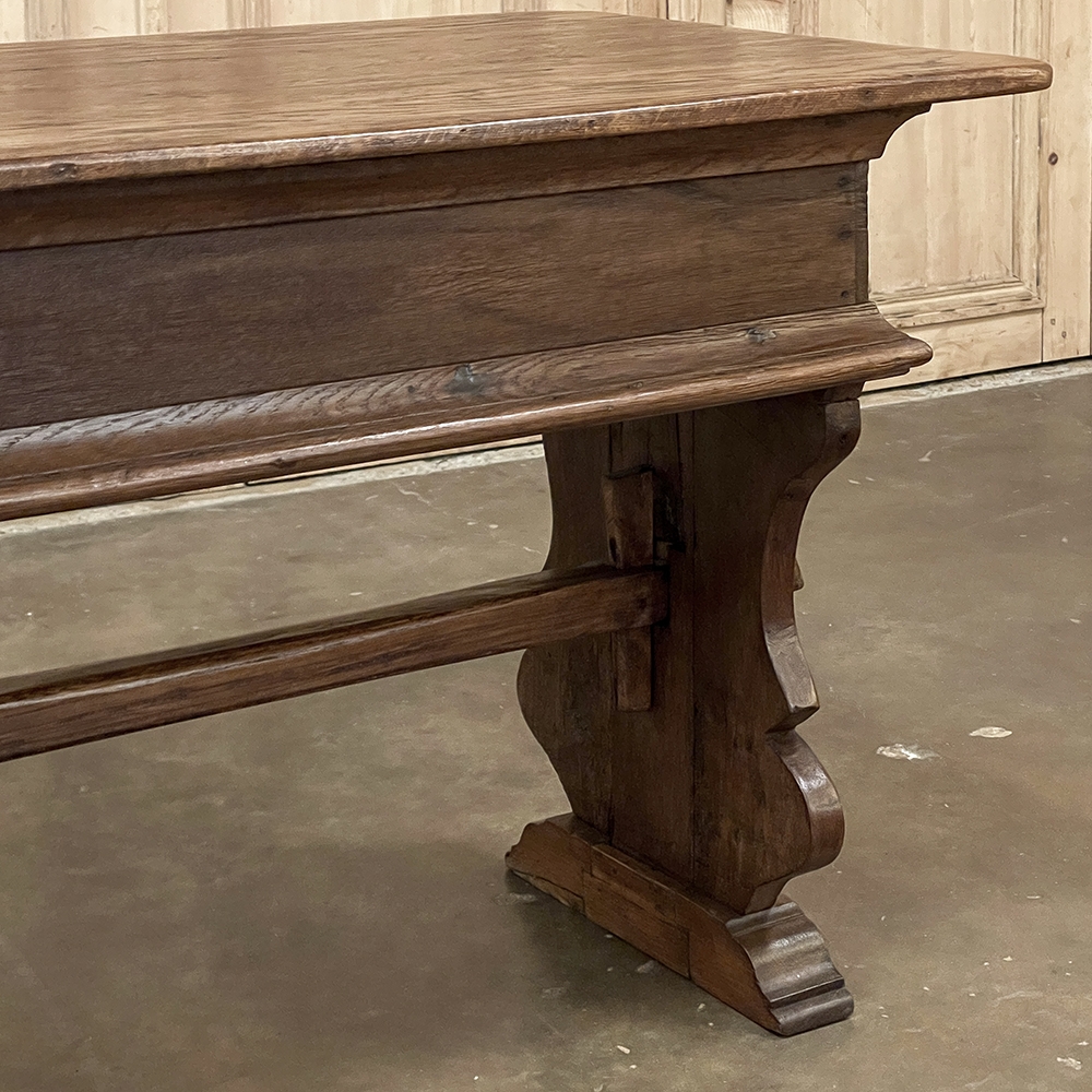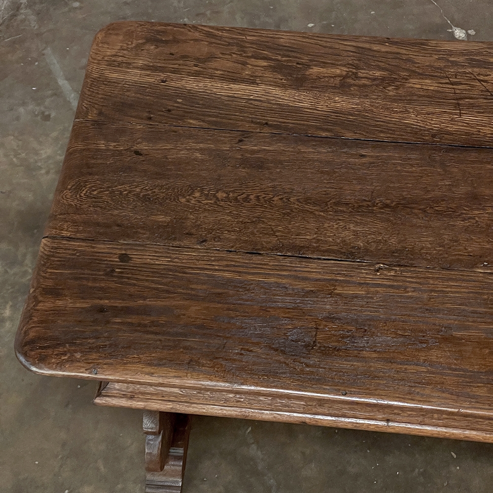 Rustic 19th Century Spanish End Table was completely hand-crafted from old-growth oak to last for centuries! Solid planks with rounded corners form the top, with a sturdy plank casework below that houses a surprisingly capacious single drawer fitted with a turned knob. A tier of molding defines the upper and lower edges of the case, which is supported by two side panels shaped to resemble vases, which are then mounted with contoured skids serving as feet, and connected by a beam fully mortised through each panel then double shimmed for sturdiness that will last for ages!