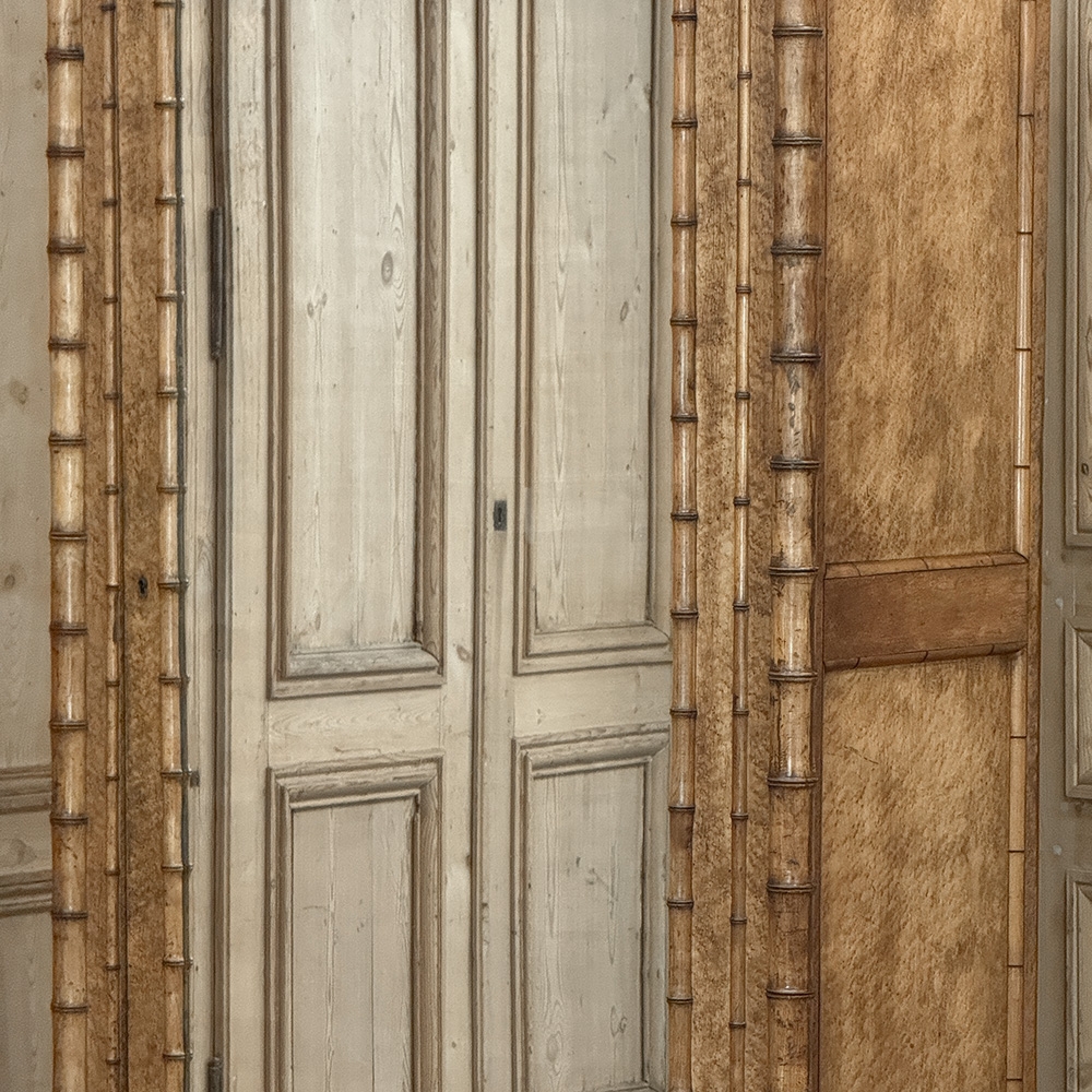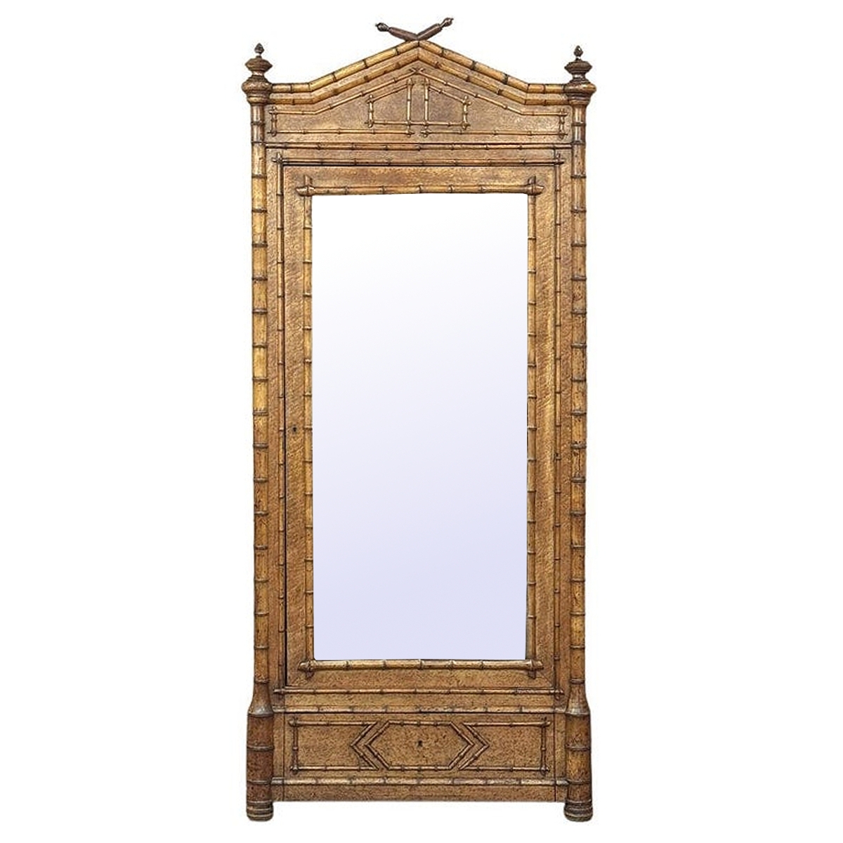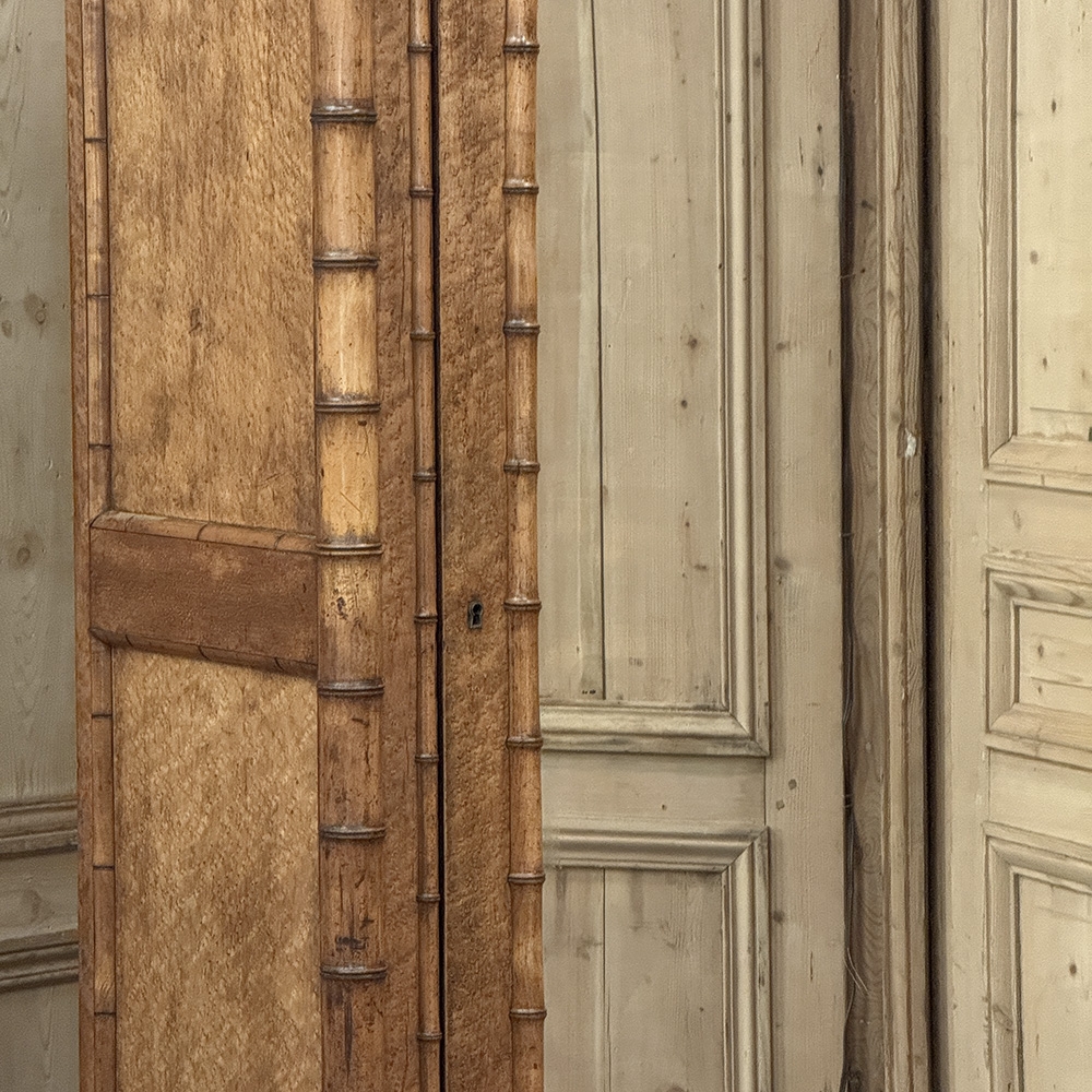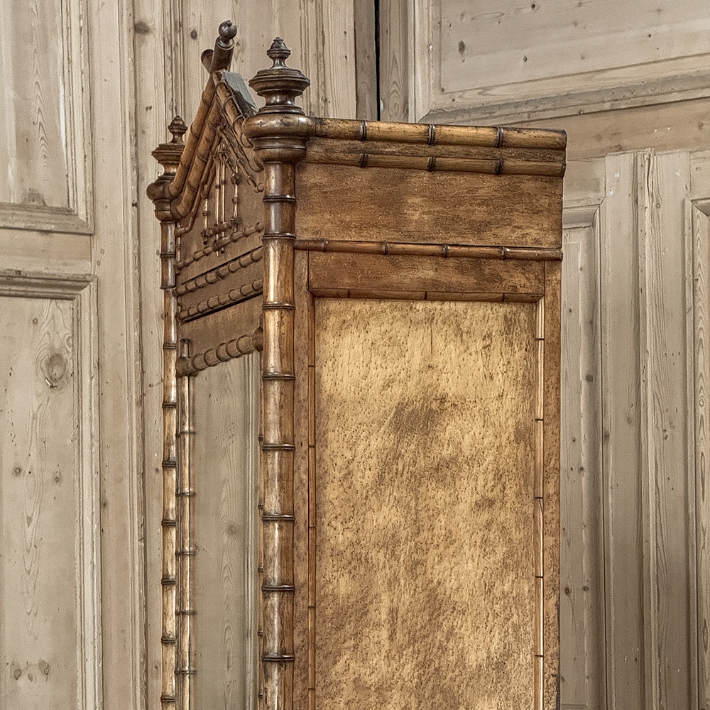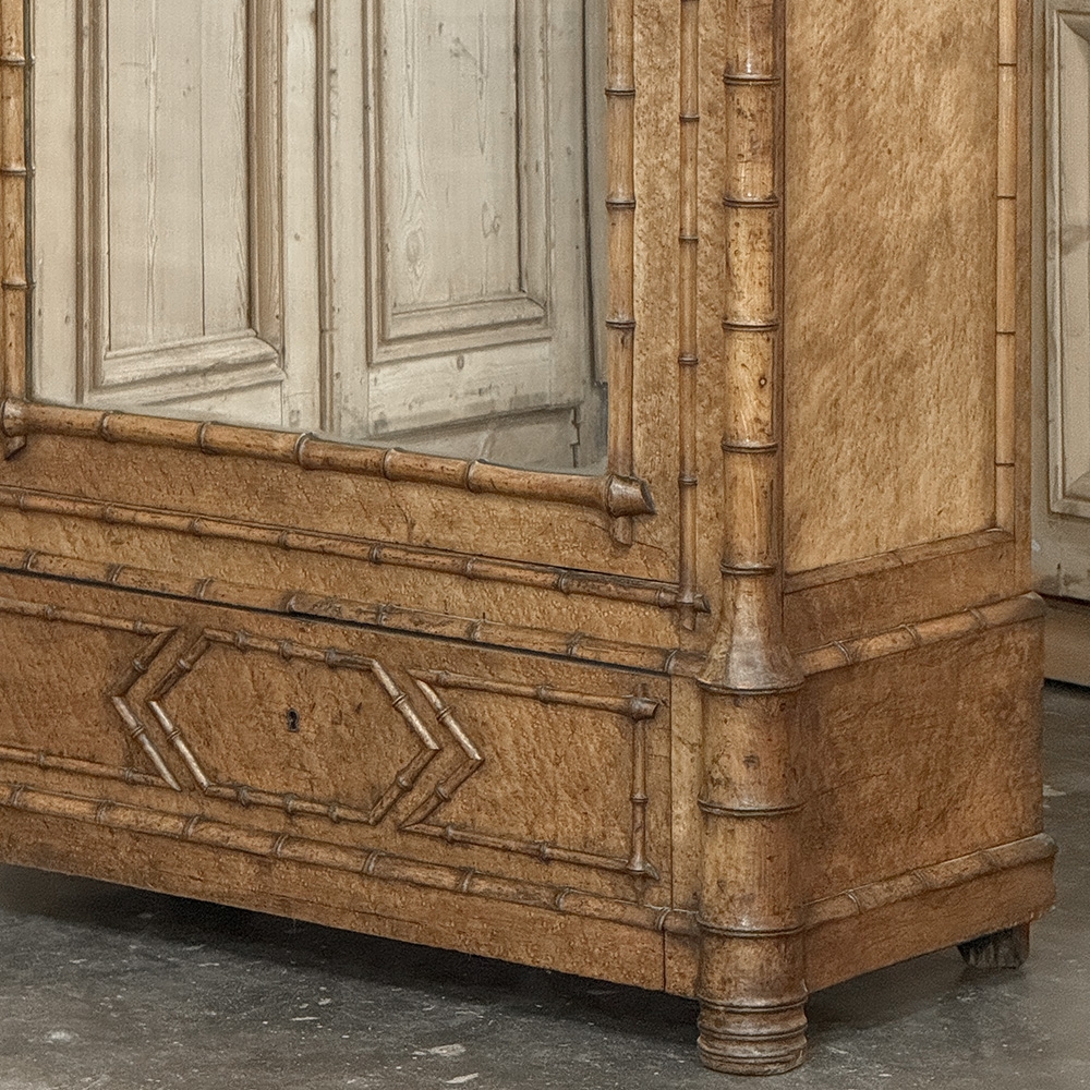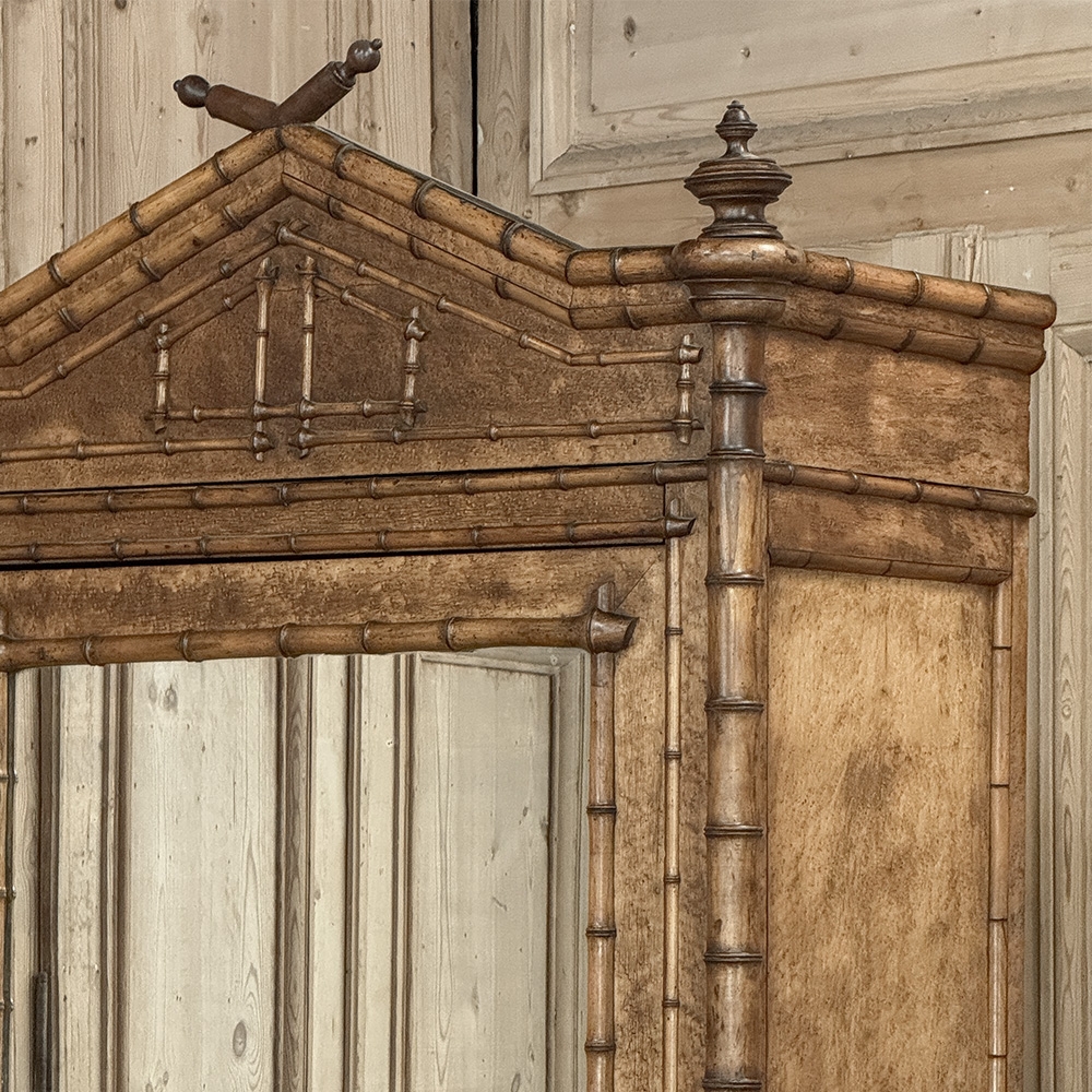 19th Century French Faux Bamboo Armoire recalls the heady days of the Belle Epoque, a period in France of enviable prosperity and burgeoning of the arts. This style was born from an insatiable fascination with what was then called The Orient, and represented the technique of simulating bamboo using indigenous old growth yellow pine and maple woods. The tailored, rectilinear architecture is enhanced at the top with crossed "bamboo" molding as one would see on the roof of a structure, flanked by turned finials. Bold "bamboo" molding pervades the design, and provides a framework for the full length mirror mounted on the door, as well as the capacious drawer below. The door opens to reveal a shelf and an interior drawer. Although tall, it will still fit in a home with 8 foot ceilings...
