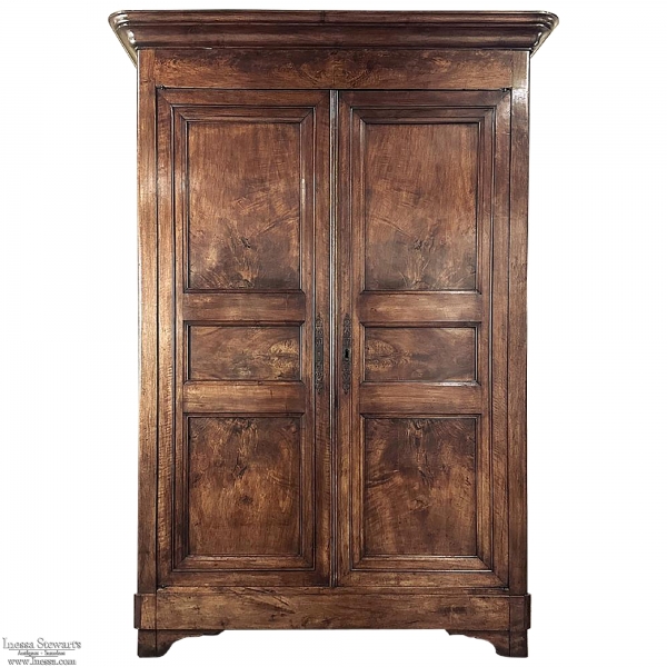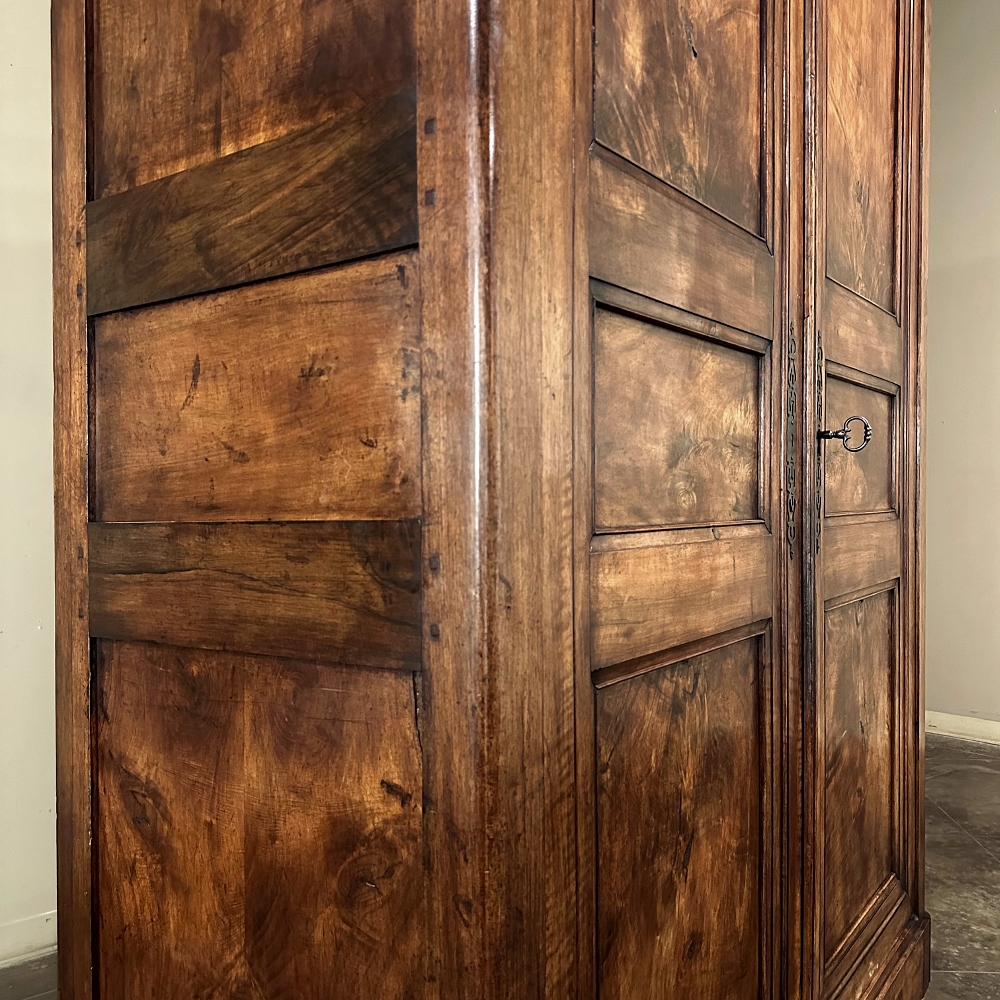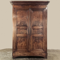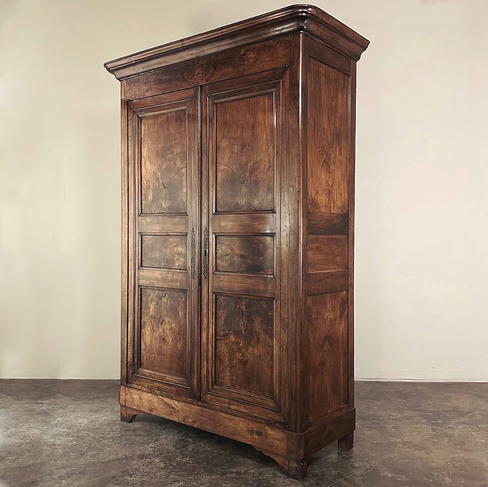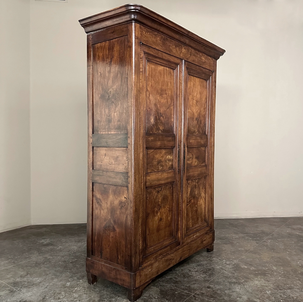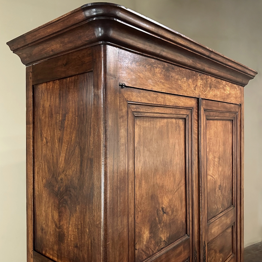 19th Century French Louis Philippe Period Walnut Armoire is a definitive example of the era, when stately, restrained architecture and furniture design rose to prominence. Perhaps to compensate for a lack of carved or mounted detail, the artisans skillfully hand-selected exquisitely figured wood such as this walnut cut from the joint between a massive branch and trunk. The various cuts were used in an expanded "bookmatch" process yielding reverse images of the fine figure for an intriguing and naturalistic visual effect. The typically bold crown molding presides over the staid casework below, consisting of three panels on each side and also three panels on each door in front. The panels are all affixed using meticulous hand-fitting and secured with pegged mortise & tenon joinery. The restrained base molding and pediment style feet complete the facade in wood, enhanced only by the addition of a brace of finely crafted steel key guards. Doors open to reveal the old original lock works on the inside, as well as three shelves making for four surfaces, with the main shelf fitted with three interior drawers accessed with brass knobs. This particular style remains popular after a century and a half due to its extraordinary compatibility with a wide variety of decors from Old World to contemporary.