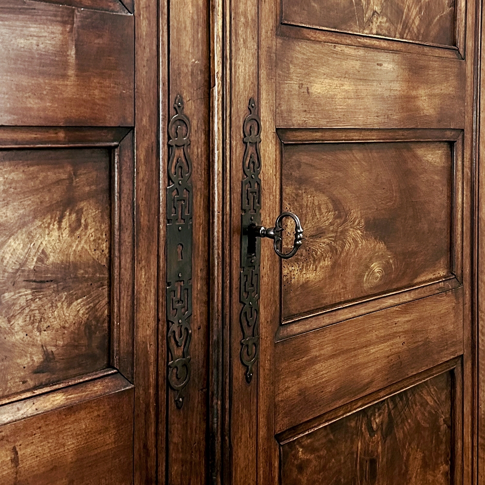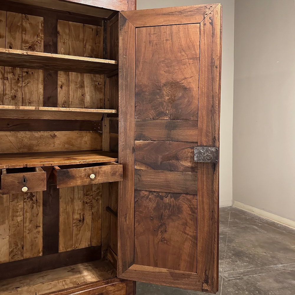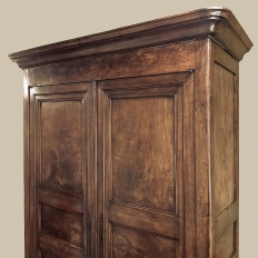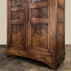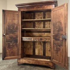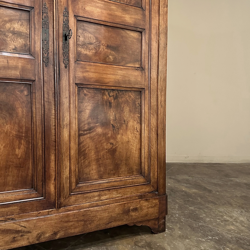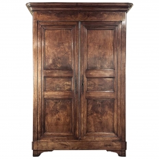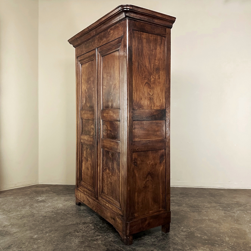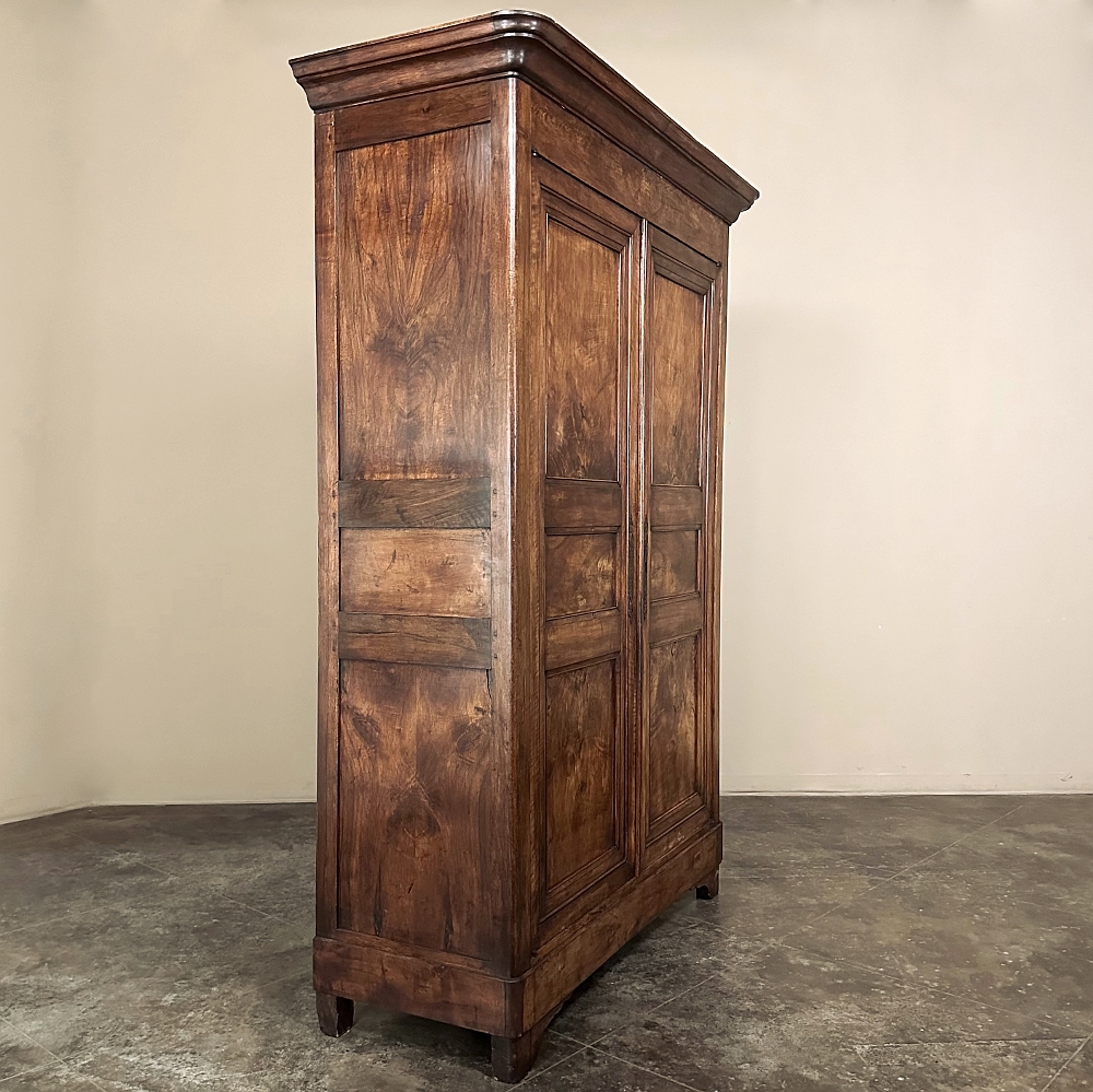 19th Century French Louis Philippe Period Walnut Armoire is a definitive example of the era, when stately, restrained architecture and furniture design rose to prominence. Perhaps to compensate for a lack of carved or mounted detail, the artisans skillfully hand-selected exquisitely figured wood such as this walnut cut from the joint between a massive branch and trunk. The various cuts were used in an expanded "bookmatch" process yielding reverse images of the fine figure for an intriguing and naturalistic visual effect. The typically bold crown molding presides over the staid casework below, consisting of three panels on each side and also three panels on each door in front. The panels are all affixed using meticulous hand-fitting and secured with pegged mortise & tenon joinery. The restrained base molding and pediment style feet complete the facade in wood, enhanced only by the addition of a brace of finely crafted steel key guards. Doors open to reveal the old original lock works on the inside, as well as three shelves making for four surfaces, with the main shelf fitted with three interior drawers accessed with brass knobs. This particular style remains popular after a century and a half due to its extraordinary compatibility with a wide variety of decors from Old World to contemporary.