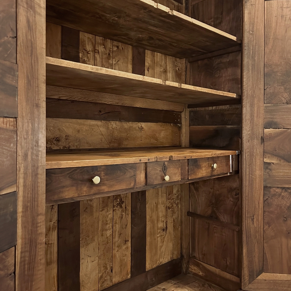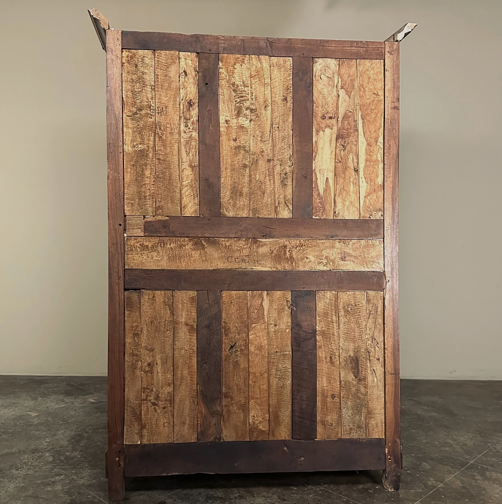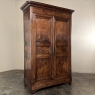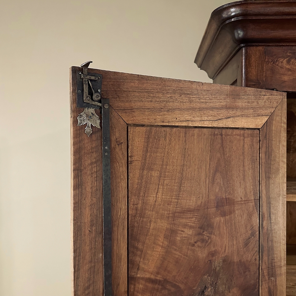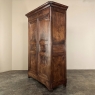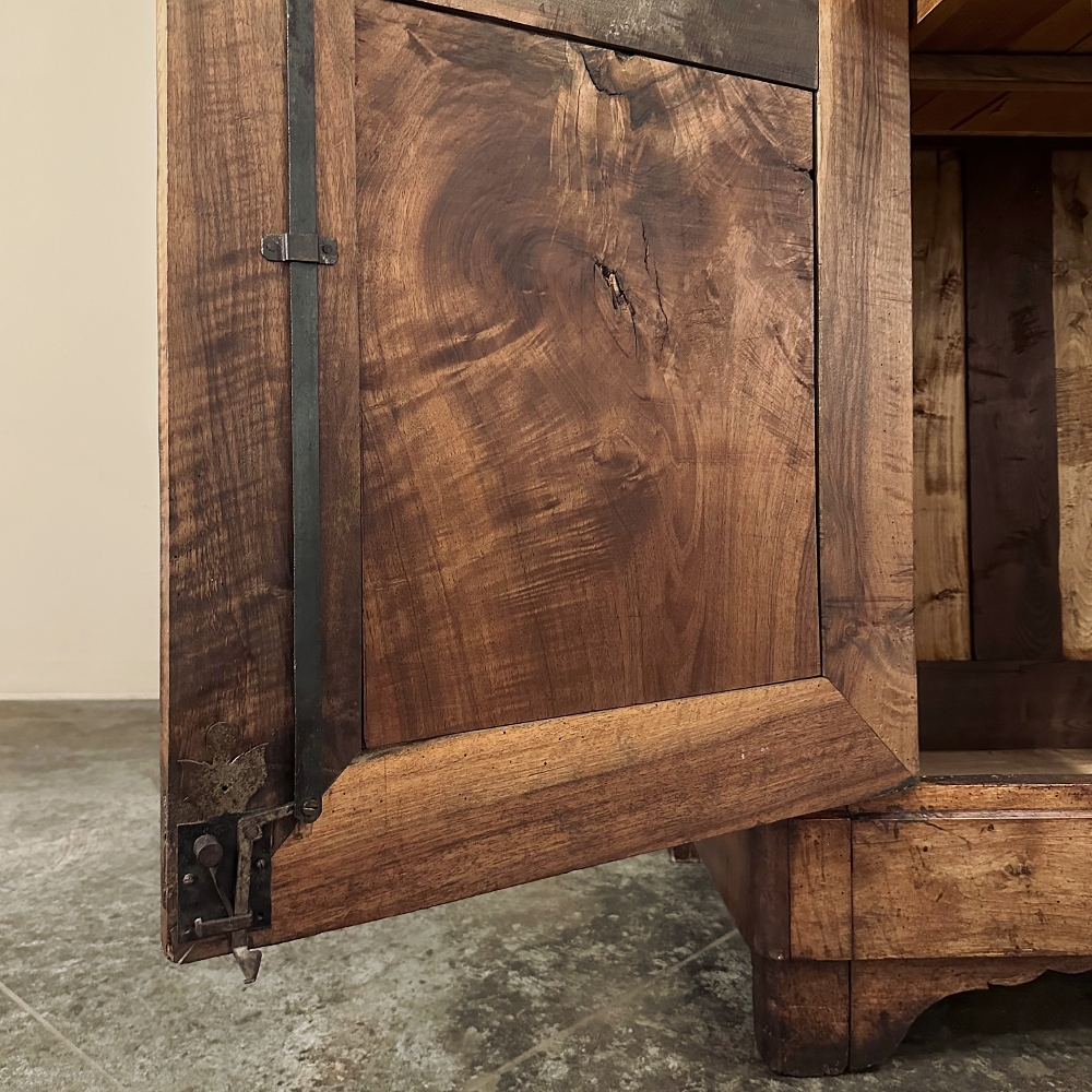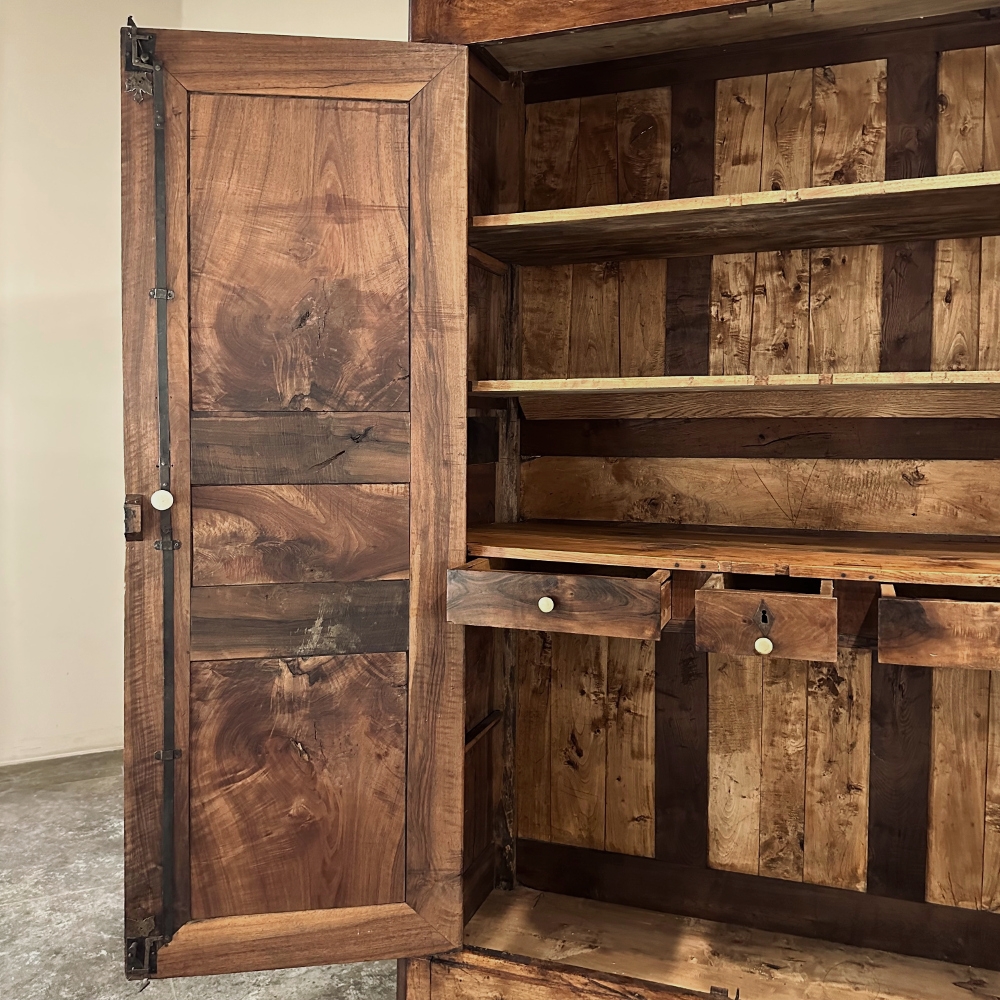 19th Century French Louis Philippe Period Walnut Armoire is a definitive example of the era, when stately, restrained architecture and furniture design rose to prominence. Perhaps to compensate for a lack of carved or mounted detail, the artisans skillfully hand-selected exquisitely figured wood such as this walnut cut from the joint between a massive branch and trunk. The various cuts were used in an expanded "bookmatch" process yielding reverse images of the fine figure for an intriguing and naturalistic visual effect. The typically bold crown molding presides over the staid casework below, consisting of three panels on each side and also three panels on each door in front. The panels are all affixed using meticulous hand-fitting and secured with pegged mortise & tenon joinery. The restrained base molding and pediment style feet complete the facade in wood, enhanced only by the addition of a brace of finely crafted steel key guards. Doors open to reveal the old original lock works on the inside, as well as three shelves making for four surfaces, with the main shelf fitted with three interior drawers accessed with brass knobs. This particular style remains popular after a century and a half due to its extraordinary compatibility with a wide variety of decors from Old World to contemporary.