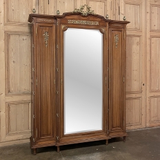 19th Century French Louis XVI Mahogany Armoire with Ormolu is an exquisite example of the excellence in design and craftsmanship found in Paris during the later years of the 1800s. Drawing from ancient Greek and Roman architecture, the neoclassical revival presented stately pieces that literally stand the test of time. Crafted from select imported mahogany, the casework features three sections, the center of which is stepped out from the main body, and which is fitted with a full length beveled mirror to provide a lovely reflection of your room. Each side door is fronted with finely molded raised panels adorned with bronze castings of floral sprays held with ribbon, but which open to reveal interior mirrors that create a tailor's mirror effect for viewing one's figure from three sides. Each section is framed by rounded corners fluted to depict bundles of wheat, banded together with bronze ties. Atop each appears a bronze pomegranate, with the finely molded crown following the casework below including the step-front center section which is also arched and centered with a stunning cast bronze sculpture depicting oak and laurel branches intertwined forming a wreath with sprays. The bonnet features another horizontal bronze casting of foliates, with accents on the corners of the doors. Open the three doors and you'll discover a completely original interior with compartmentalized adjustable shelving and three interior drawers. The entire affair is supported by tapered and fluted legs, and comes apart into component parts so it can be easily transported, carried up narrow stairs and the like, and reassembled in all its glory in your favorite room!