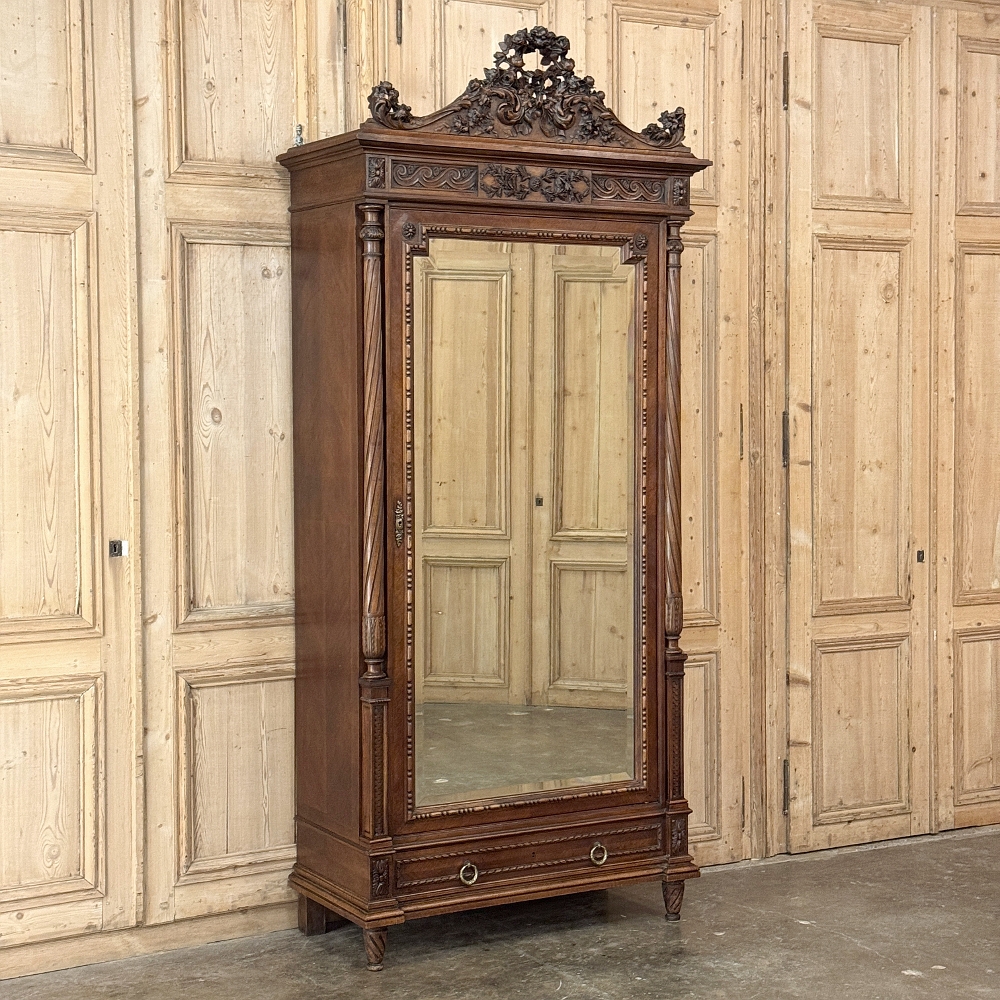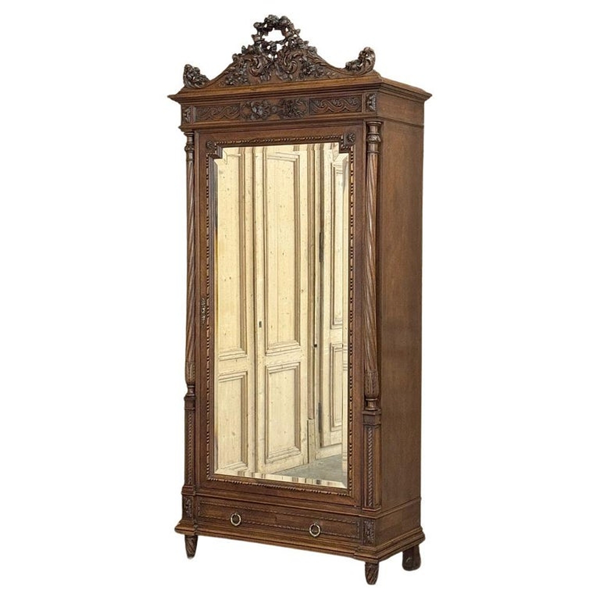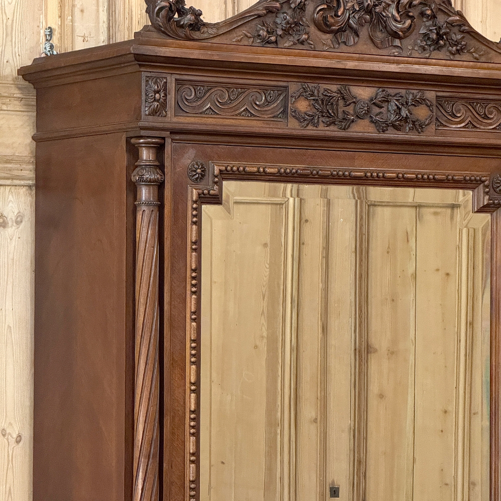 19th Century French Louis XVI Walnut Armoire rises a majestic 101 inches and is topped with an incredibly sculpted crown depicting an archer's bow form, en arbalette, centered with a wreath of roses and wildflowers held together with ribbon and accented with acanthus plumes, which continue outward to the corners with graceful flourishes.  The bonnet features bas relief carvings complementing the crown flanked by Greek wave.  Underneath, a full length hand-beveled mirror graces the door, surrounded by molding trim and rosettes and flanked on each corner by tapered, spiral fluted and carved columns leading all the way down to the full width drawer base fitted with cast brass ring pulls.  The door opens to reveal three original adjustable shelves plus a floor surface underneath which is an interior "hidden" drawer.