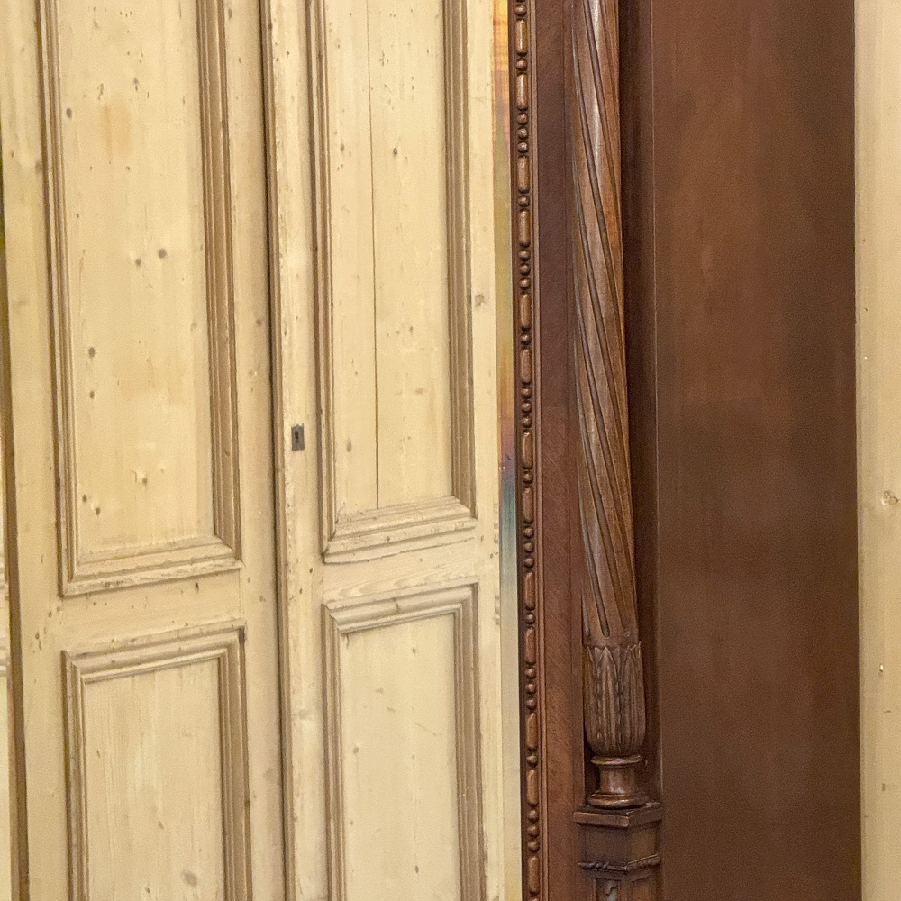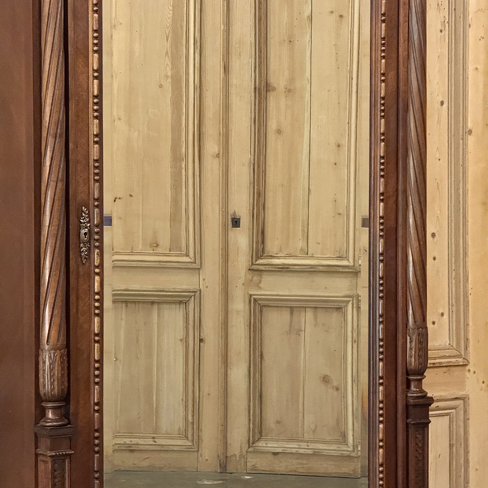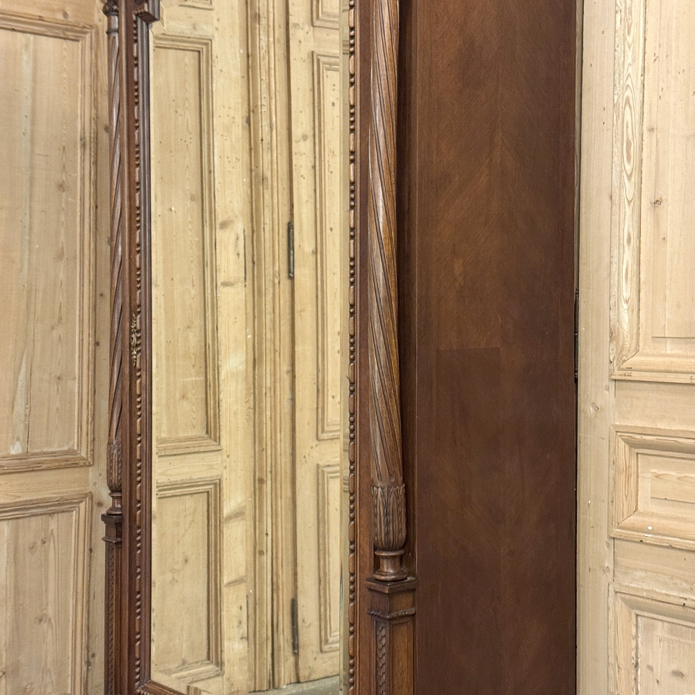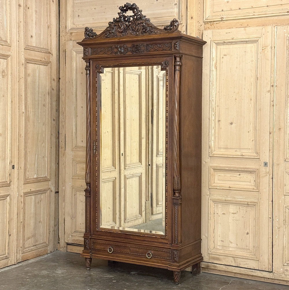 19th Century French Louis XVI Walnut Armoire rises a majestic 101 inches and is topped with an incredibly sculpted crown depicting an archer's bow form, en arbalette, centered with a wreath of roses and wildflowers held together with ribbon and accented with acanthus plumes, which continue outward to the corners with graceful flourishes.  The bonnet features bas relief carvings complementing the crown flanked by Greek wave.  Underneath, a full length hand-beveled mirror graces the door, surrounded by molding trim and rosettes and flanked on each corner by tapered, spiral fluted and carved columns leading all the way down to the full width drawer base fitted with cast brass ring pulls.  The door opens to reveal three original adjustable shelves plus a floor surface underneath which is an interior "hidden" drawer.