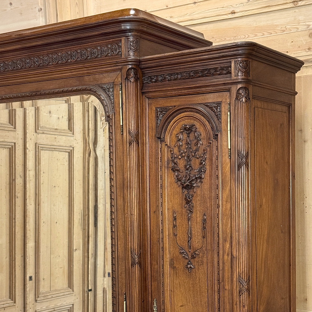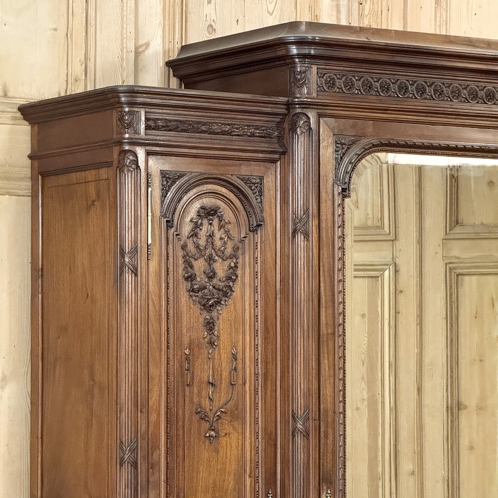 19th Century French Louis XVI Walnut Triple Armoire was crafted from select French walnut and finely cast brass, the armoire boasts a full-length hand-beveled dressing mirror that also provides a lovely reflection of your room.  The center door and side doors all open thanks to externally mounted brass barrel hinges to allow easy access to the shelves and interior drawers, the former of which are fully adjustable.  The stately architecture of the set represents a timeless beauty inspired by the ancient Greek and Roman master architects, coupled with embellishment that is distinctively French, with floral garlands, ribbon, laurel wreaths and banded wheat.  The side panels are particularly stunning with carved detail from top to bottom.  Bold molding and trim details abound in the design, which also features a step-front center section.  Truly a Belle Epoque masterpiece!