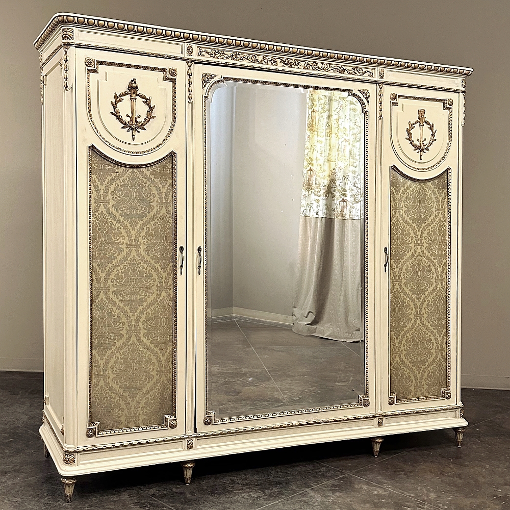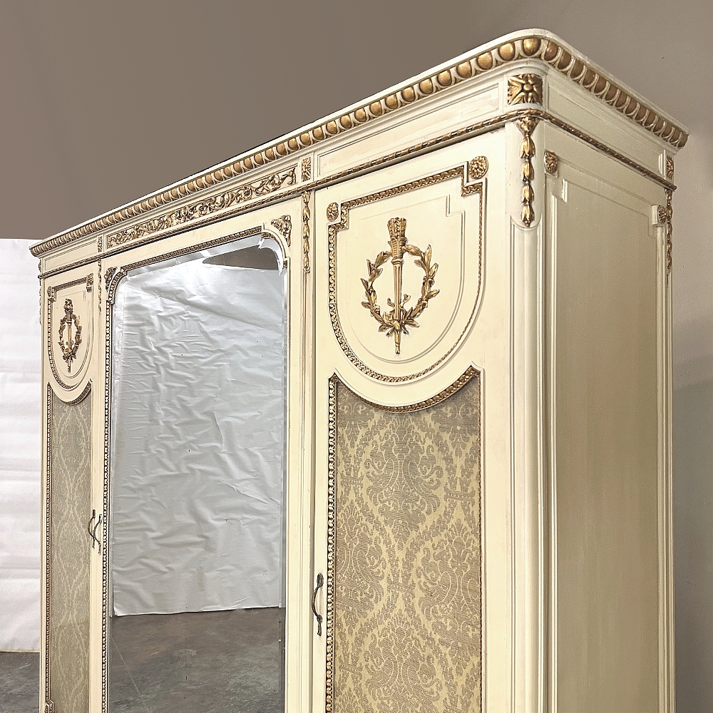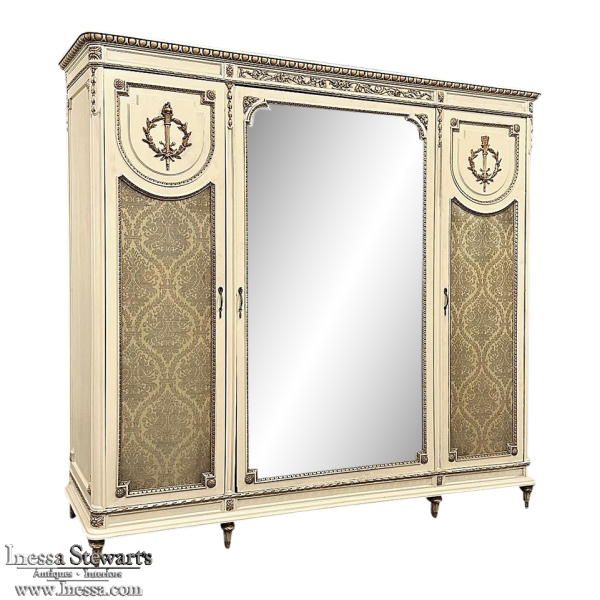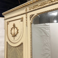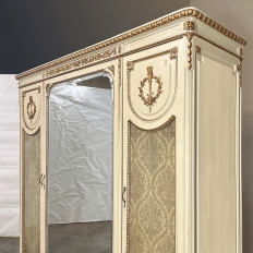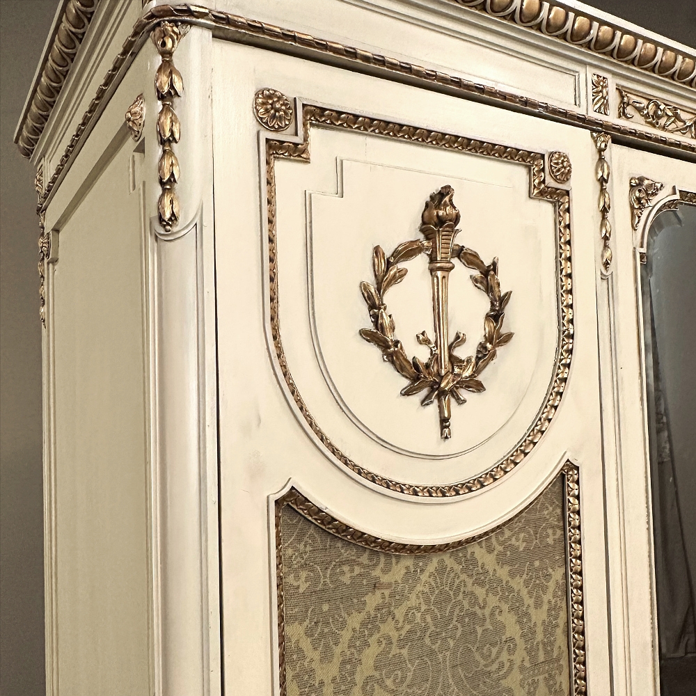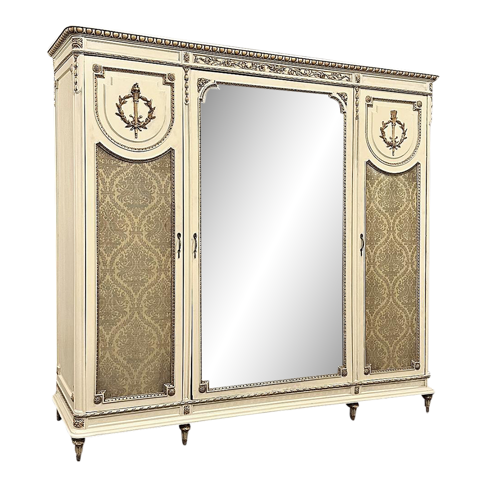 SaleAntique Italian Neoclassical Painted Triple Armoire is a splendid expression of the classical style that dates back three thousand years! Even the French embraced the style during the reign of Louis XVI, but in reality it never really went out of fashion. This example, with rectilinear architecture features beautifully carved molded detail appearing in abundance spanning the crown and upper portion as well as the base. Motifs include spiral ribbon, egg and tongue & dart, with a particularly resplendent vine relief across the bonnet that is amazingly intricate, and accented with rosettes. On each side door in its own shield shaped framework appears an exquisite torchere set in a concentric wheat wreath and accented at each upper corner with a rosette. Under each is an upholstered panel, which allows one to choose a coordinating fabric for that panel if so desired. Support is provided by tapered and carved legs, and all the carving has been lovingly accentuated with gold highlighting to contrast it against the sedate almond color of the paneling and woodwork. All three doors open to reveal cavernous storage, with a hanging rod in the center compartment, and adjustable shelves on the side compartments for an amazing availability of customizable space, all accessed with brass handles. As an added bonus, the center door houses a full length beveled mirror perfect for enhancing ambient light and providing a lovely reflection of your room, with a surprise on the inside~ each side door has a full length mirror on its interior face, so that when the two outside cabinets doors are open, leaving the center door closed, one produces a tailor's dressing mirror effect!