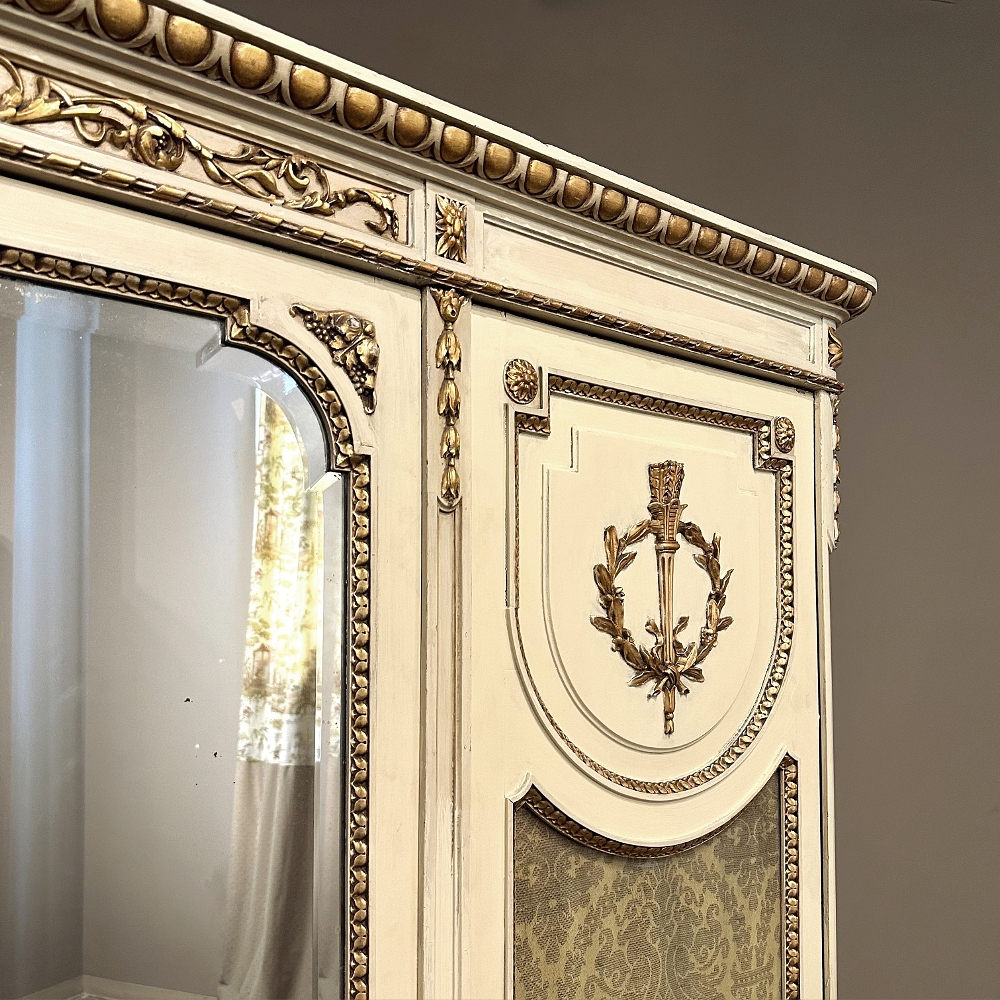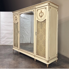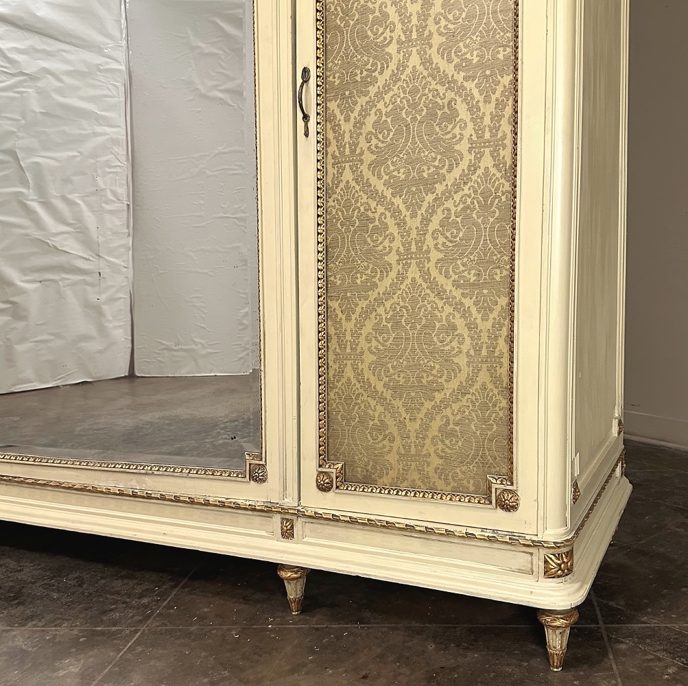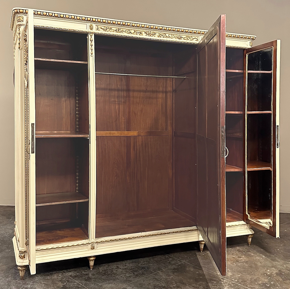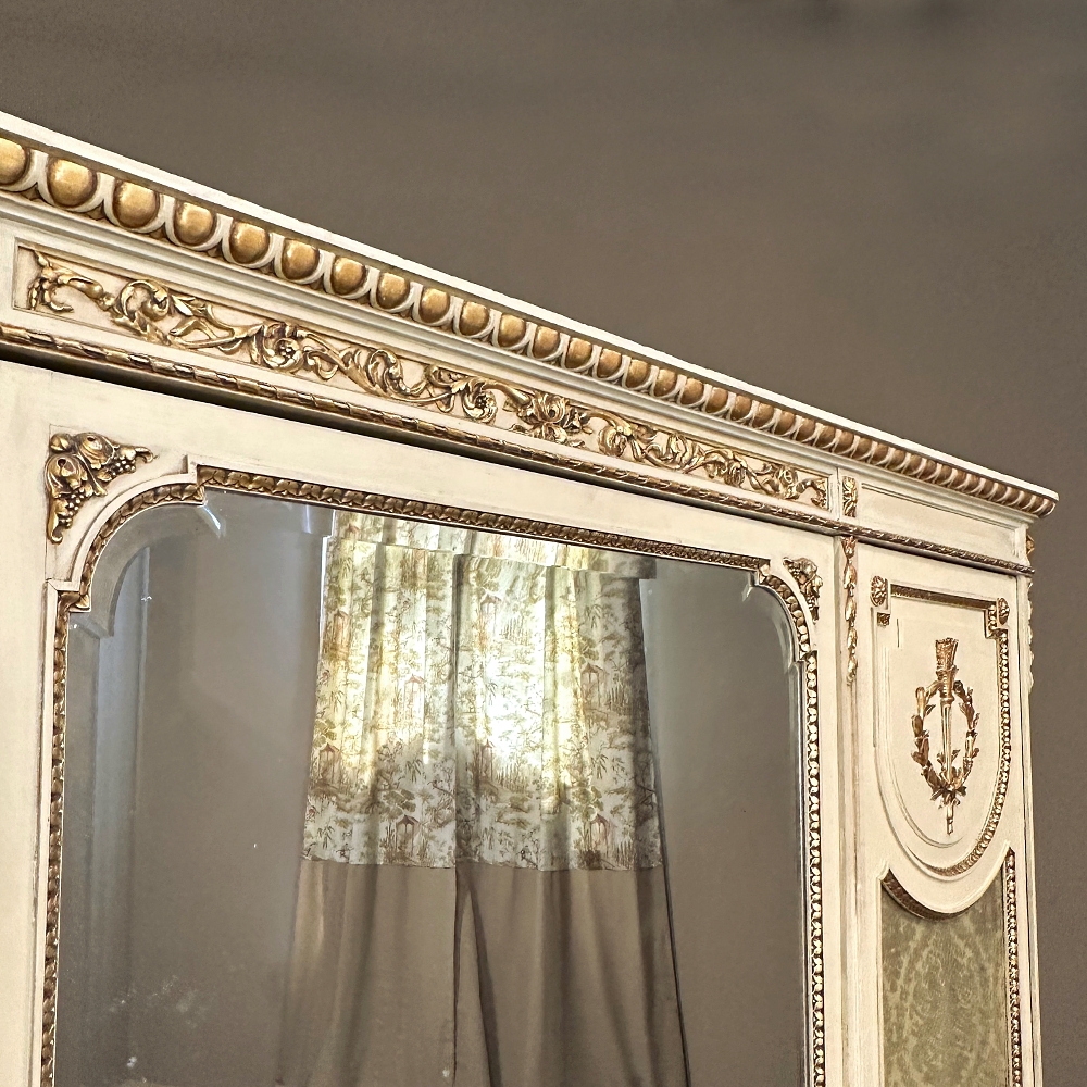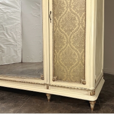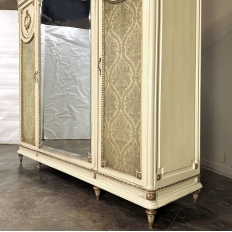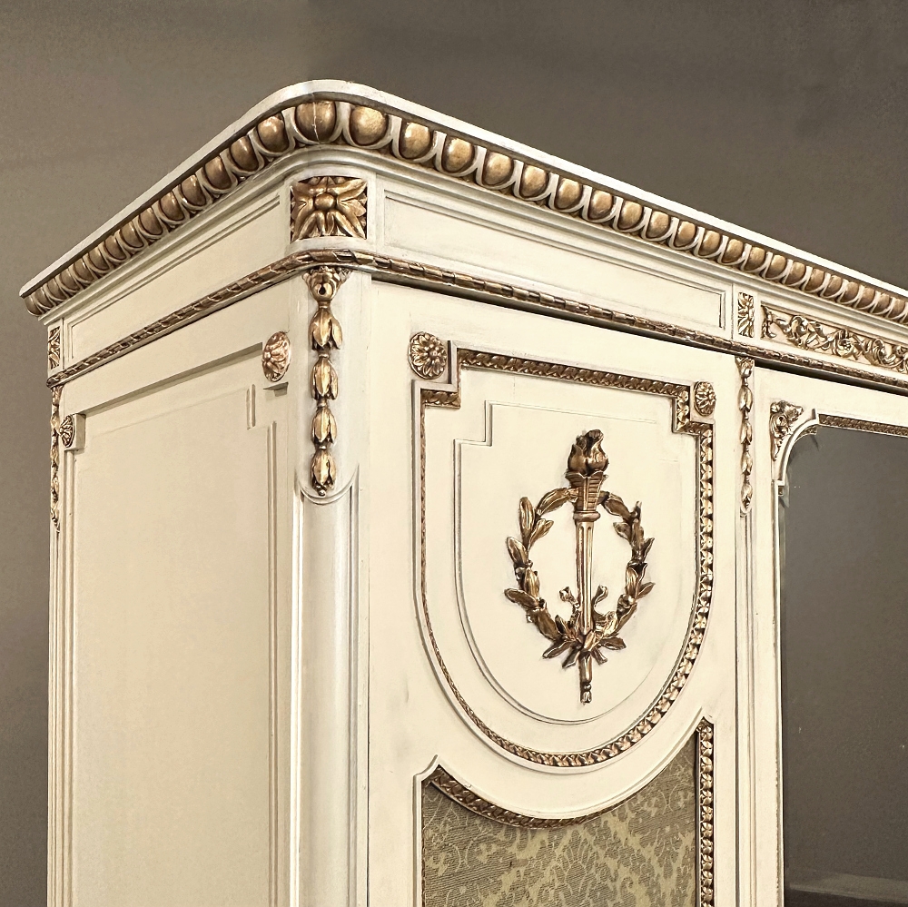 SaleAntique Italian Neoclassical Painted Triple Armoire is a splendid expression of the classical style that dates back three thousand years! Even the French embraced the style during the reign of Louis XVI, but in reality it never really went out of fashion. This example, with rectilinear architecture features beautifully carved molded detail appearing in abundance spanning the crown and upper portion as well as the base. Motifs include spiral ribbon, egg and tongue & dart, with a particularly resplendent vine relief across the bonnet that is amazingly intricate, and accented with rosettes. On each side door in its own shield shaped framework appears an exquisite torchere set in a concentric wheat wreath and accented at each upper corner with a rosette. Under each is an upholstered panel, which allows one to choose a coordinating fabric for that panel if so desired. Support is provided by tapered and carved legs, and all the carving has been lovingly accentuated with gold highlighting to contrast it against the sedate almond color of the paneling and woodwork. All three doors open to reveal cavernous storage, with a hanging rod in the center compartment, and adjustable shelves on the side compartments for an amazing availability of customizable space, all accessed with brass handles. As an added bonus, the center door houses a full length beveled mirror perfect for enhancing ambient light and providing a lovely reflection of your room, with a surprise on the inside~ each side door has a full length mirror on its interior face, so that when the two outside cabinets doors are open, leaving the center door closed, one produces a tailor's dressing mirror effect!
