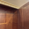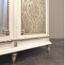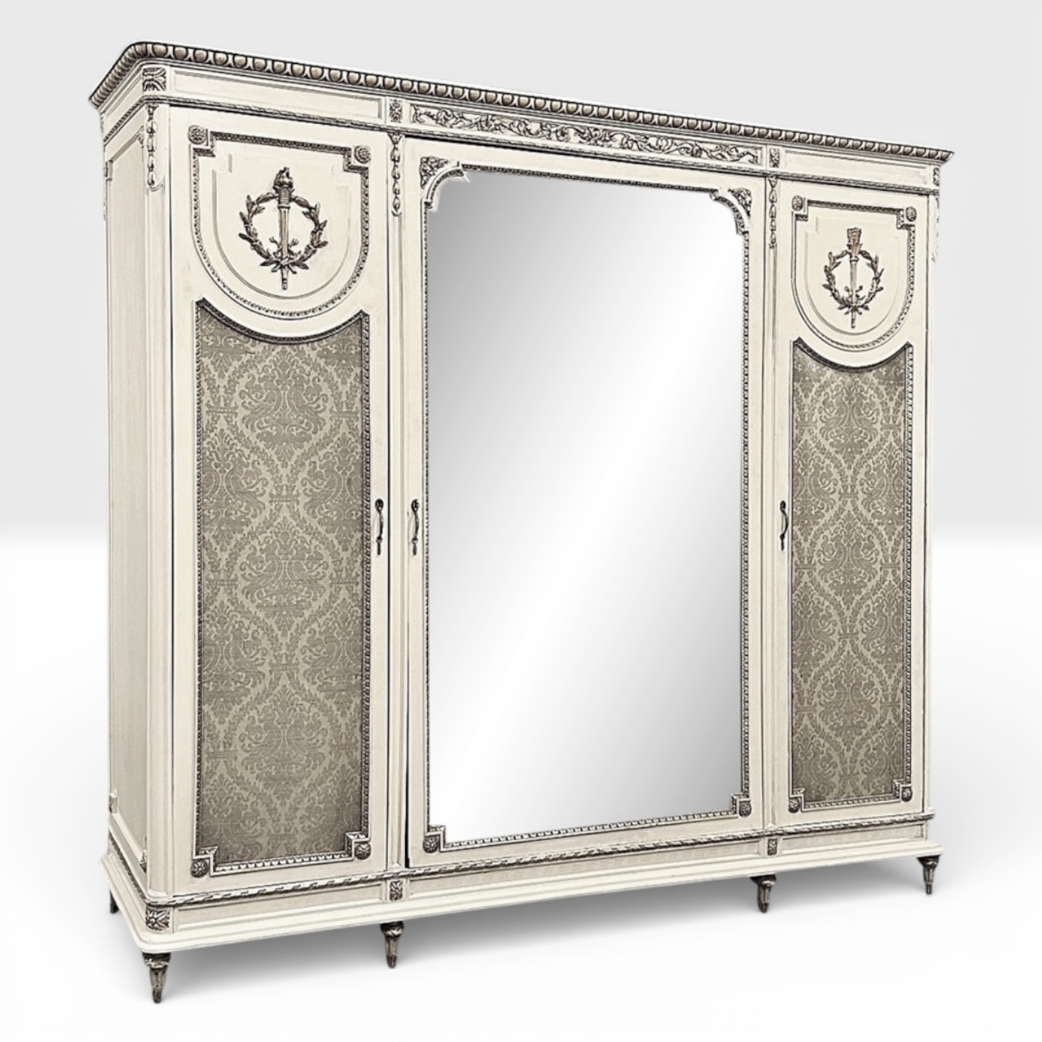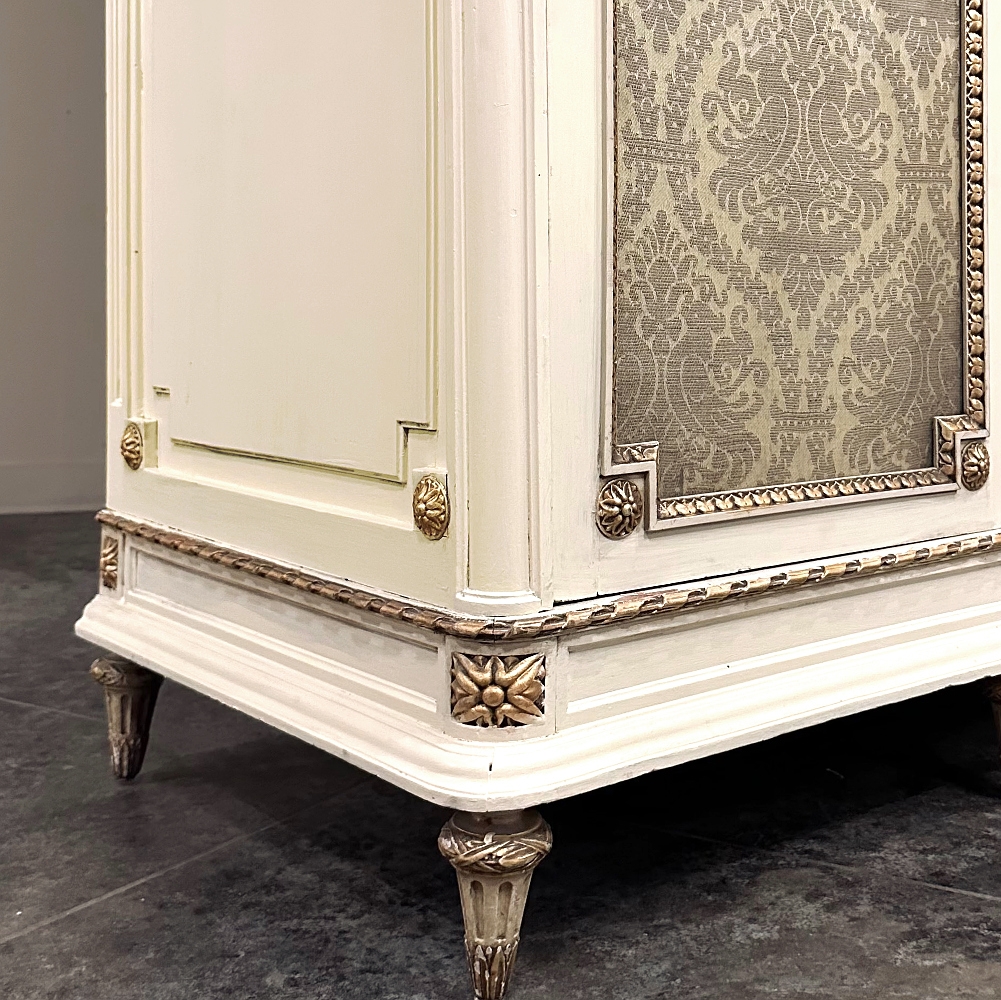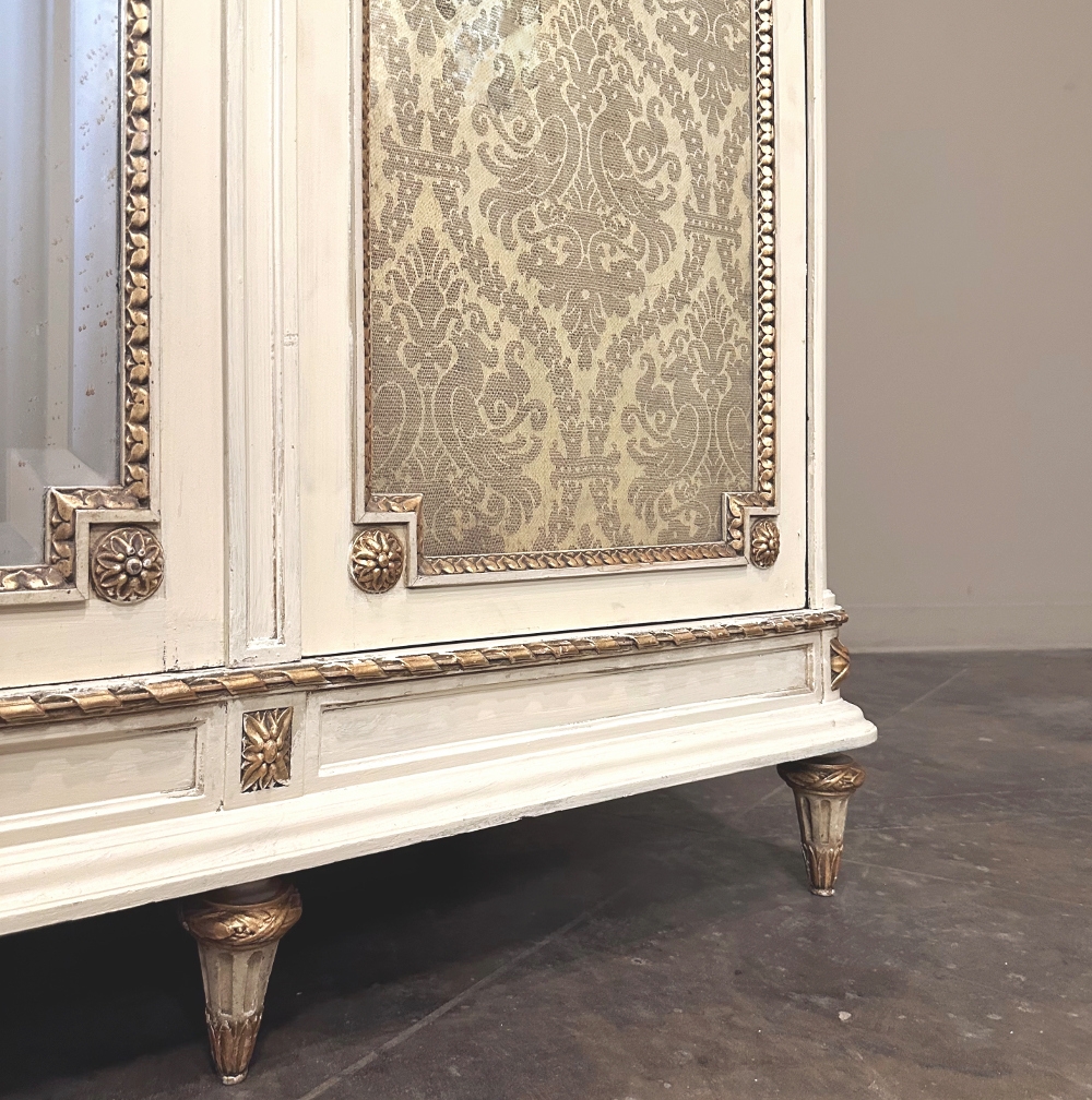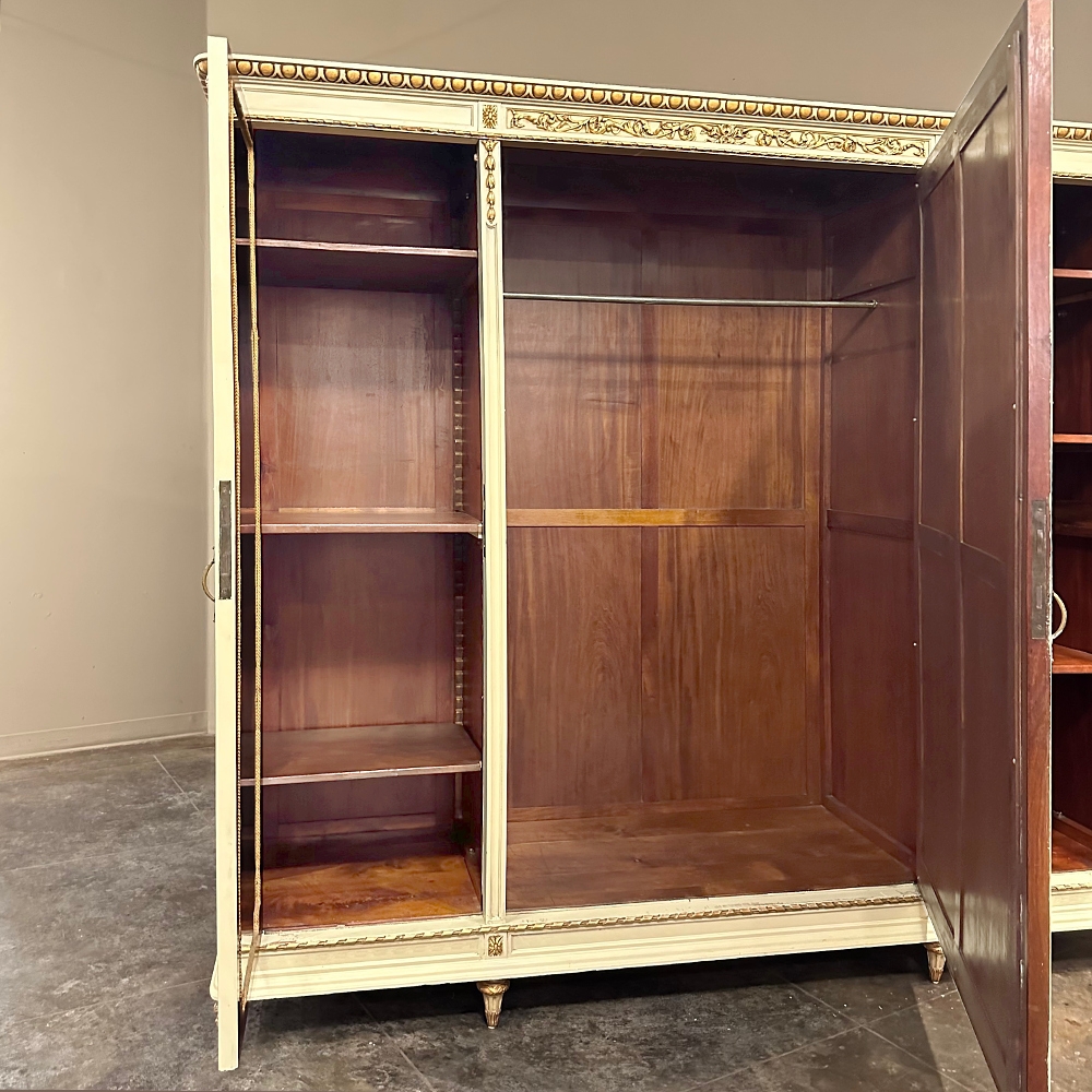 SaleAntique Italian Neoclassical Painted Triple Armoire is a splendid expression of the classical style that dates back three thousand years! Even the French embraced the style during the reign of Louis XVI, but in reality it never really went out of fashion. This example, with rectilinear architecture features beautifully carved molded detail appearing in abundance spanning the crown and upper portion as well as the base. Motifs include spiral ribbon, egg and tongue & dart, with a particularly resplendent vine relief across the bonnet that is amazingly intricate, and accented with rosettes. On each side door in its own shield shaped framework appears an exquisite torchere set in a concentric wheat wreath and accented at each upper corner with a rosette. Under each is an upholstered panel, which allows one to choose a coordinating fabric for that panel if so desired. Support is provided by tapered and carved legs, and all the carving has been lovingly accentuated with gold highlighting to contrast it against the sedate almond color of the paneling and woodwork. All three doors open to reveal cavernous storage, with a hanging rod in the center compartment, and adjustable shelves on the side compartments for an amazing availability of customizable space, all accessed with brass handles. As an added bonus, the center door houses a full length beveled mirror perfect for enhancing ambient light and providing a lovely reflection of your room, with a surprise on the inside~ each side door has a full length mirror on its interior face, so that when the two outside cabinets doors are open, leaving the center door closed, one produces a tailor's dressing mirror effect!