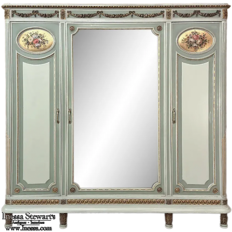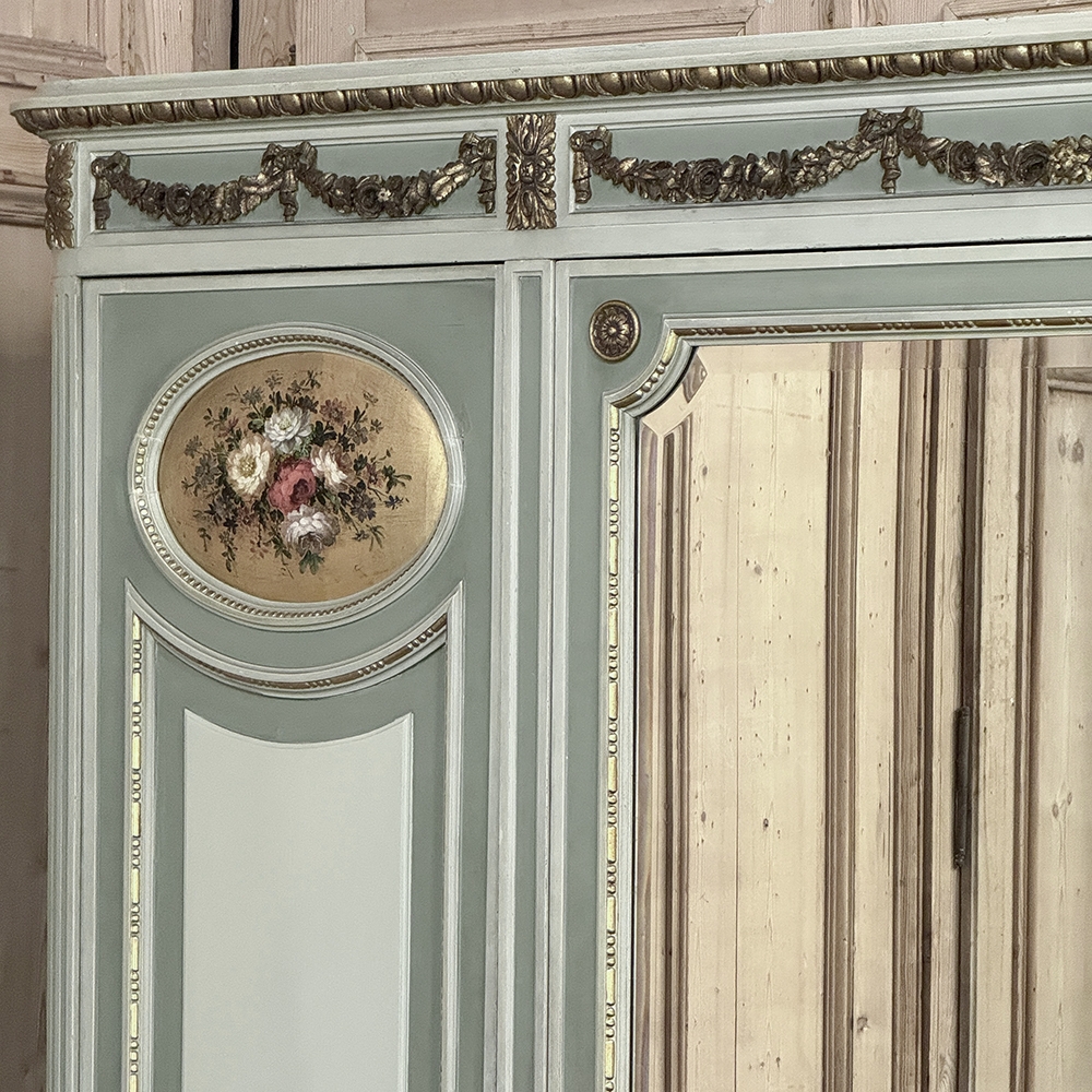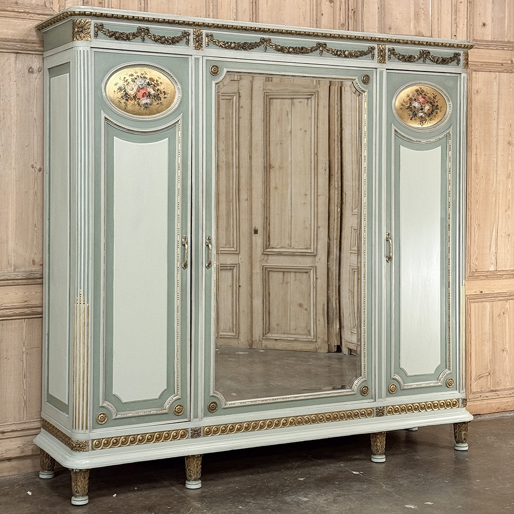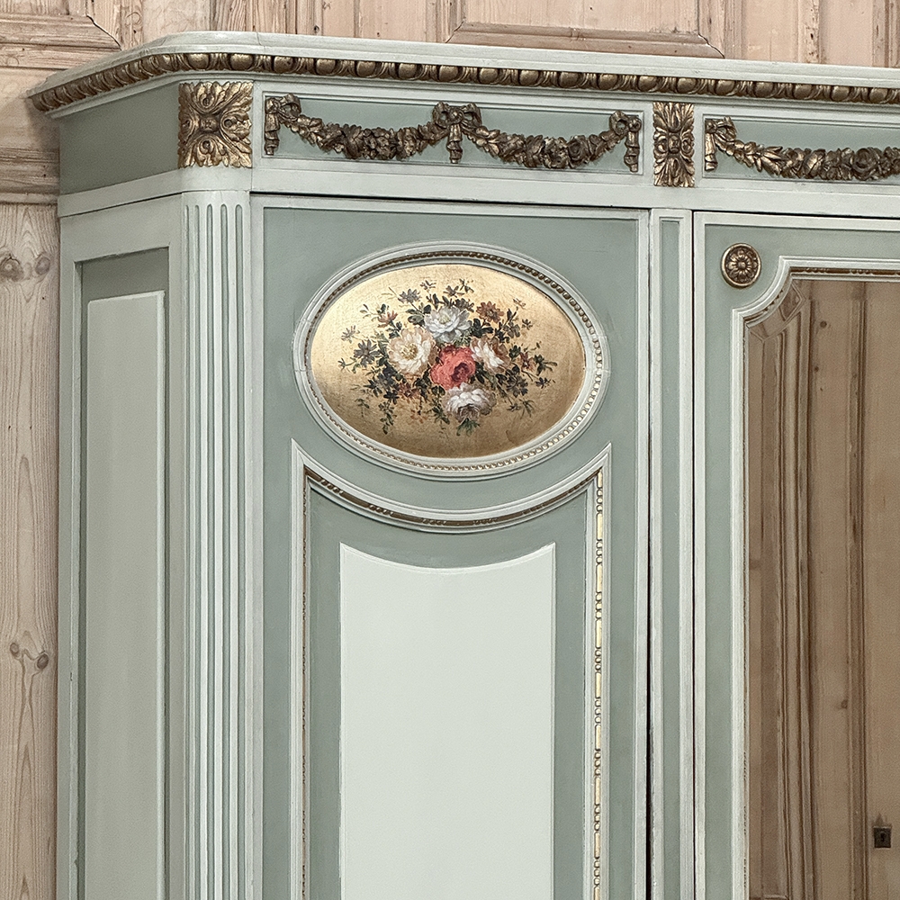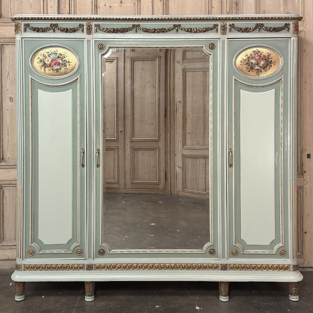 Antique Italian Neoclassical Painted Triple Armoire is a magnificent expression of the timeless style introduced to the world by the ancient Greeks and Romans, and still celebrated today! The tailored, rectilinear form is enhanced by bold molding details from the crown to the base, with enhancements carved right into the wood then highlighted in gold. Across the top appear floral swags with ribbon, accented with rosettes in between and on the corners. To offset the crown, the base has the same design of rosettes framing the molding, but with Greek wave depicted in the motif. In between, three large doors provide access to the cavernous interior, which opens to reveal shelving, interior drawers, and hanging space. The center door is fitted with a full length beveled mirror, while the side doors are graced with molded panels topped by oval cameos painted with vibrant floral bouquets on gold backgrounds. The casework is embellished with a two-toned pastel green and subtle olive toned painted finish. Tapered legs carved with acanthus plumes highlighted in gold provide support.