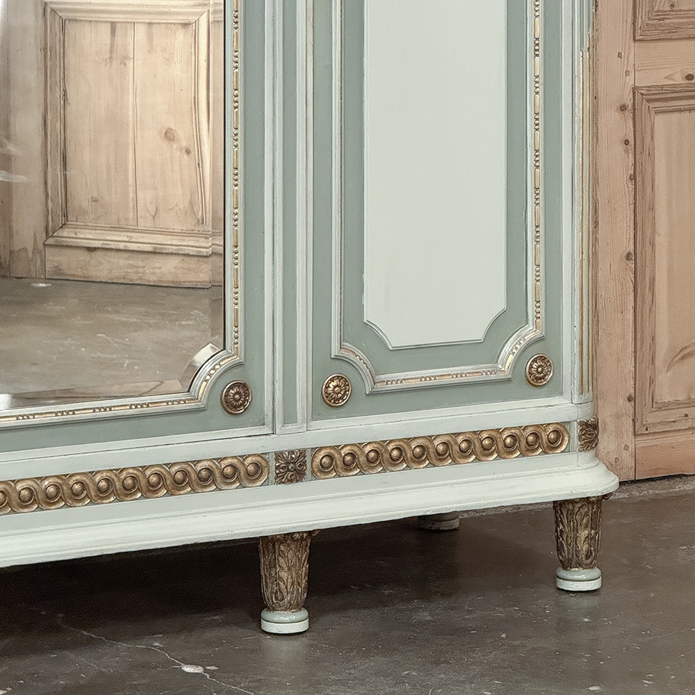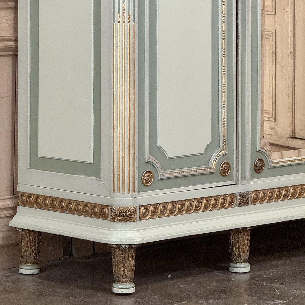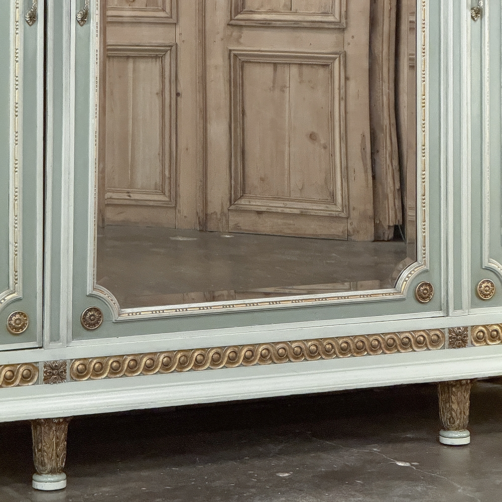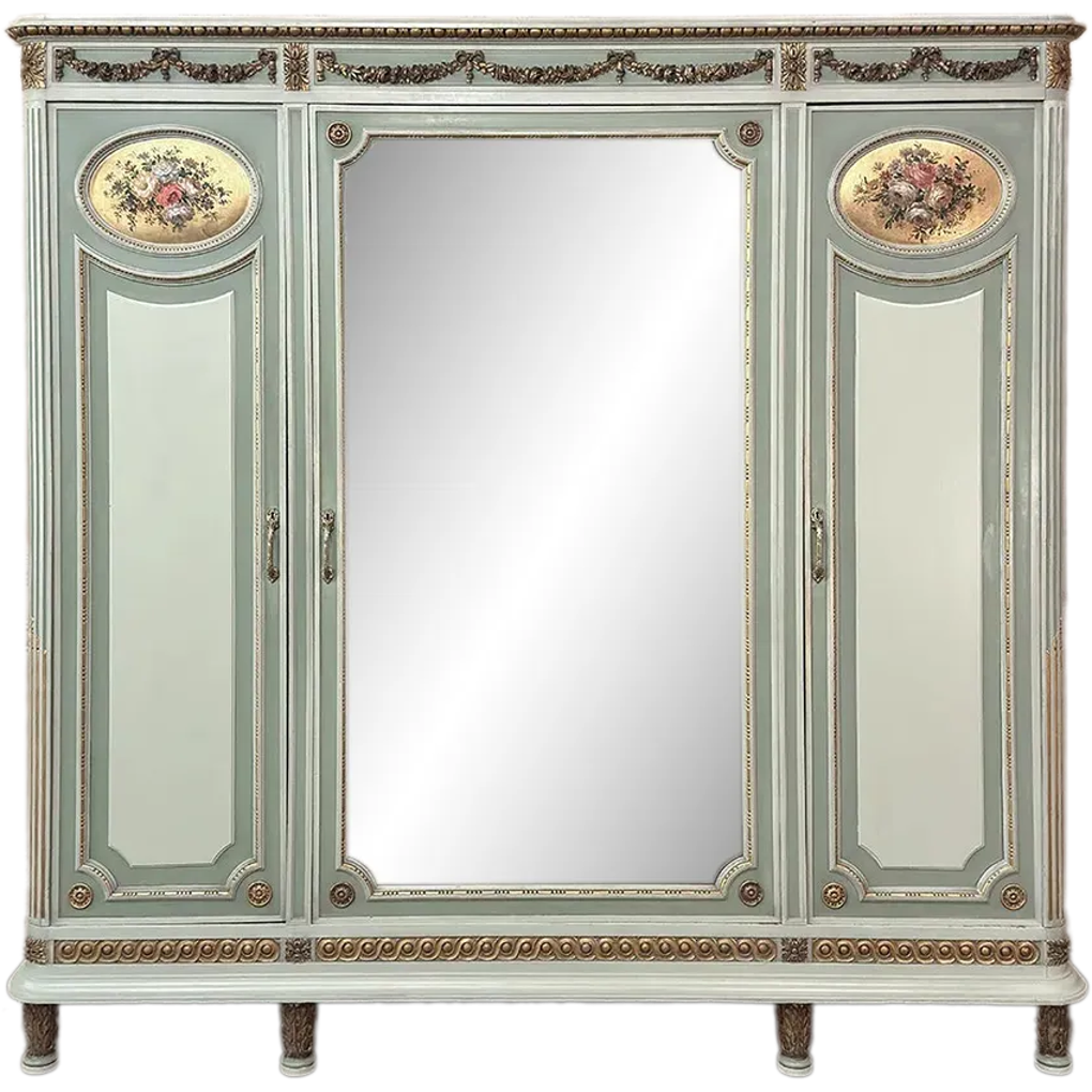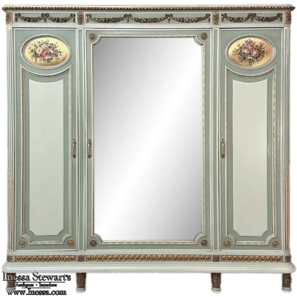 Antique Italian Neoclassical Painted Triple Armoire is a magnificent expression of the timeless style introduced to the world by the ancient Greeks and Romans, and still celebrated today! The tailored, rectilinear form is enhanced by bold molding details from the crown to the base, with enhancements carved right into the wood then highlighted in gold. Across the top appear floral swags with ribbon, accented with rosettes in between and on the corners. To offset the crown, the base has the same design of rosettes framing the molding, but with Greek wave depicted in the motif. In between, three large doors provide access to the cavernous interior, which opens to reveal shelving, interior drawers, and hanging space. The center door is fitted with a full length beveled mirror, while the side doors are graced with molded panels topped by oval cameos painted with vibrant floral bouquets on gold backgrounds. The casework is embellished with a two-toned pastel green and subtle olive toned painted finish. Tapered legs carved with acanthus plumes highlighted in gold provide support.