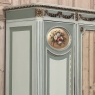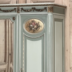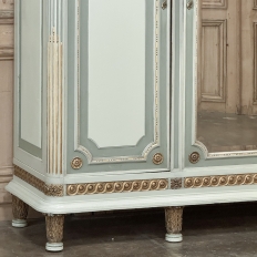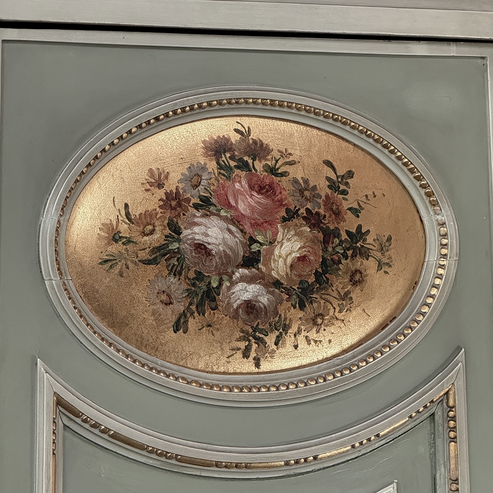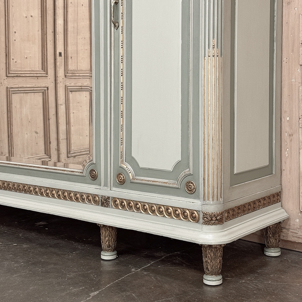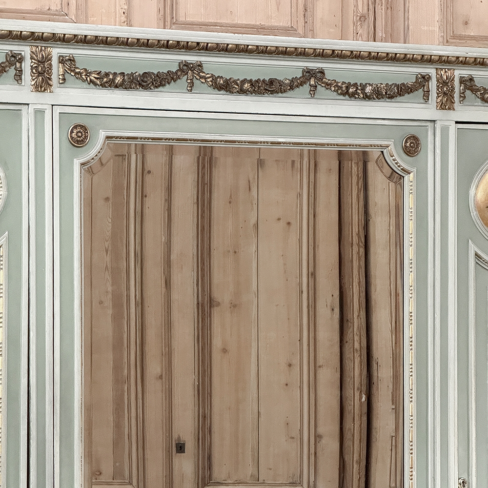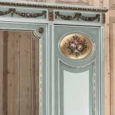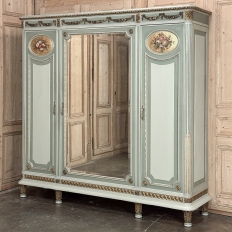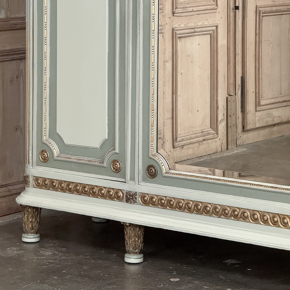 Antique Italian Neoclassical Painted Triple Armoire is a magnificent expression of the timeless style introduced to the world by the ancient Greeks and Romans, and still celebrated today! The tailored, rectilinear form is enhanced by bold molding details from the crown to the base, with enhancements carved right into the wood then highlighted in gold. Across the top appear floral swags with ribbon, accented with rosettes in between and on the corners. To offset the crown, the base has the same design of rosettes framing the molding, but with Greek wave depicted in the motif. In between, three large doors provide access to the cavernous interior, which opens to reveal shelving, interior drawers, and hanging space. The center door is fitted with a full length beveled mirror, while the side doors are graced with molded panels topped by oval cameos painted with vibrant floral bouquets on gold backgrounds. The casework is embellished with a two-toned pastel green and subtle olive toned painted finish. Tapered legs carved with acanthus plumes highlighted in gold provide support.