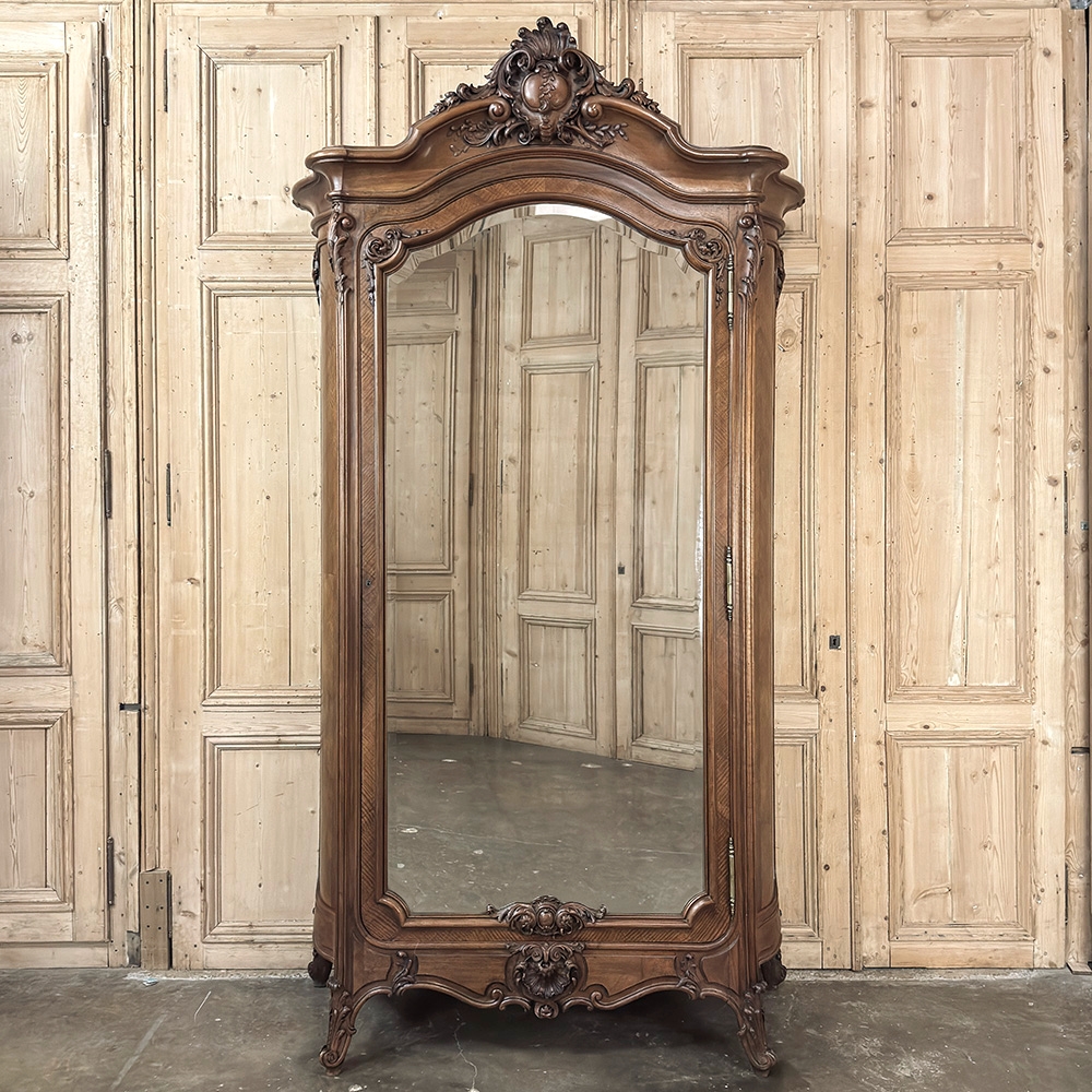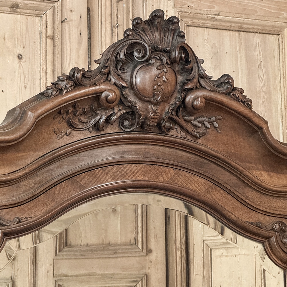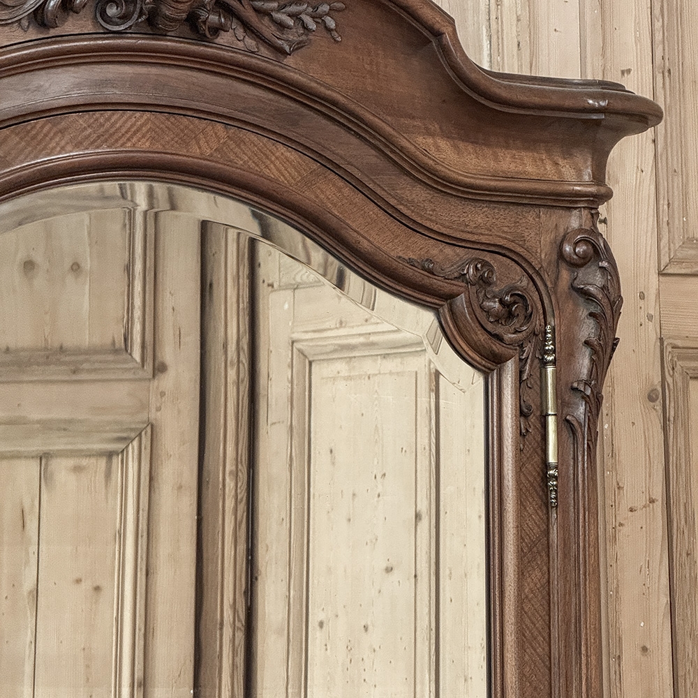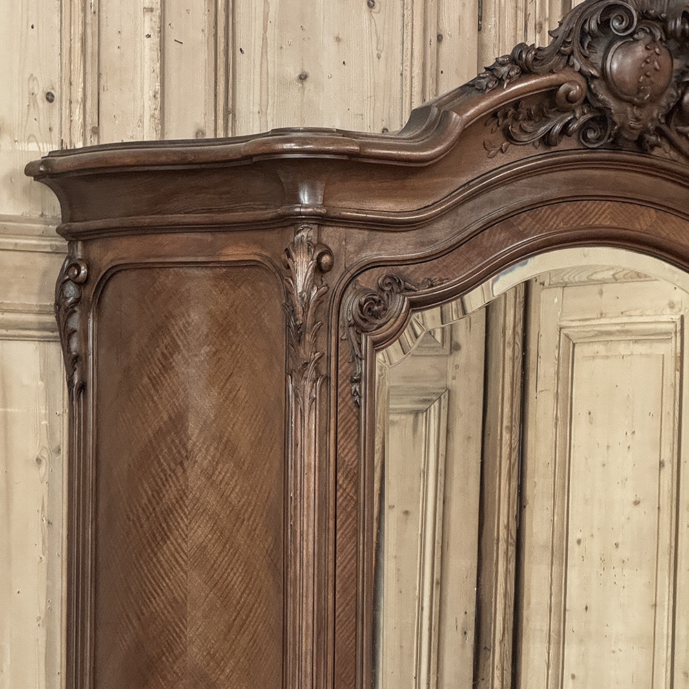 Belle Epoque French Walnut Serpentine Armoire from Paris ca.1900 is an exhilarating example of the finest Old World craftsmanship by a noted maker ~ Maison Lalande Devouge Raus & Cie, located at 54 Rue de Charenton in Paris. The firm produced magnificent works of the cabinetmaker's art at the end of the 19th century and into the first decade or two of the 20th century. Utilizing exquisite hand-select French walnut, the artisans crafted an intricately contoured architecture that includes a bold arched crown, undulating apron and serpentine sides. Bold molding with carved detail abounds in the design, but is most notable at the very peak, where an heraldic crest overlooks the entire piece, lavished with carved shell, floral and foliates. The single full length door is fitted with a full mirror, and the frame is meticulously molded and carved with the bevel of the glass following each intricacy. Door opens wide on brass barrel hinges to reveal a spacious interior with fully adjustable shelf and interior drawer.
