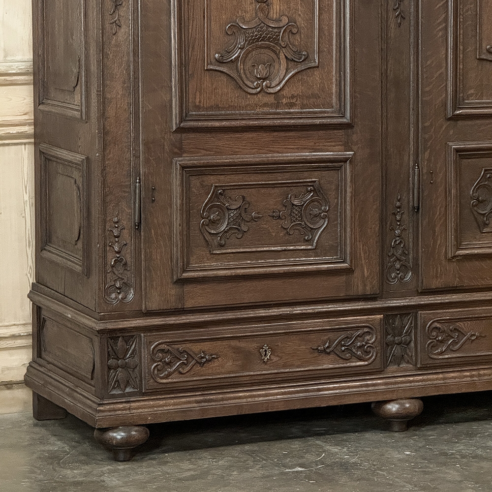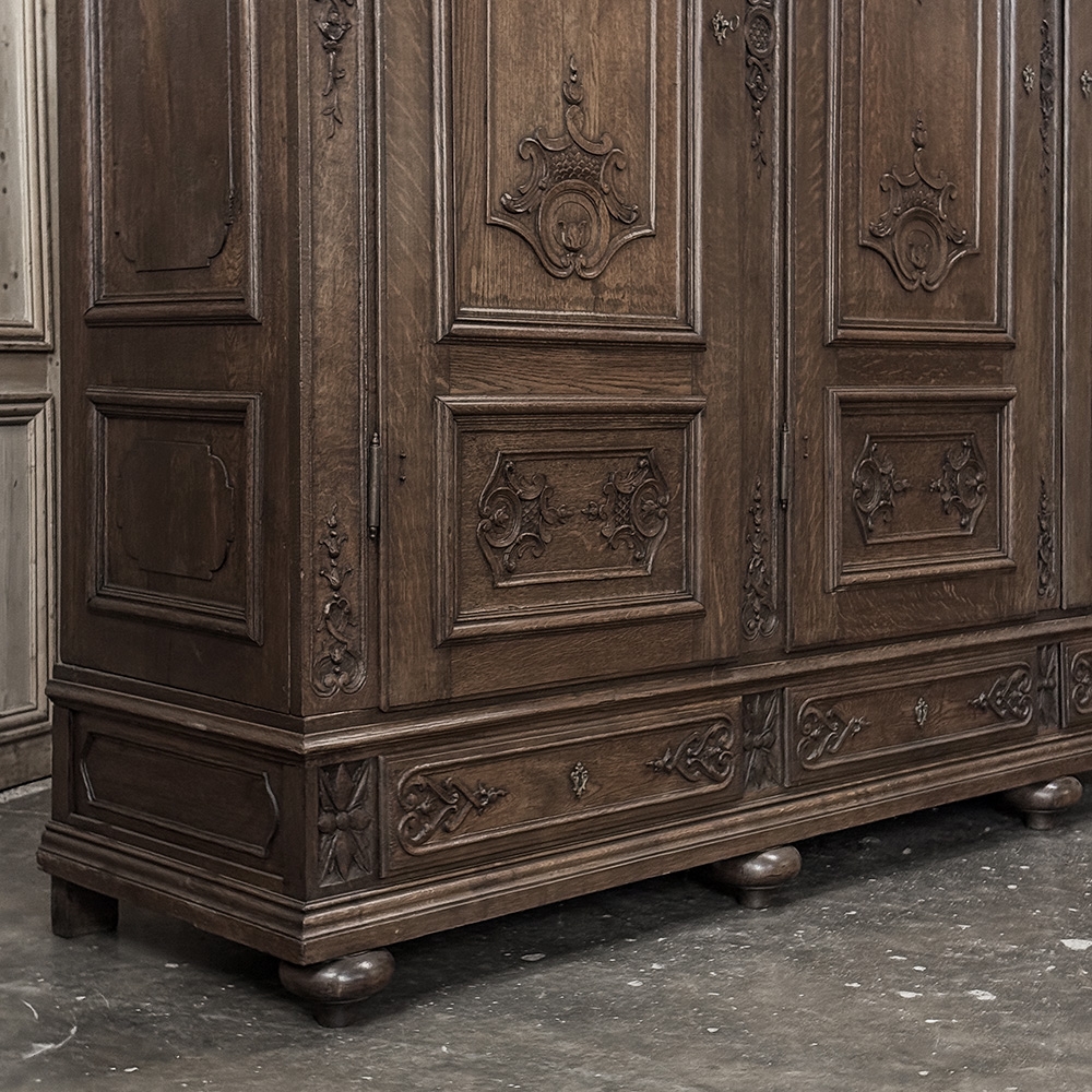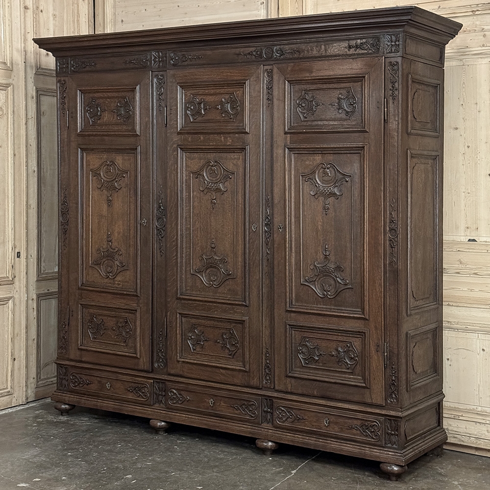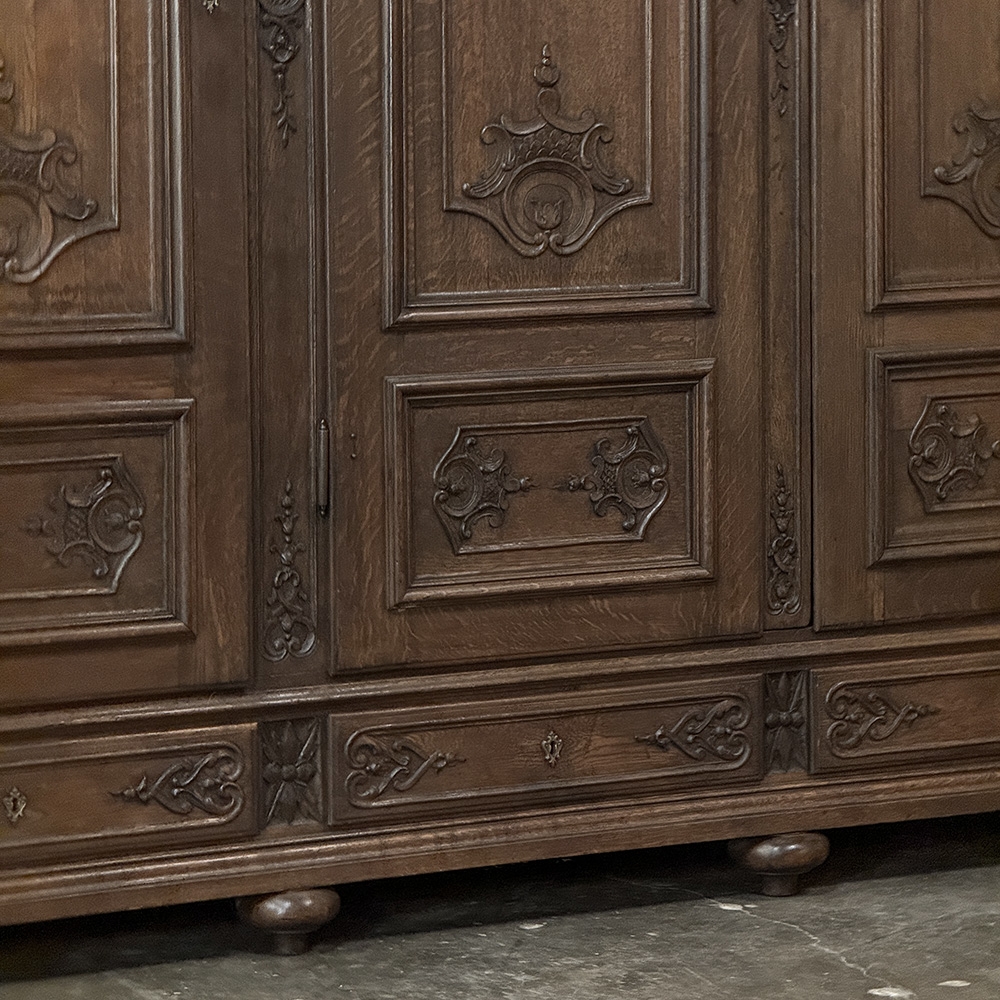 Grand 19th Century Louis XIV Liegeoise Triple Armoire is an amazing work of the cabinetmaker's art! Hand-crafted and sculpted from solid old-growth oak, the masters of Liege created a triple door access, with the right two doors opening opposite to each other to create in essence a two door armoire on the right side, accompanied by a one door armoire with shelving on the left side. Bold molding detail defines the classic rectilinear architecture, with each door and each side panel consisting of three raised panels. The nine panels on the doors are also finely carved with Baroque-inspired motifs, and enhanced further with carved detail on the surrounding frameworks. Three exterior drawers also were designed into the cabinet along the baseboard, which is supported by turned bun feet. The perfect choice for abundant storage in timeless style!