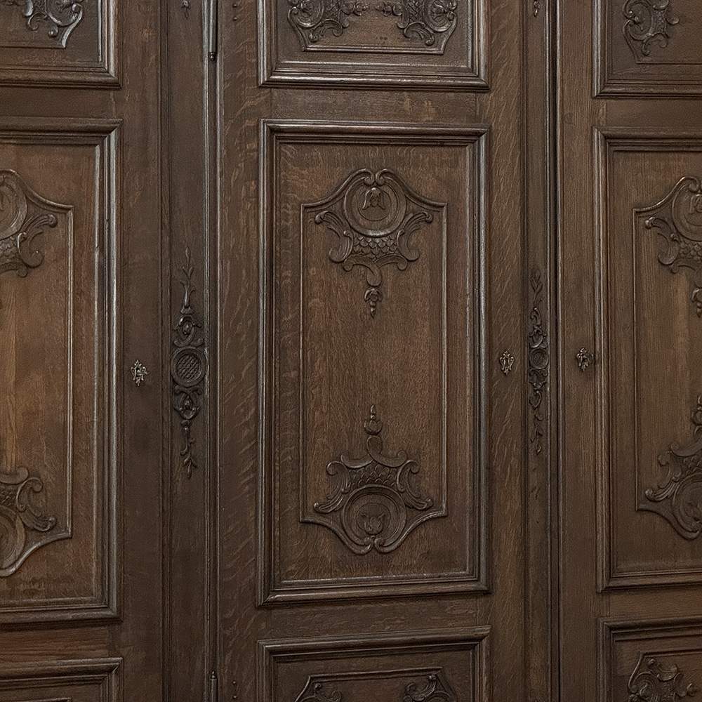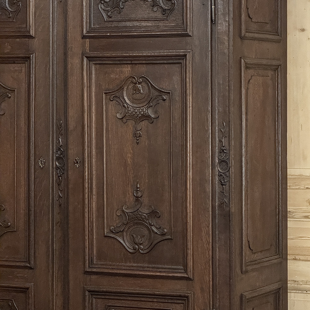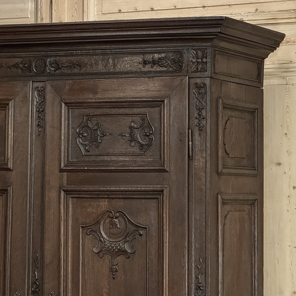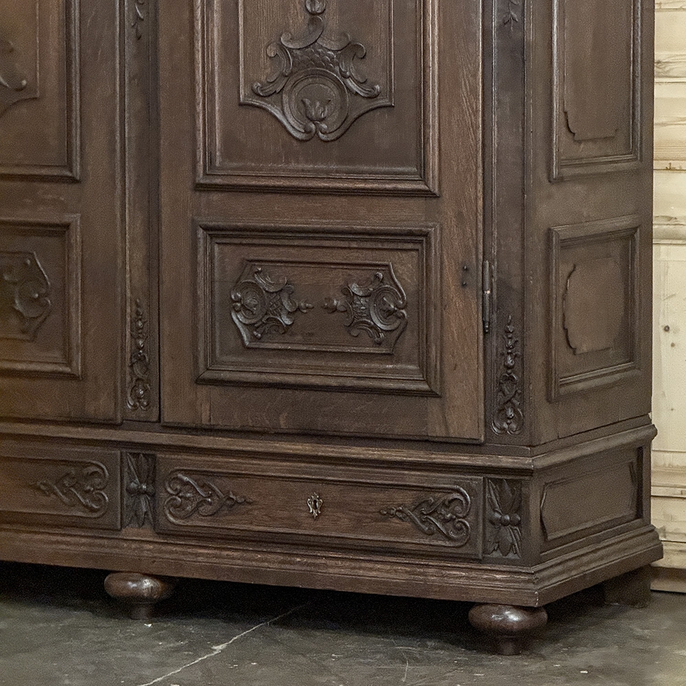 Grand 19th Century Louis XIV Liegeoise Triple Armoire is an amazing work of the cabinetmaker's art! Hand-crafted and sculpted from solid old-growth oak, the masters of Liege created a triple door access, with the right two doors opening opposite to each other to create in essence a two door armoire on the right side, accompanied by a one door armoire with shelving on the left side. Bold molding detail defines the classic rectilinear architecture, with each door and each side panel consisting of three raised panels. The nine panels on the doors are also finely carved with Baroque-inspired motifs, and enhanced further with carved detail on the surrounding frameworks. Three exterior drawers also were designed into the cabinet along the baseboard, which is supported by turned bun feet. The perfect choice for abundant storage in timeless style!